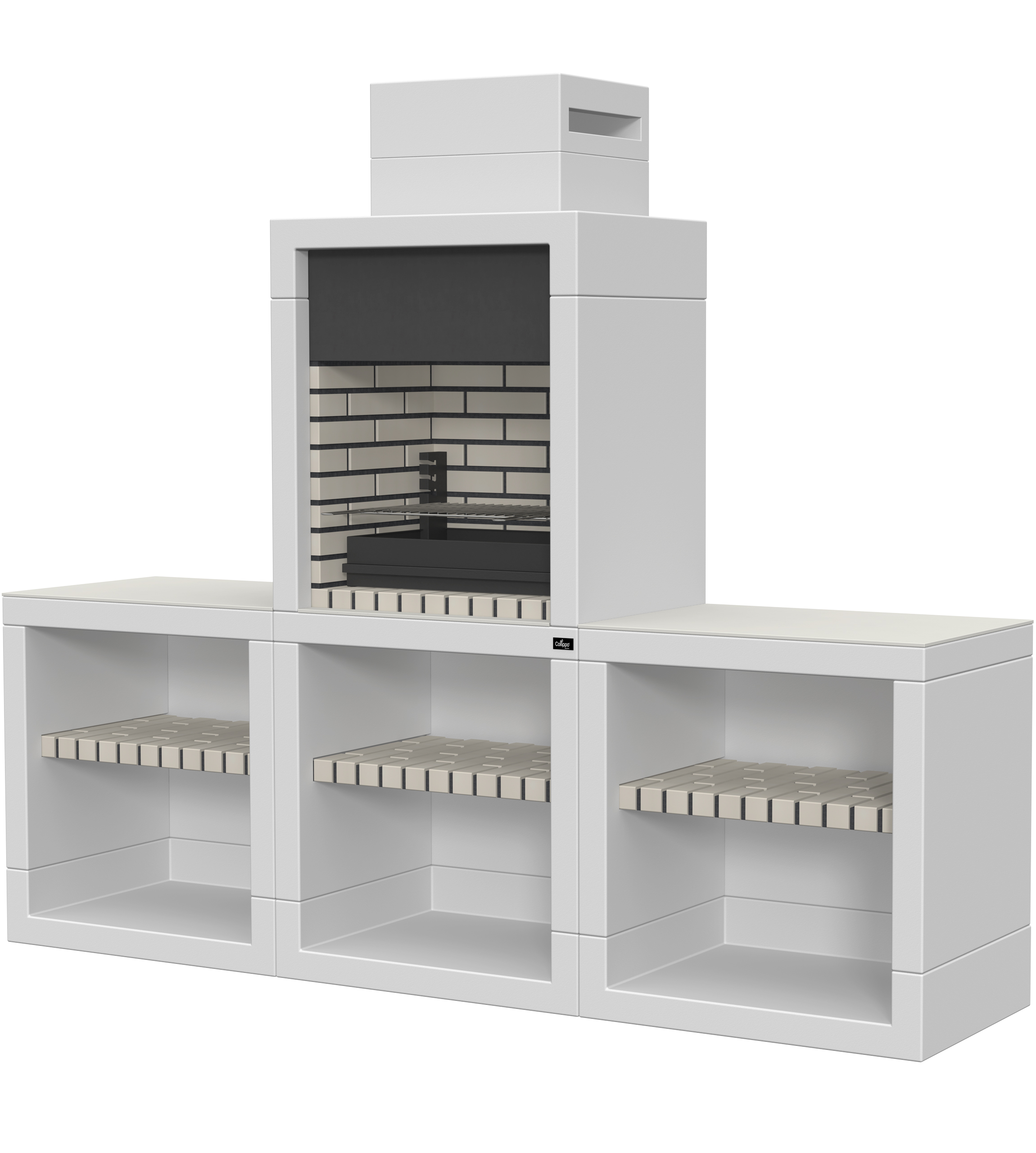 Micro betão liso branco; parte superior da zona de fogo com pintura preta; bancadas em pedra branca; zona de fogo em tijolo e cimento refractário.