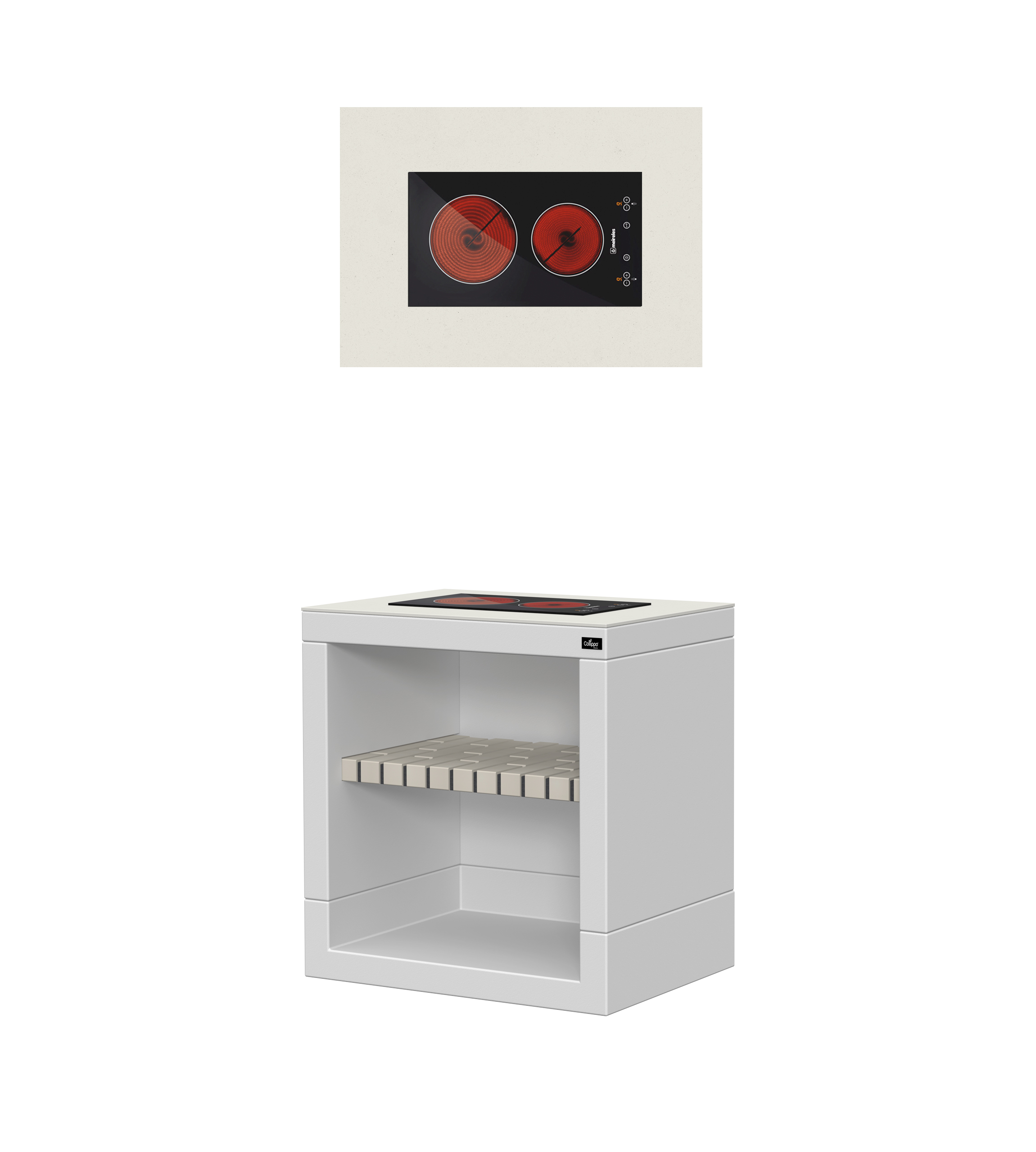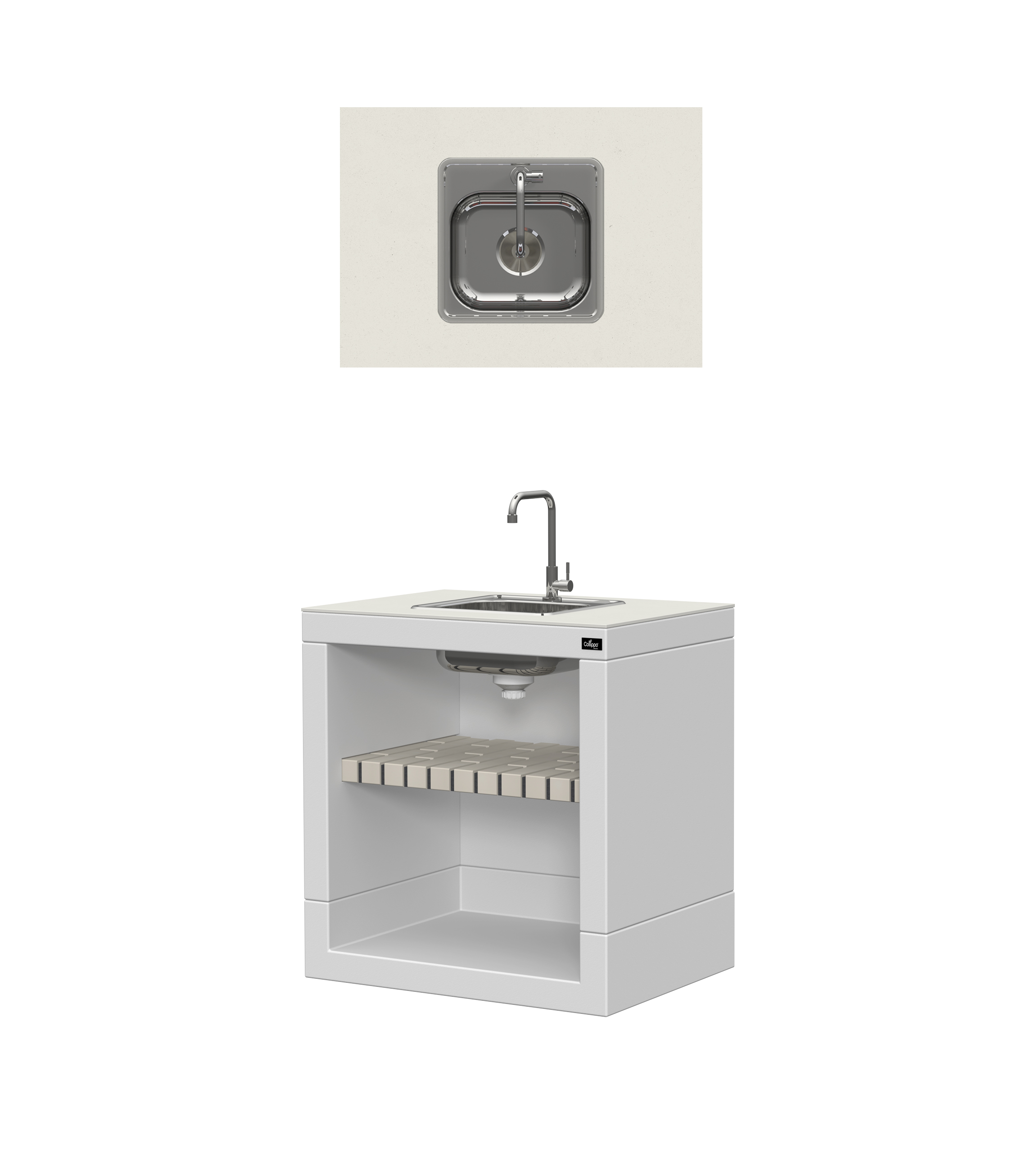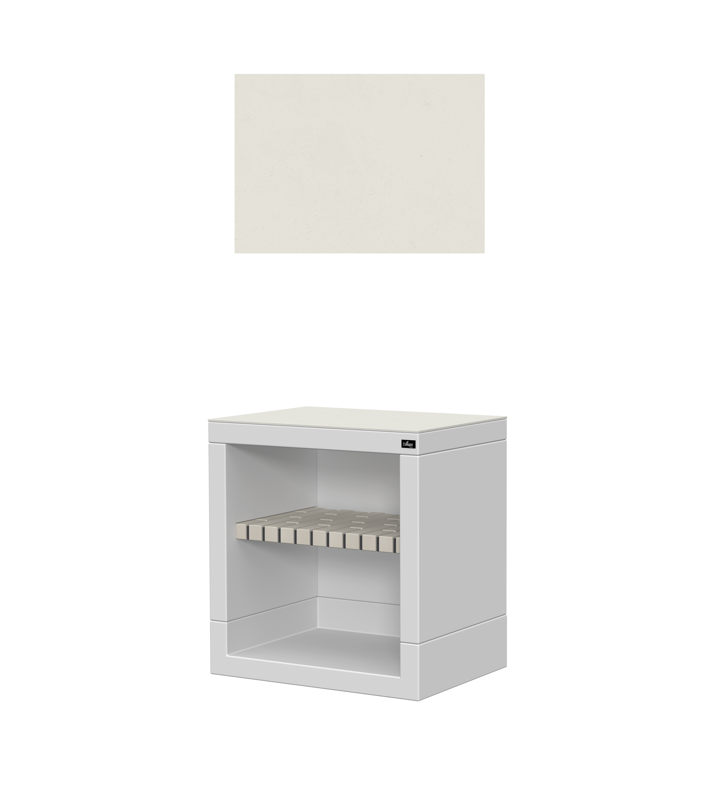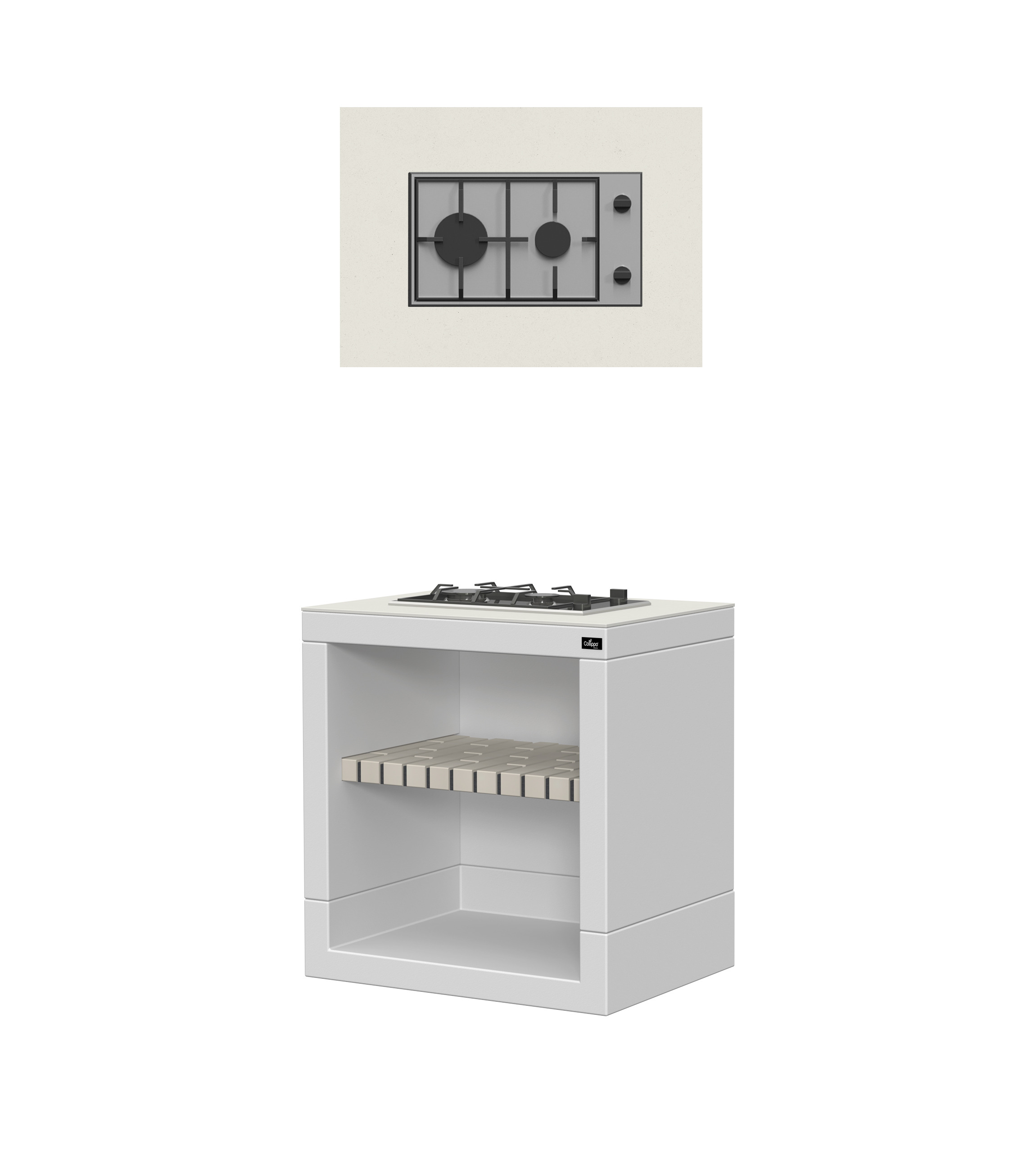 Micro betão liso branco; prateleira em tijolo; bancada em pedra branca.