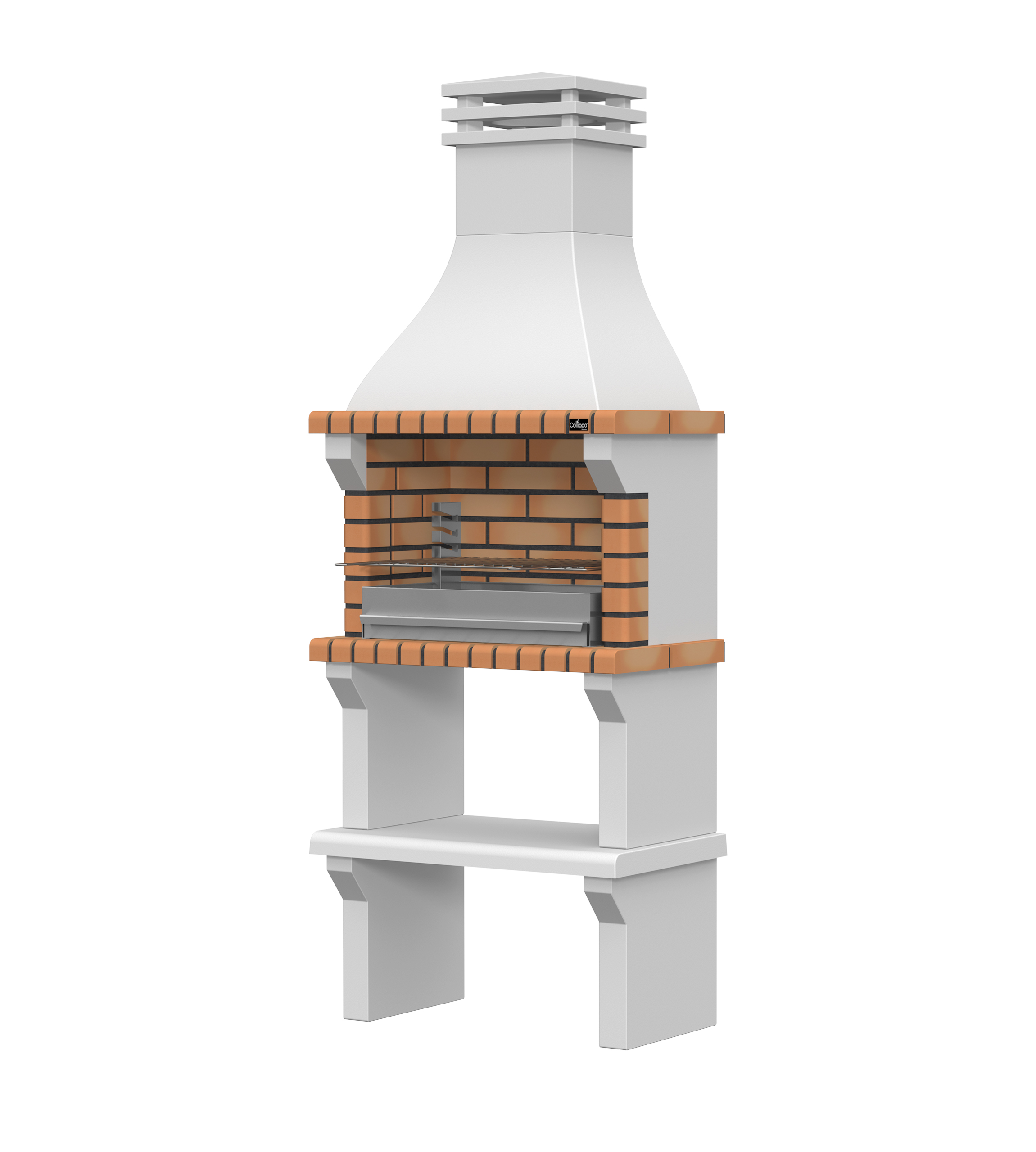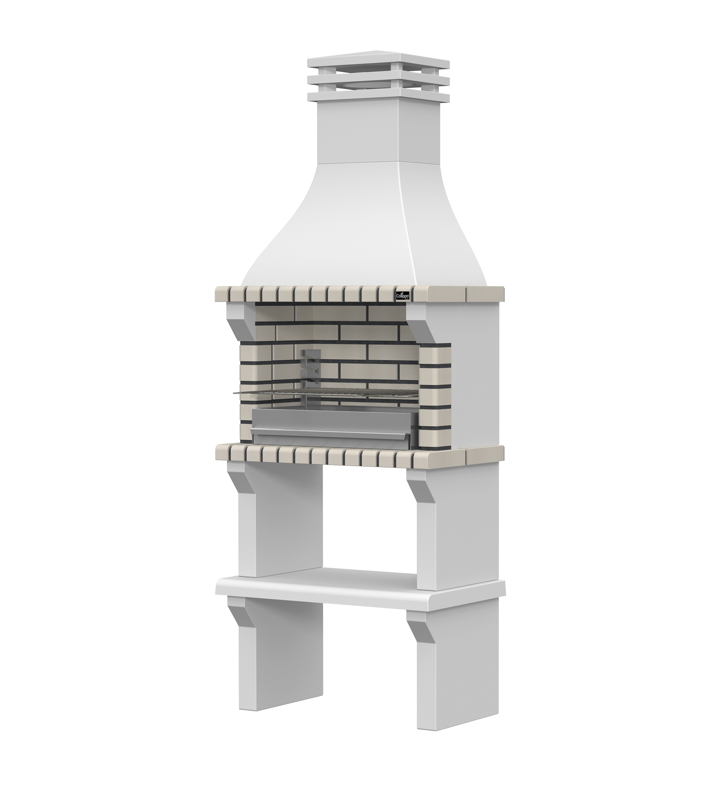 Peças em micro betão cinzento liso e micro betão cinzento texturado; zona de fogo em tijolo e cimento refractário