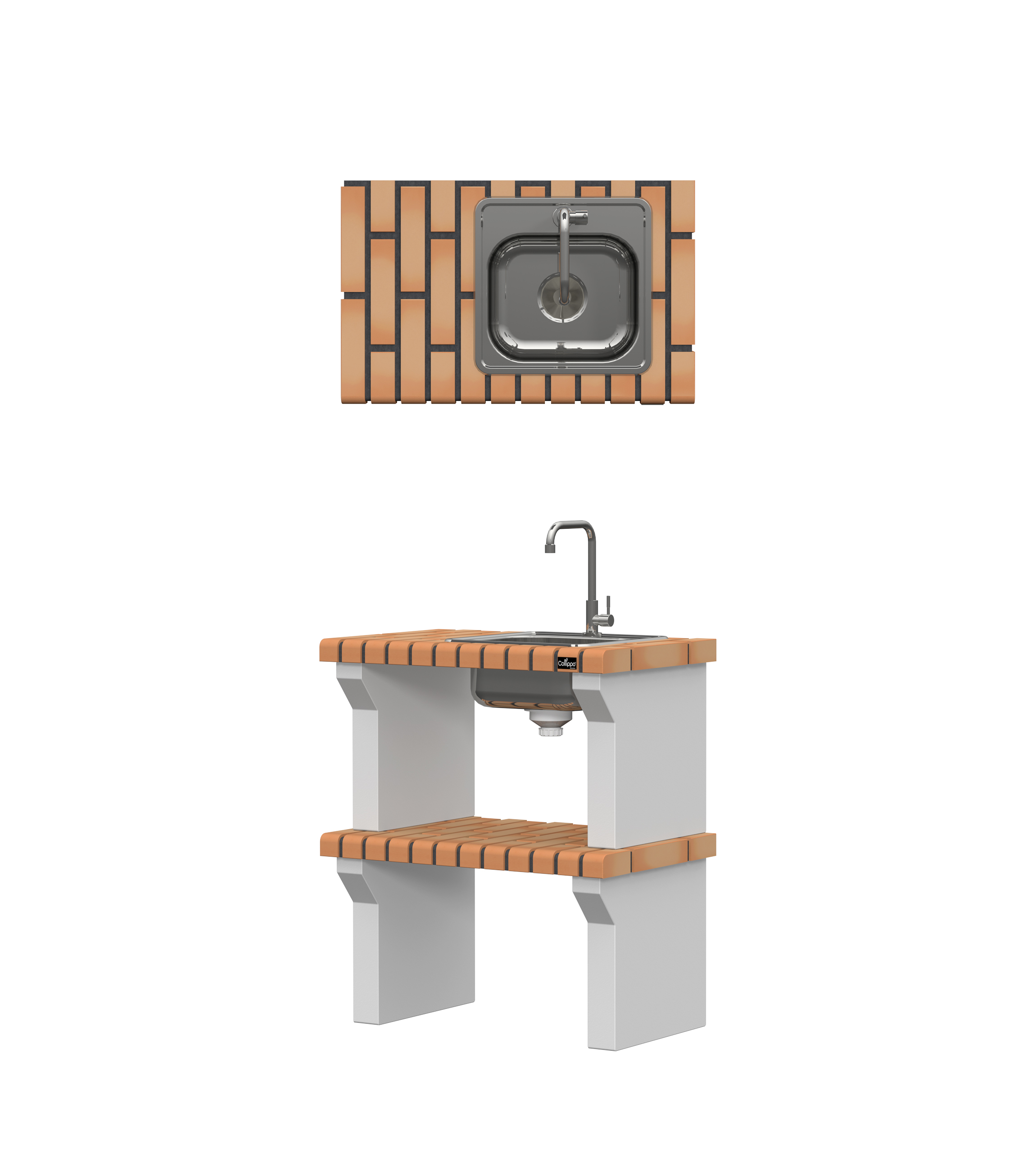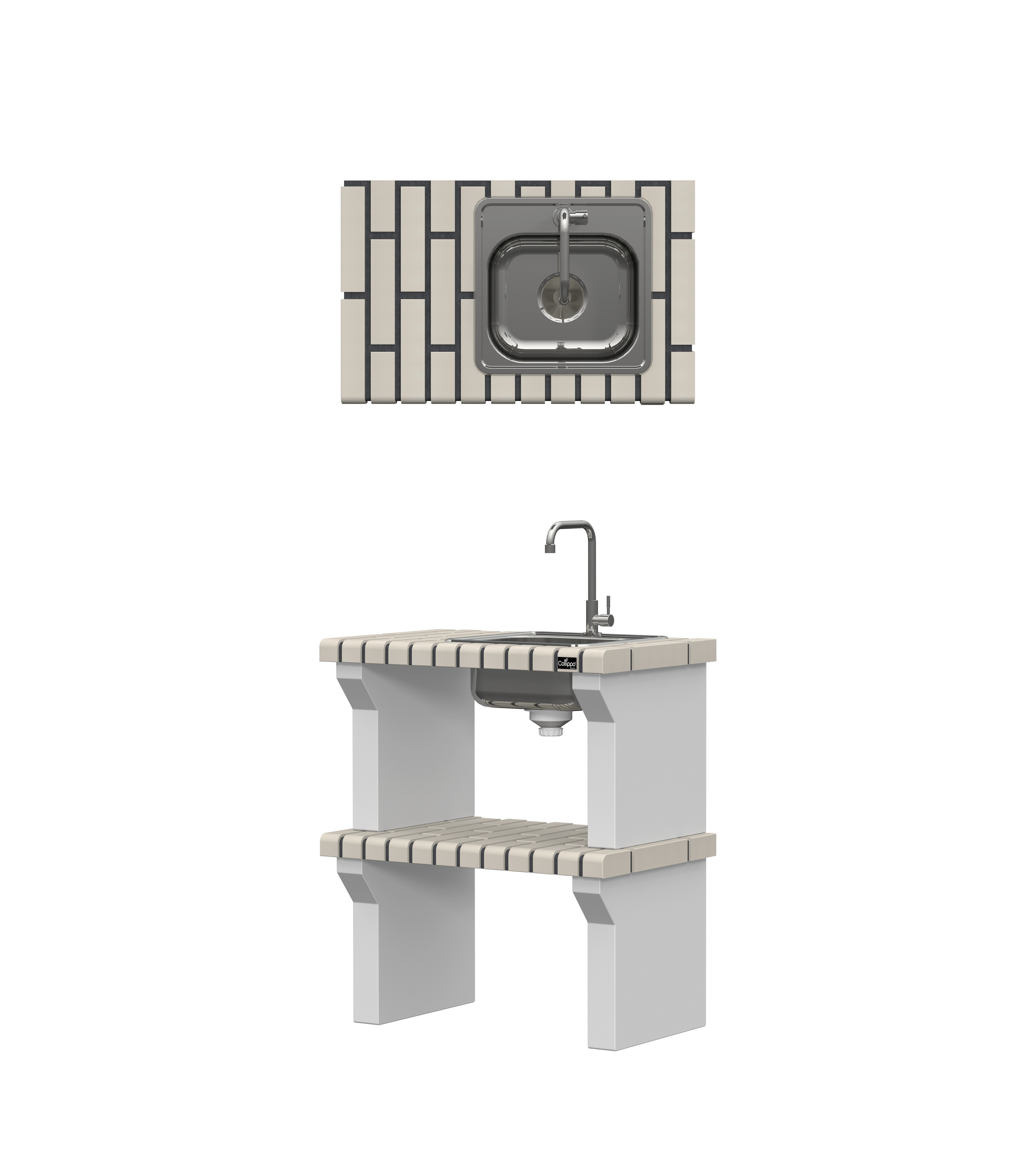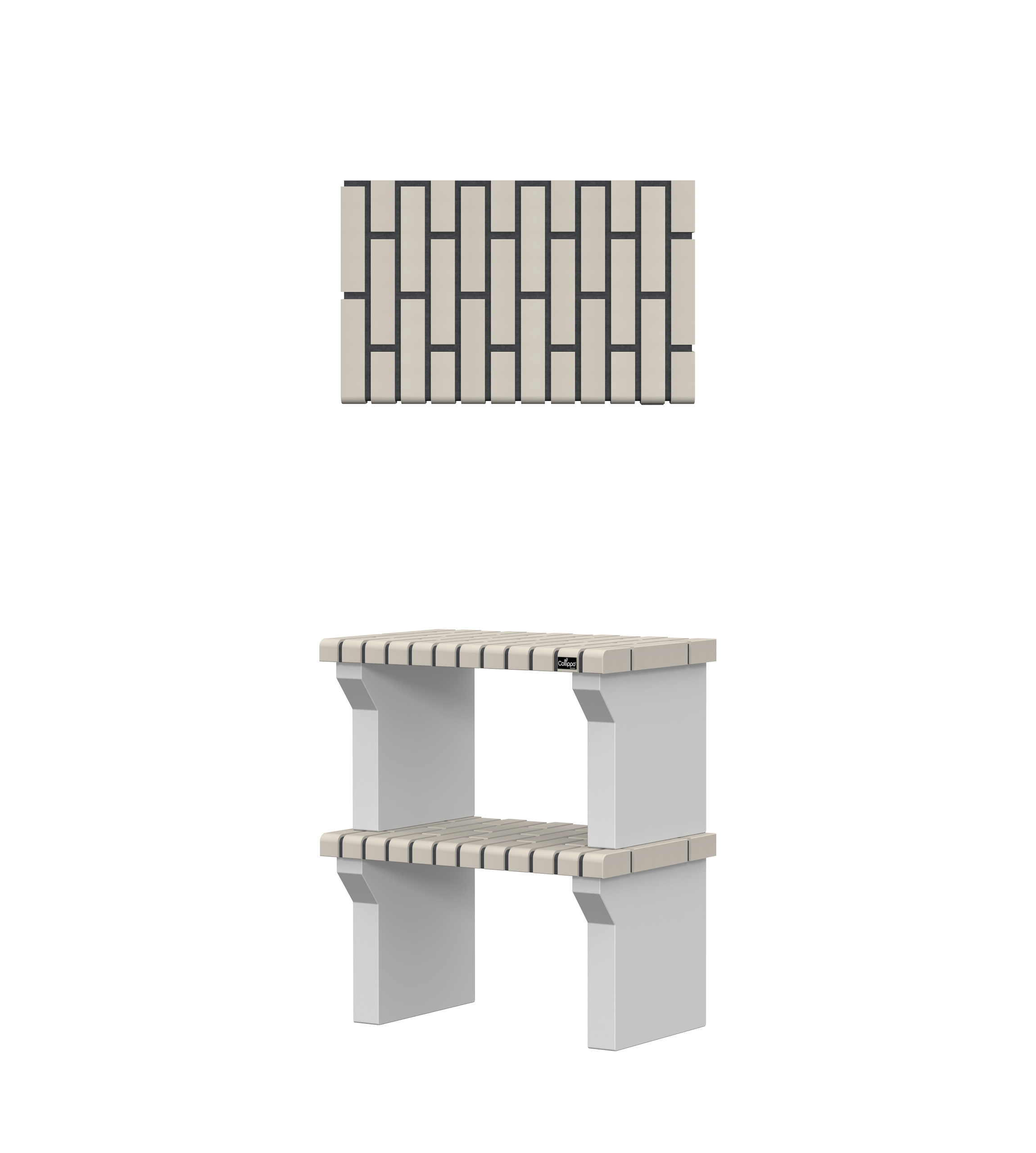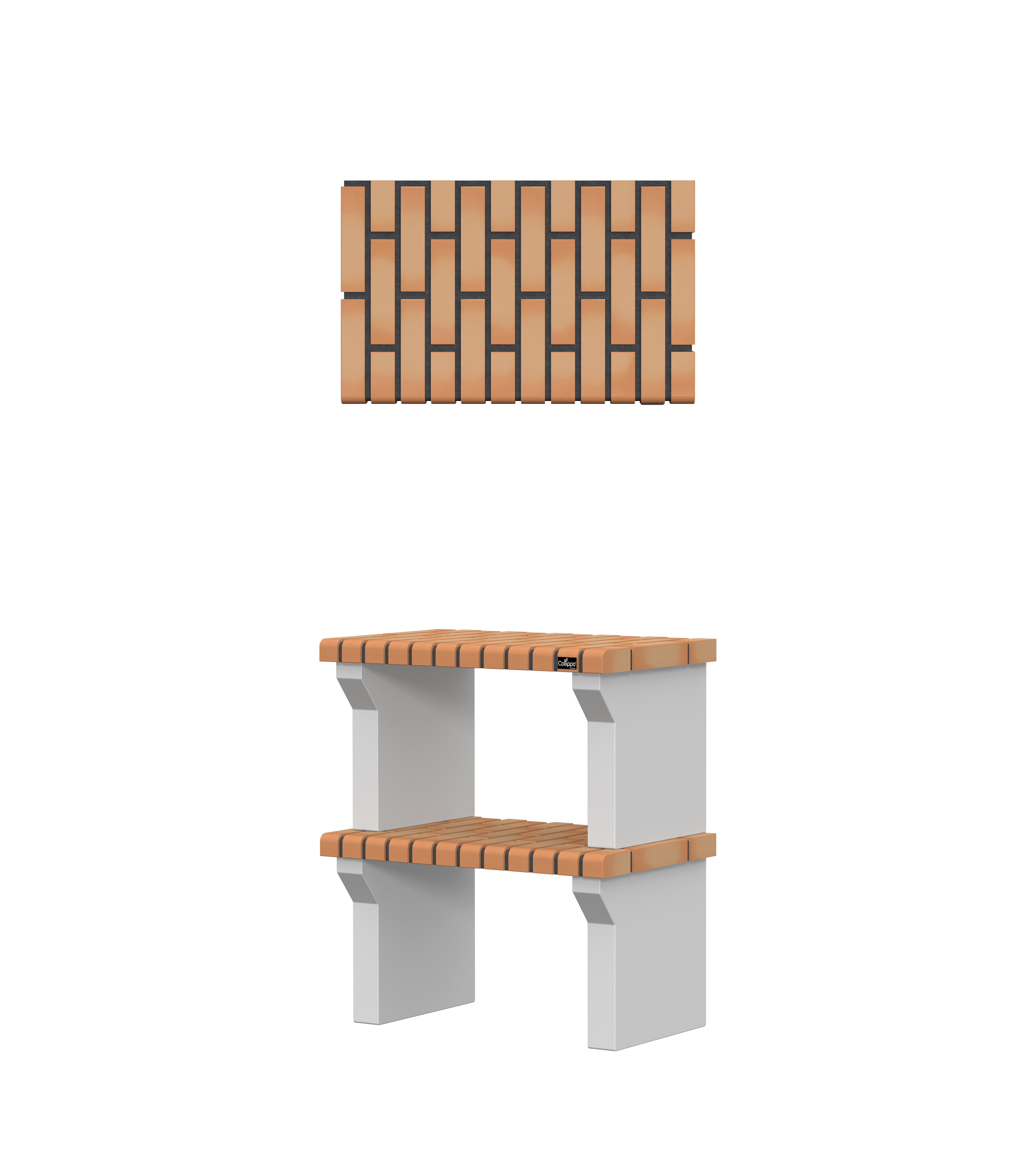 Micro betão cinzento liso e micro betão cinzento texturado; bancadas em tijolo