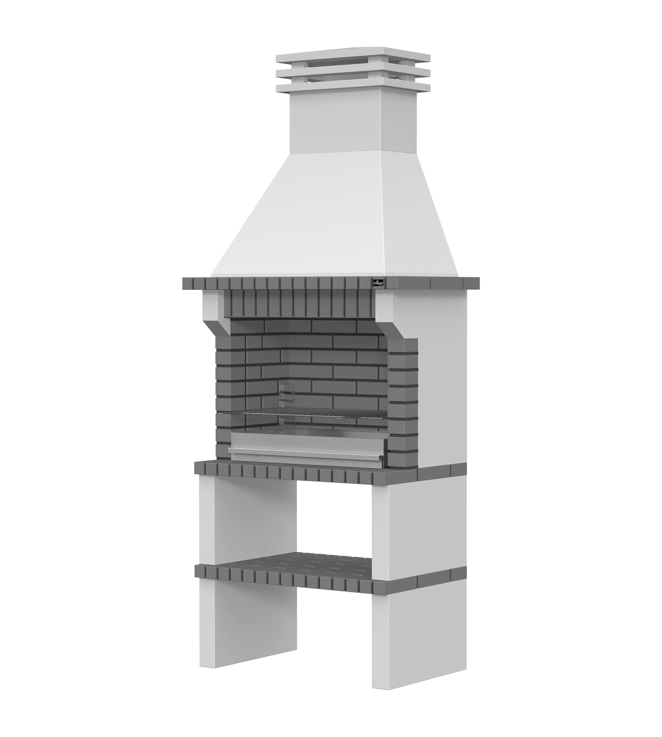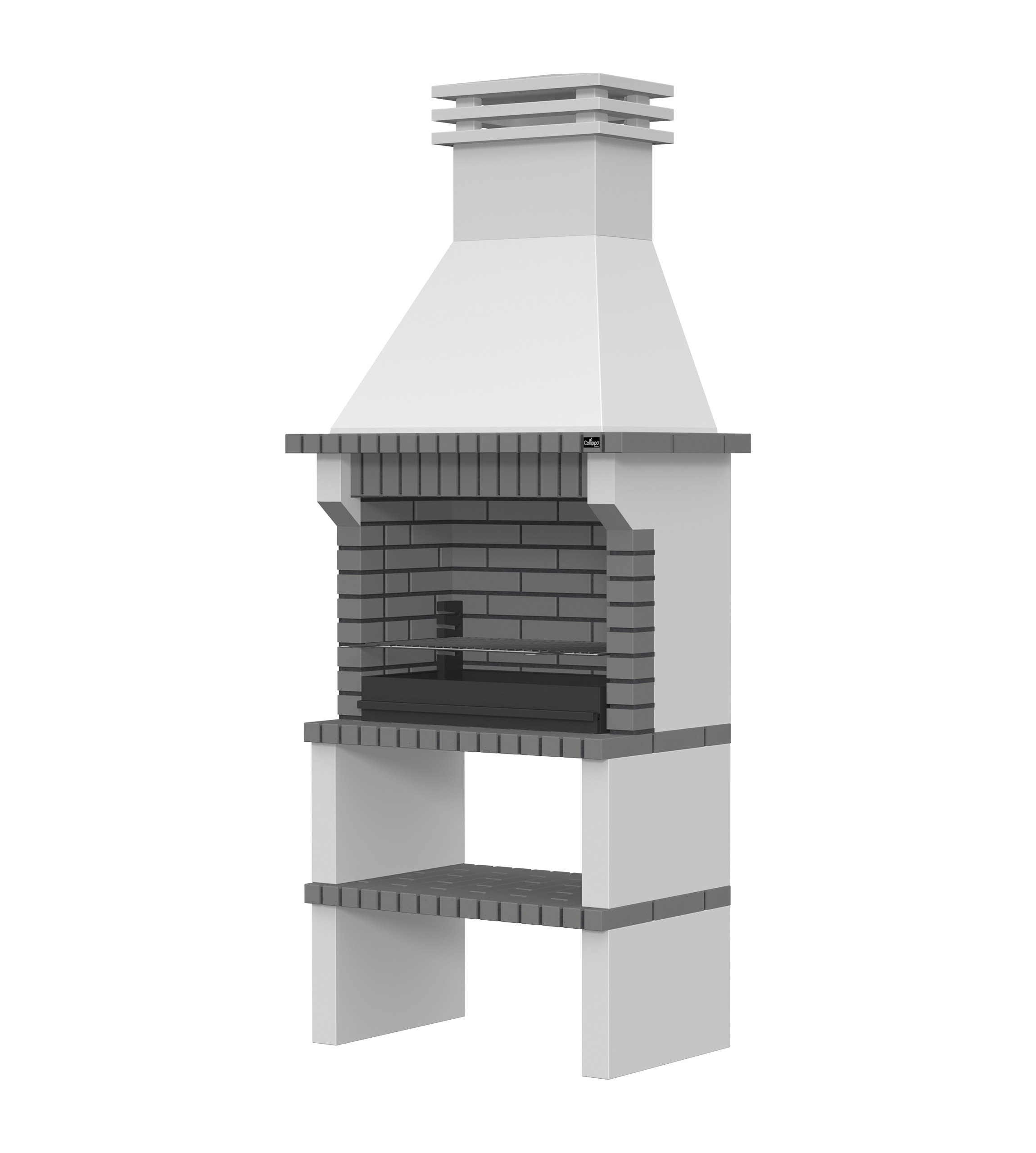 Peças em micro betão cinzento liso e micro betão cinzento texturado; zona de fogo em tijolo e cimento refractário