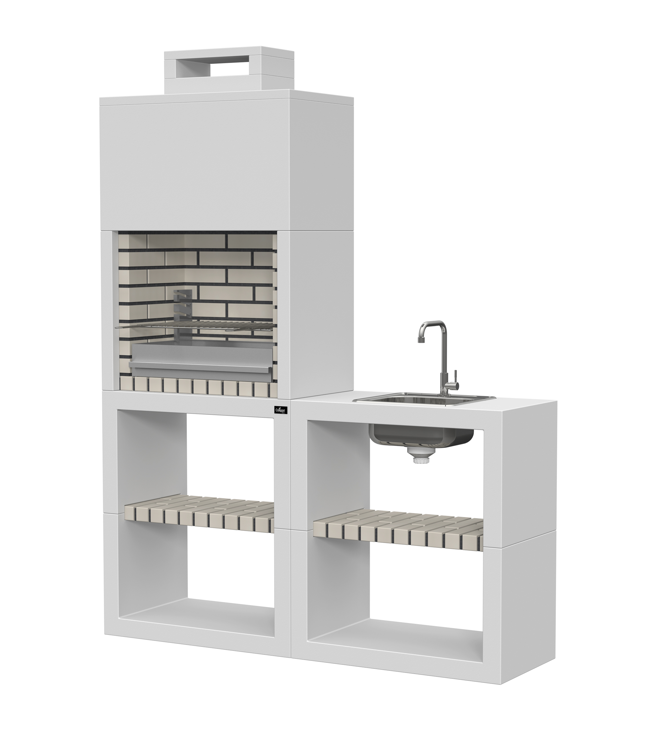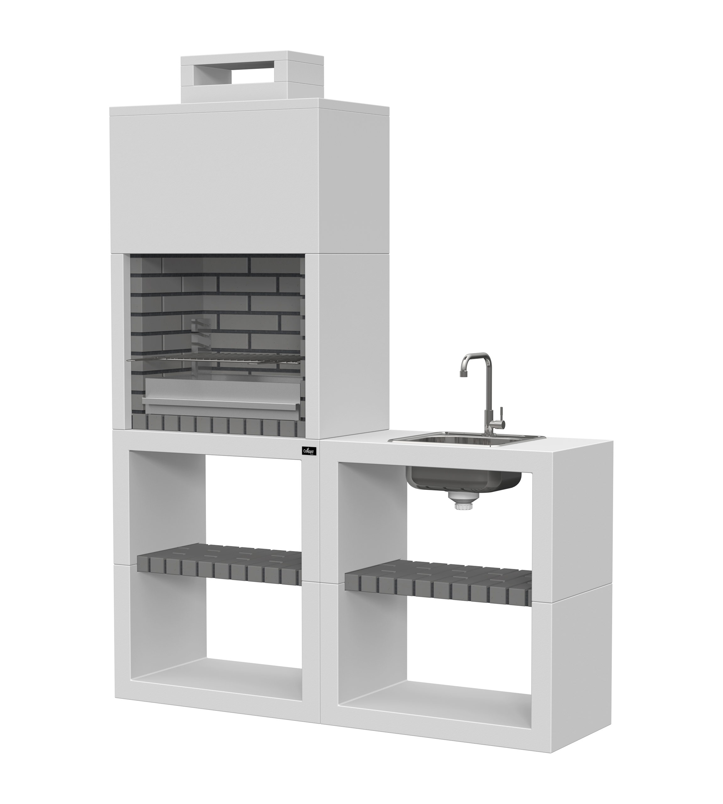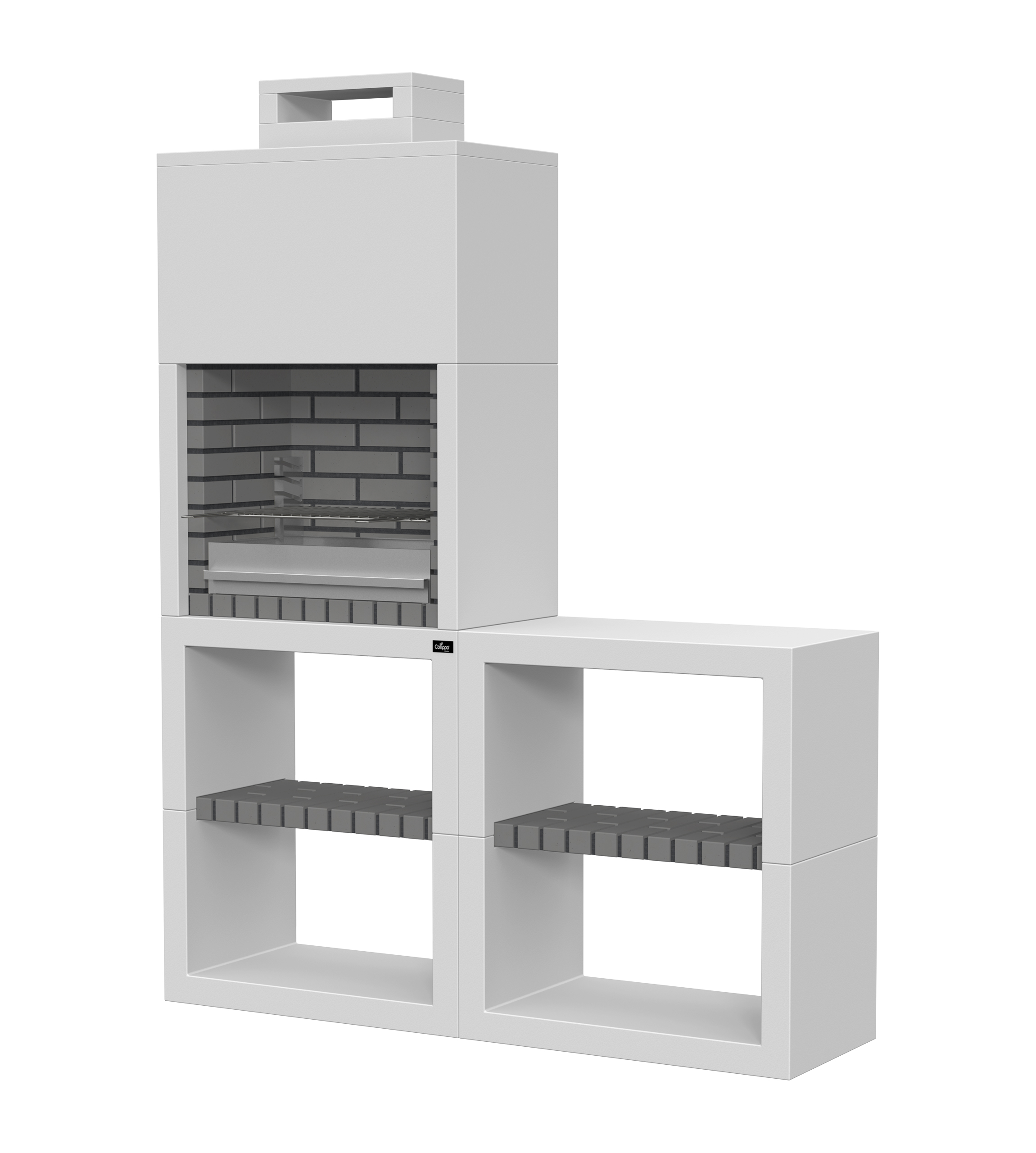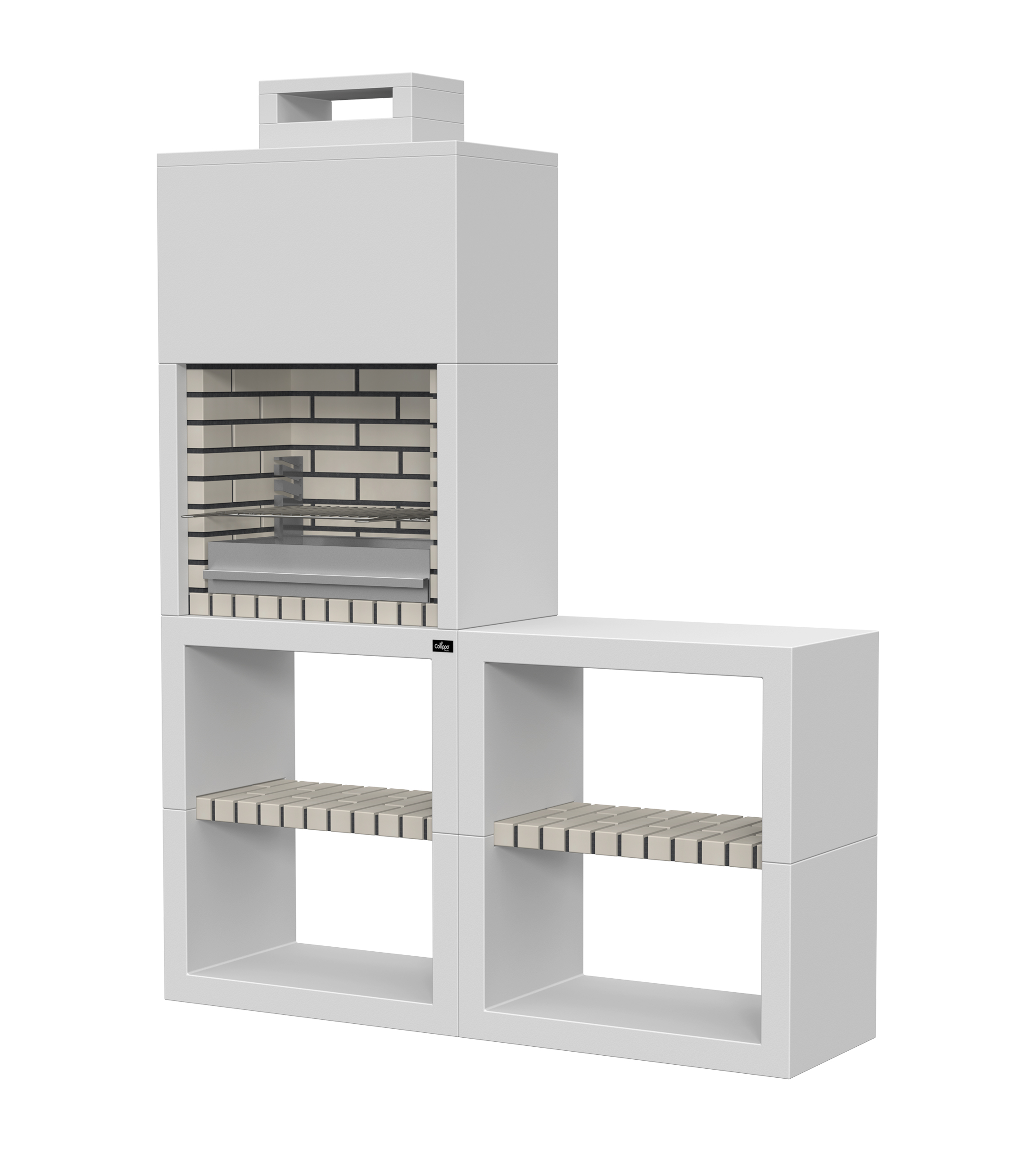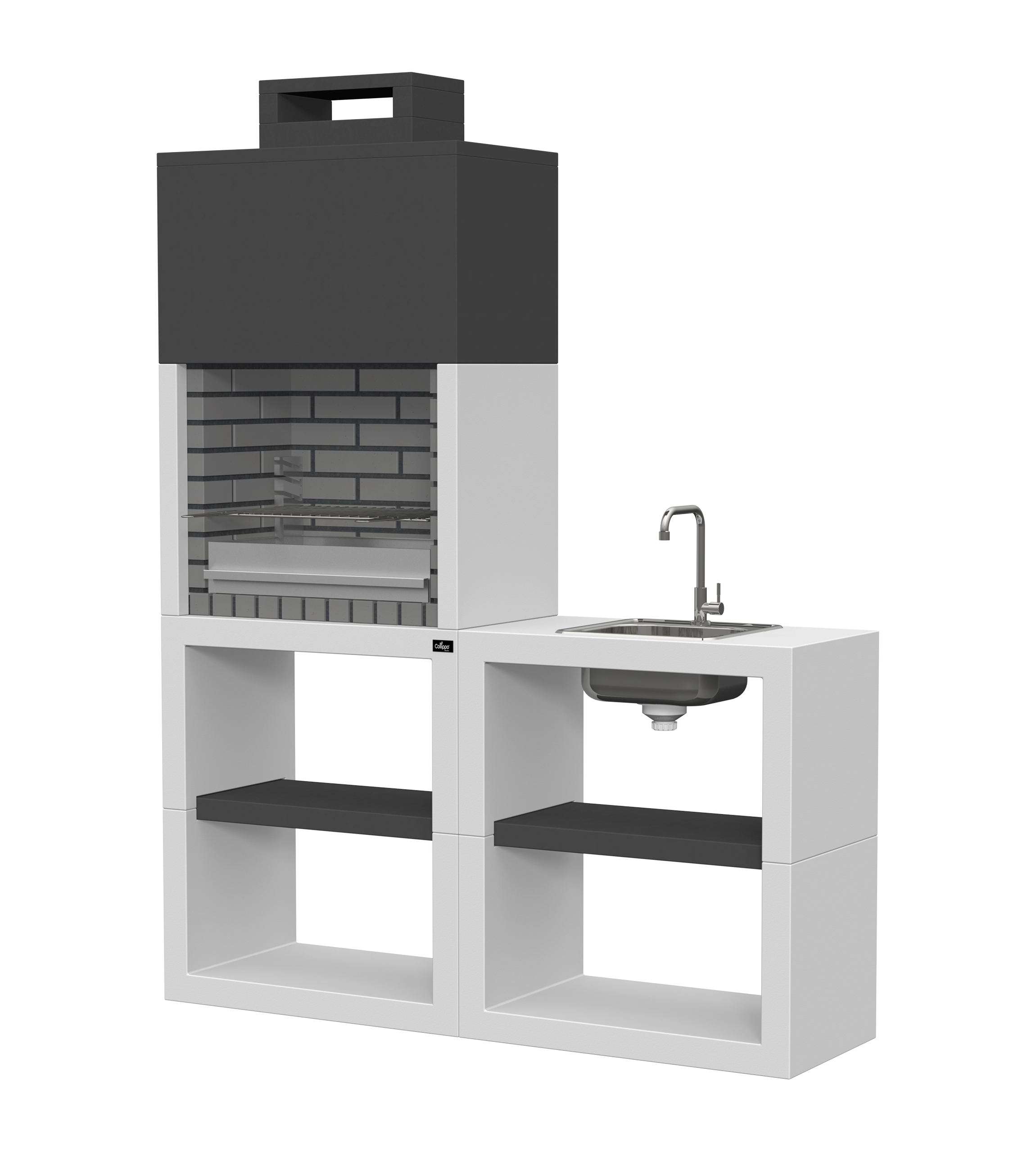 Micro betão liso branco; peças com pintura preta;  zona de fogo em tijolo e cimento refractário.