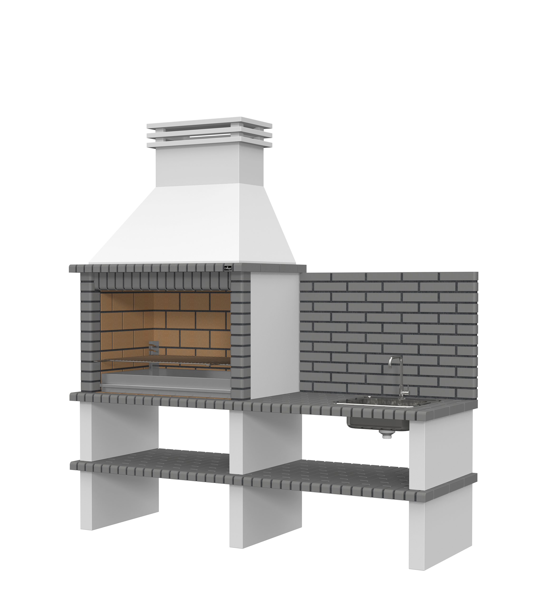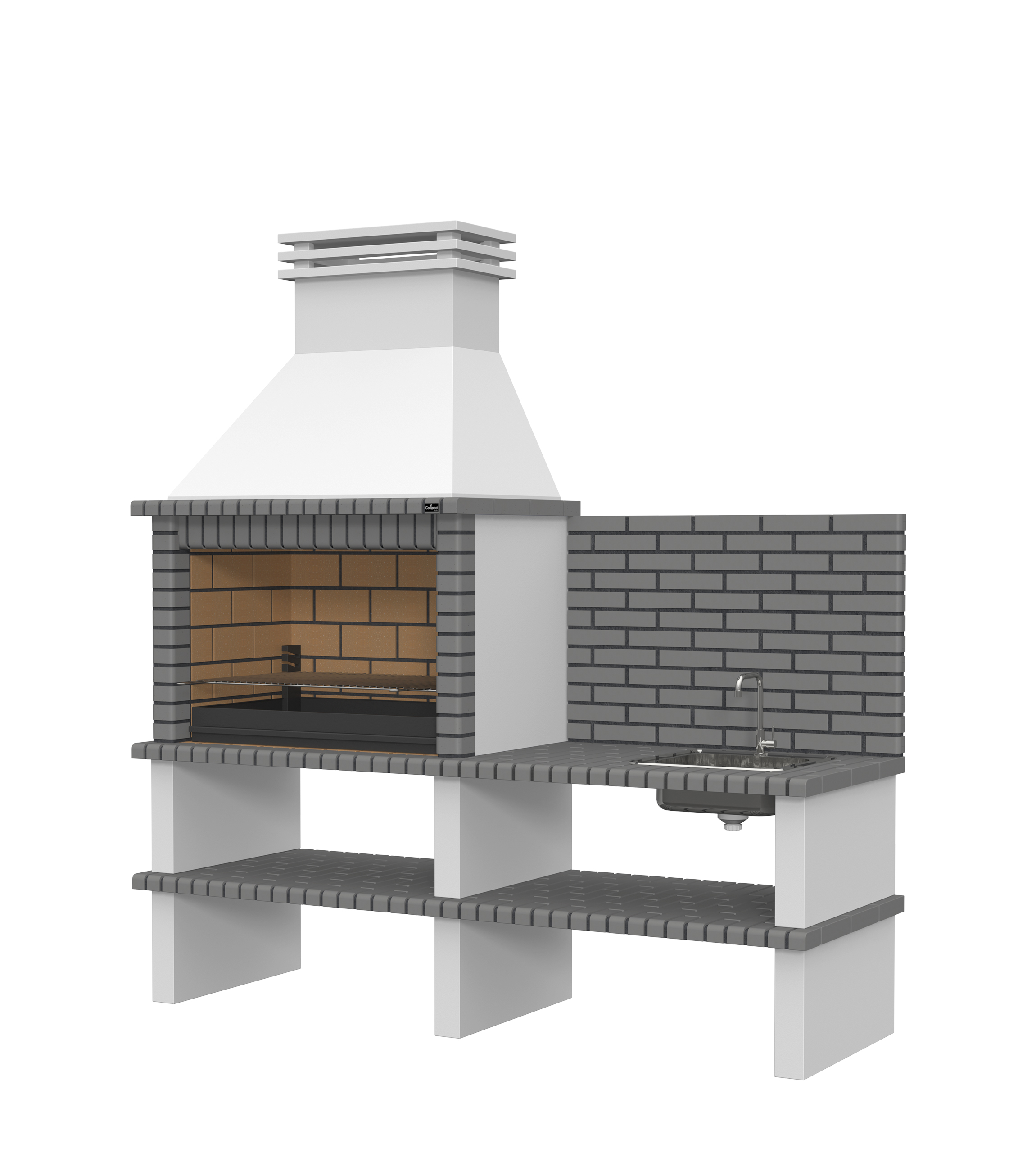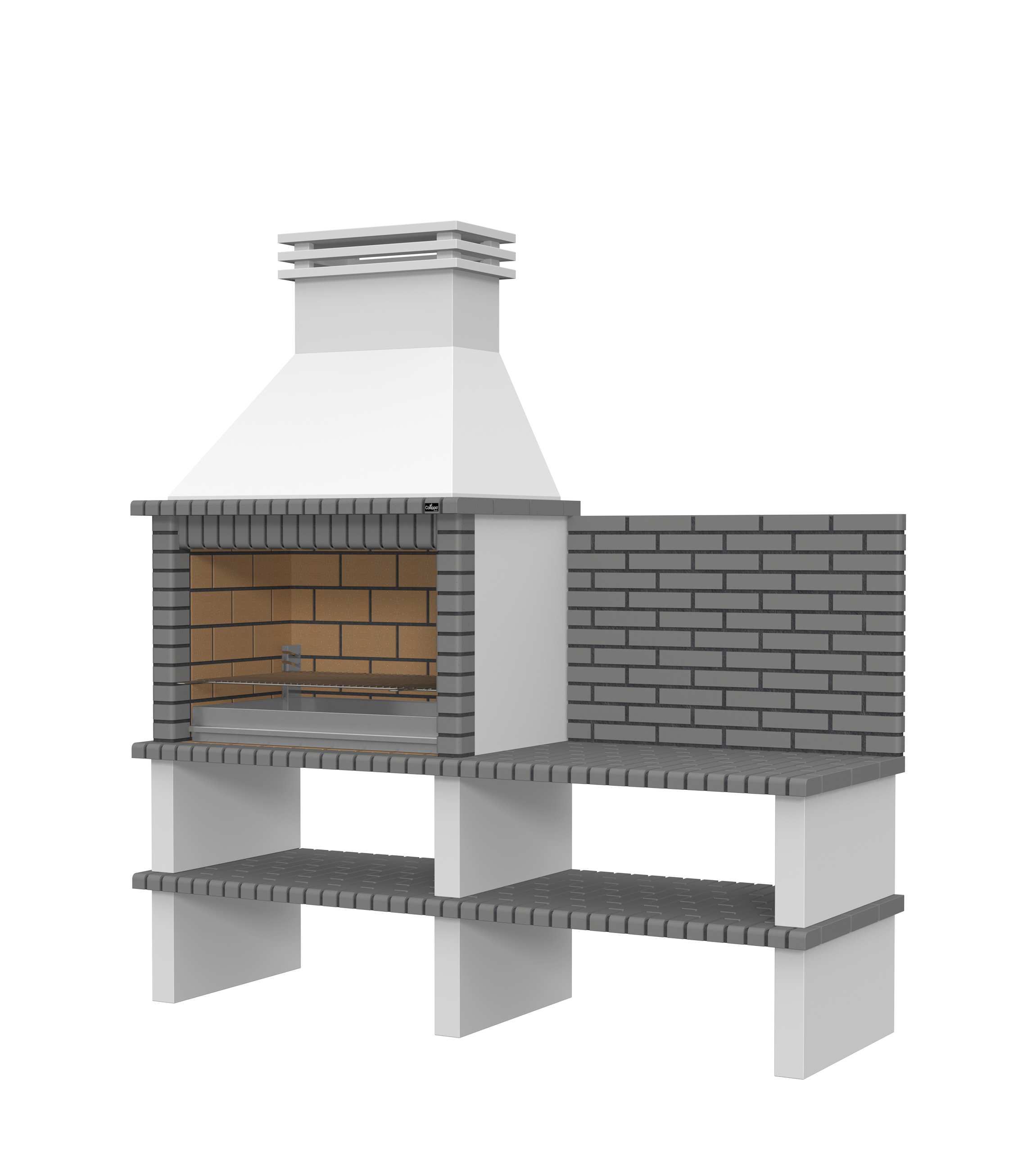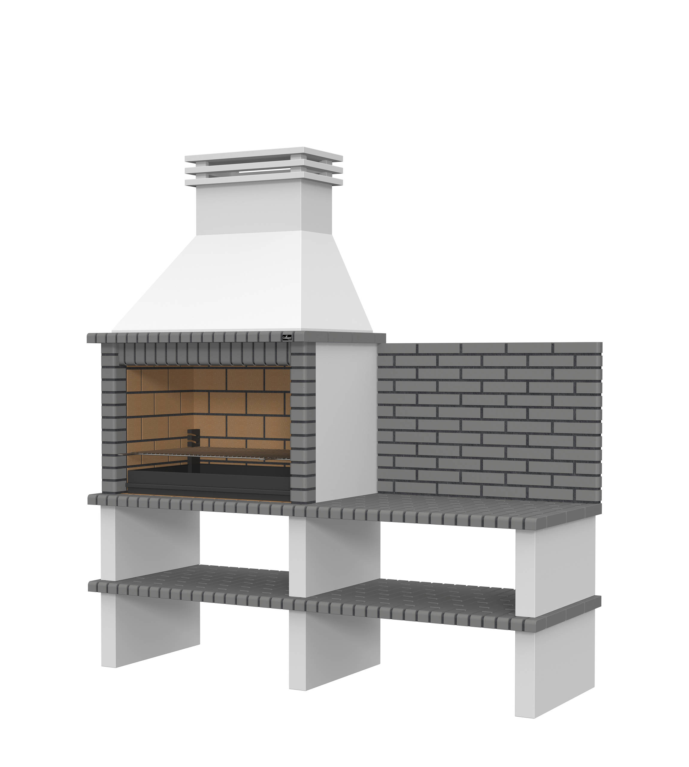 Chaminé e pés em micro betão cinzento liso; laterais em micro betão cinzento texturado; zona de fogo em tijoleira refractária e cimento refractário.