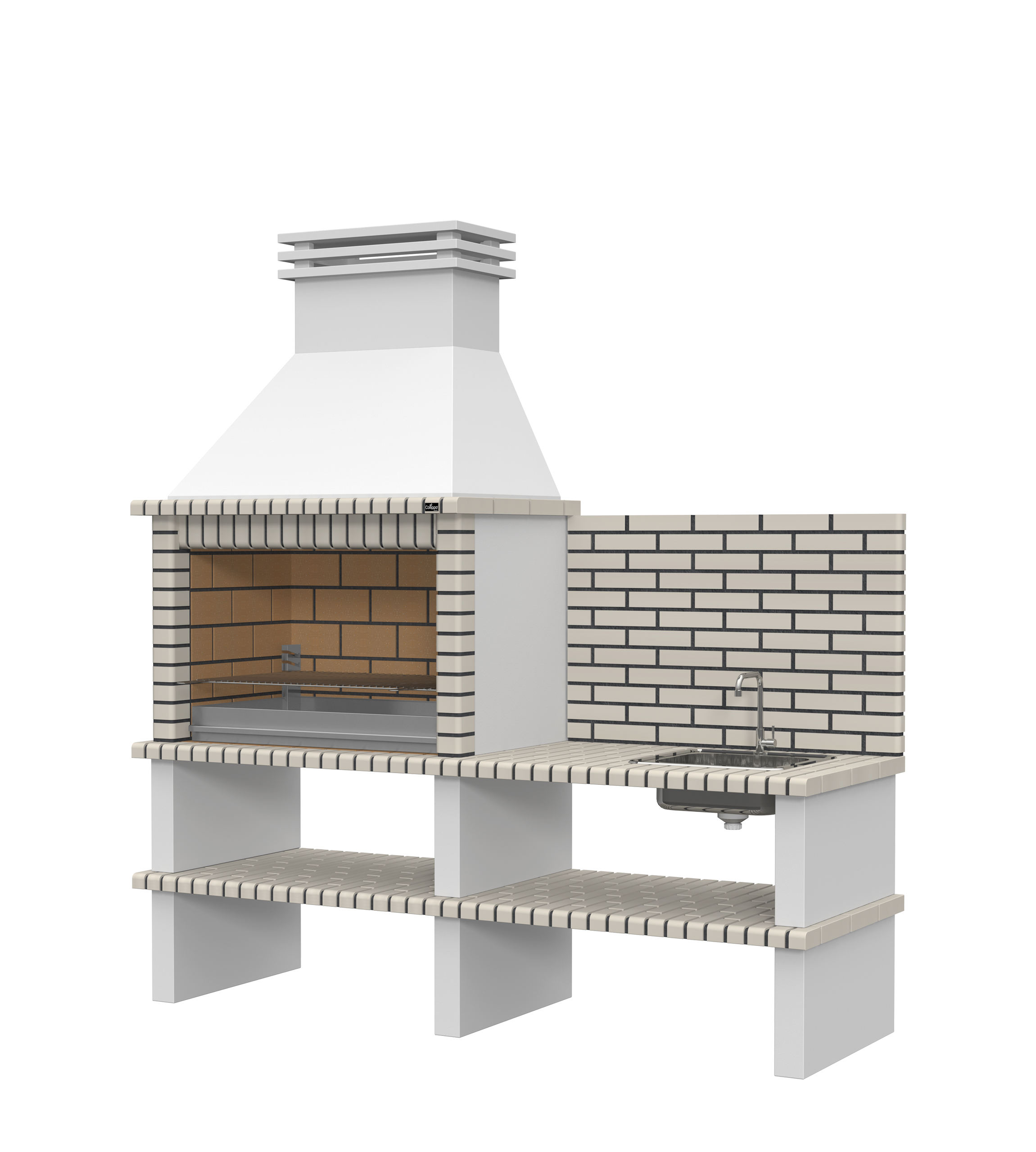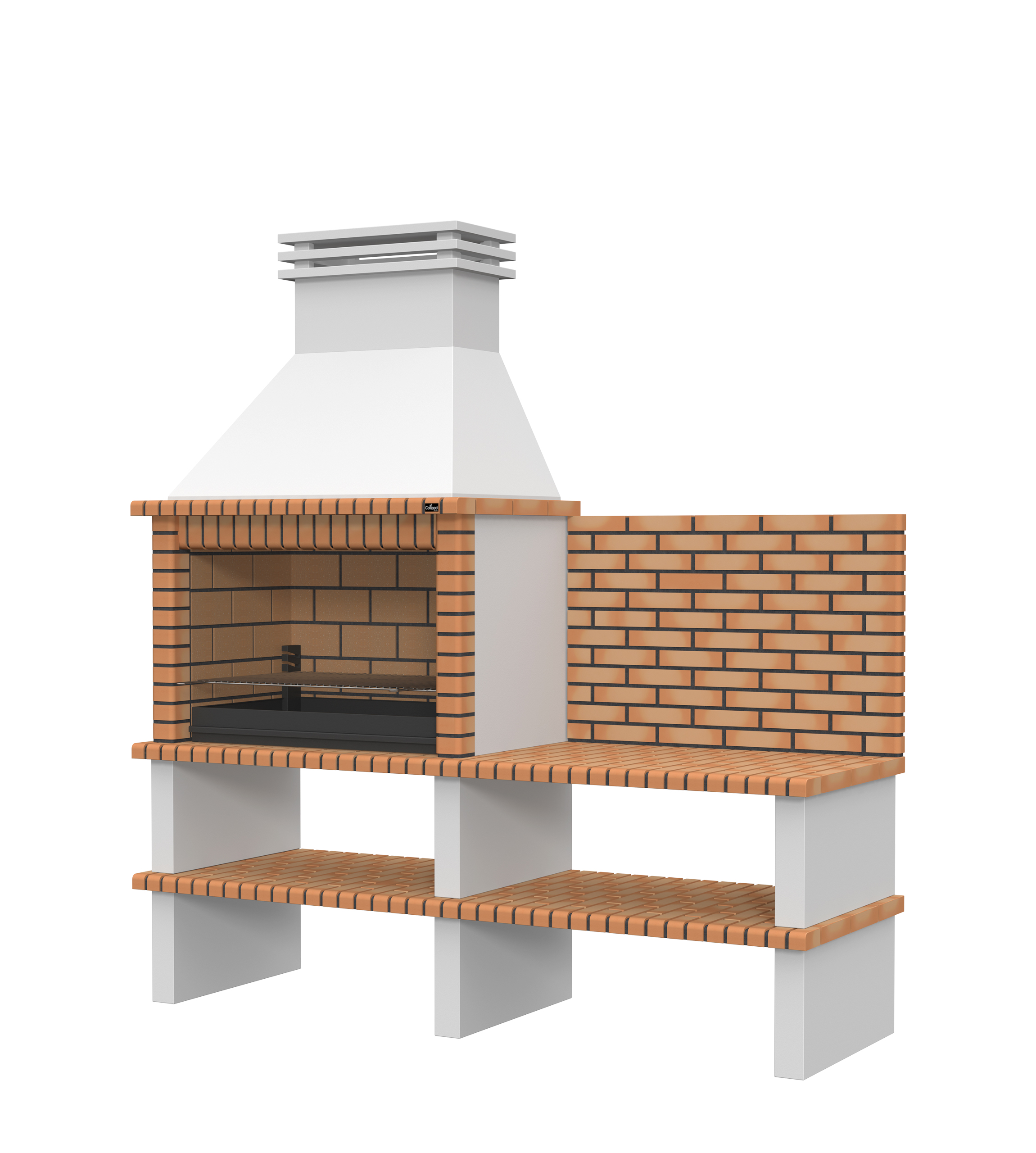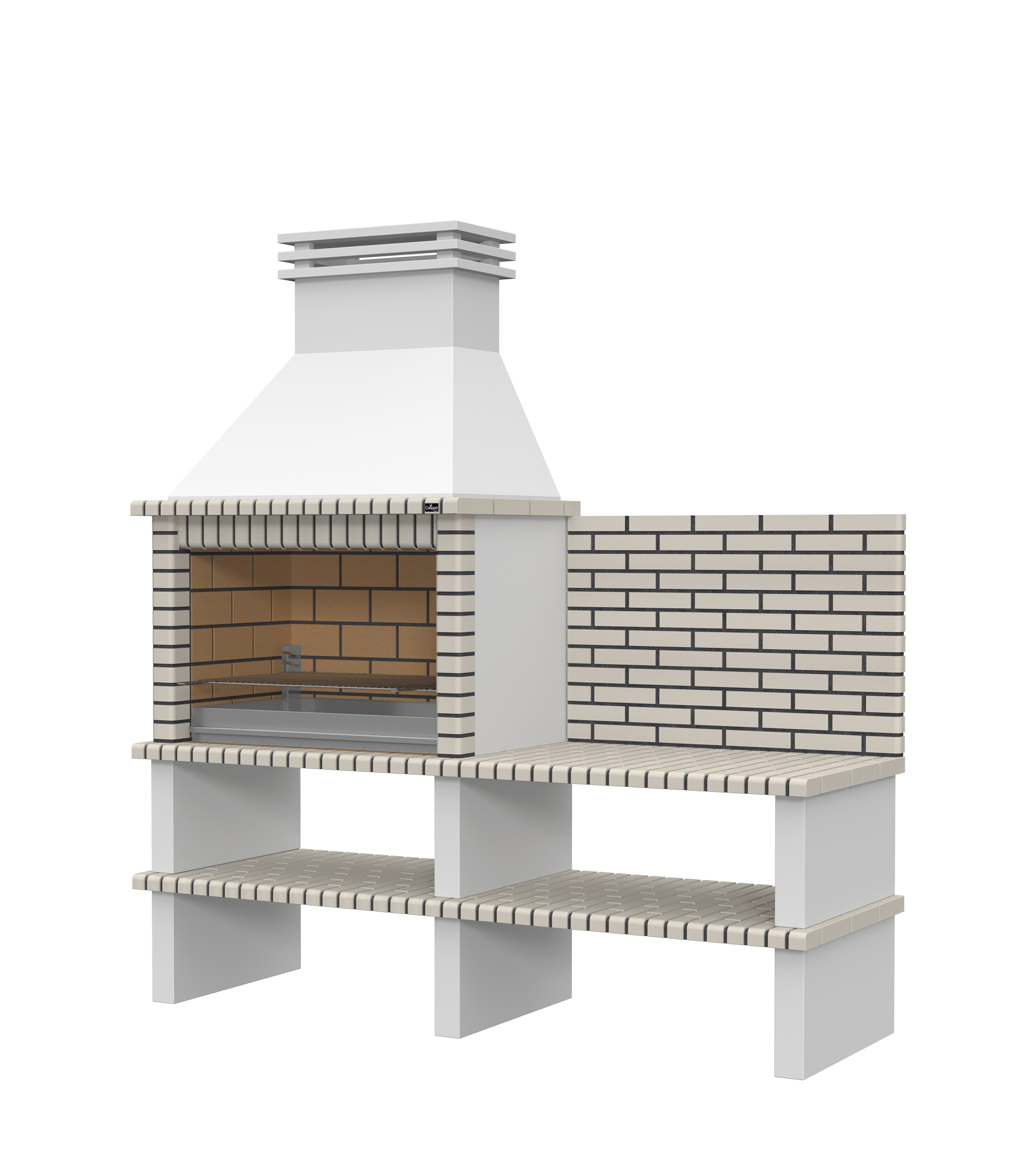 Chaminé e pés em micro betão cinzento liso; laterais em micro betão cinzento texturado; zona de fogo em tijoleira refractária e cimento refractário.