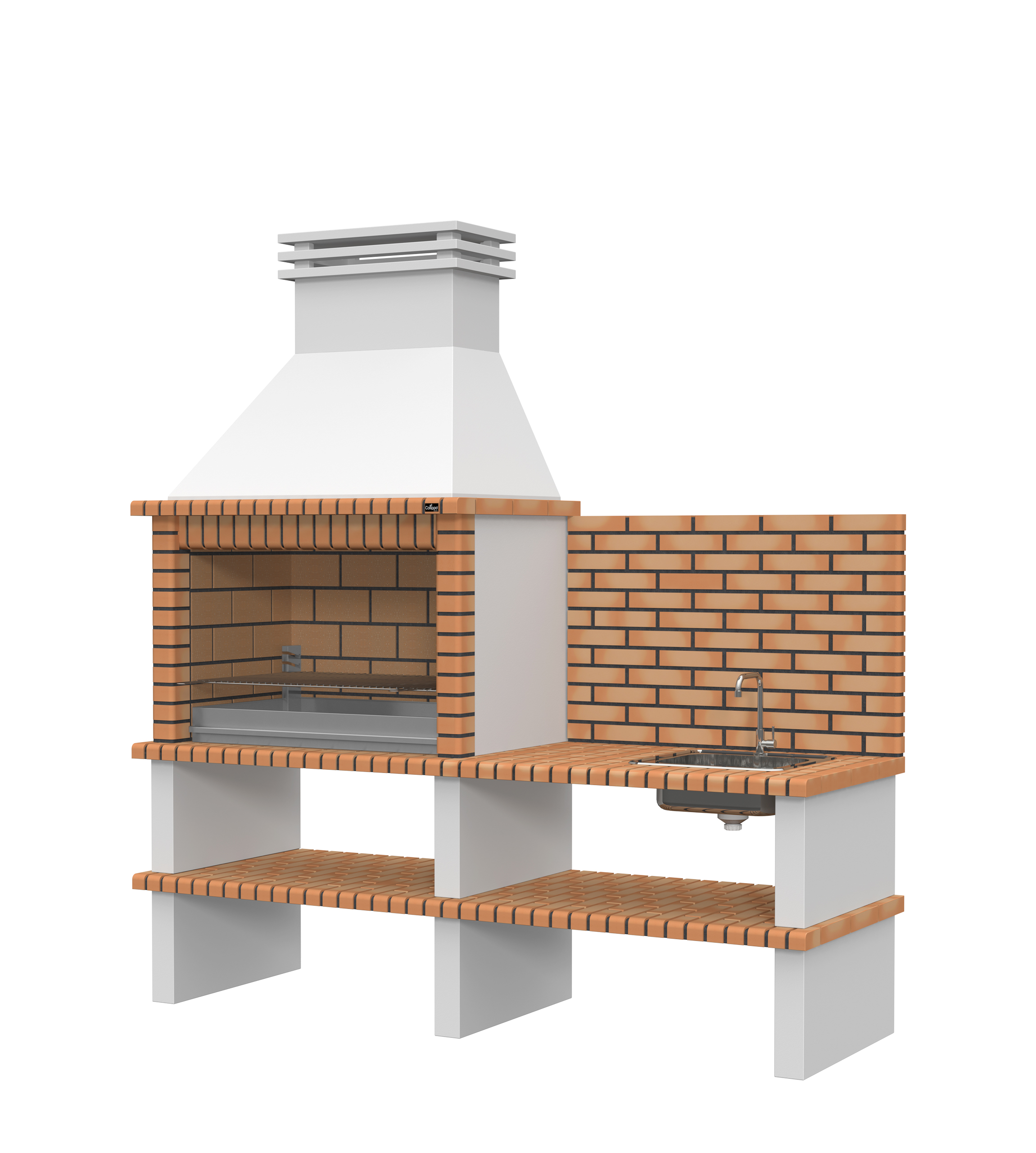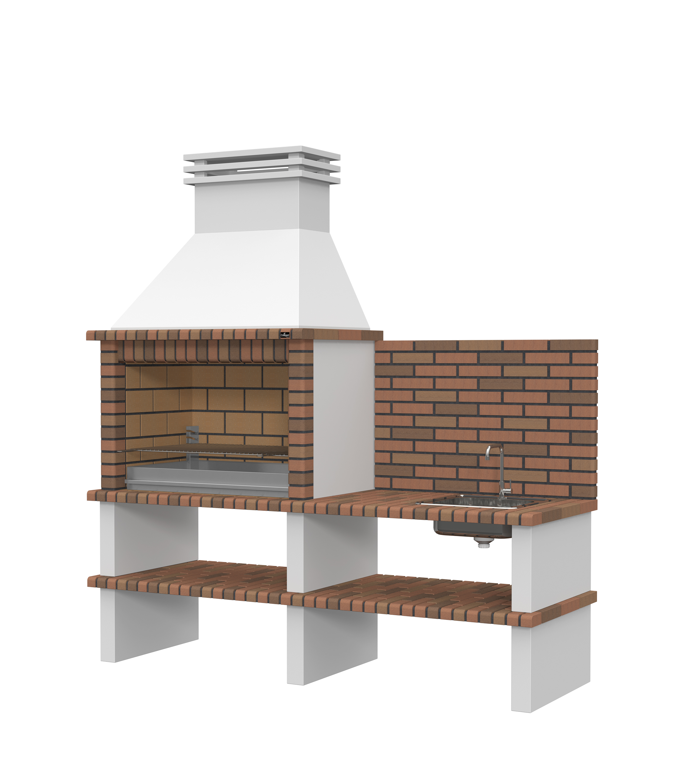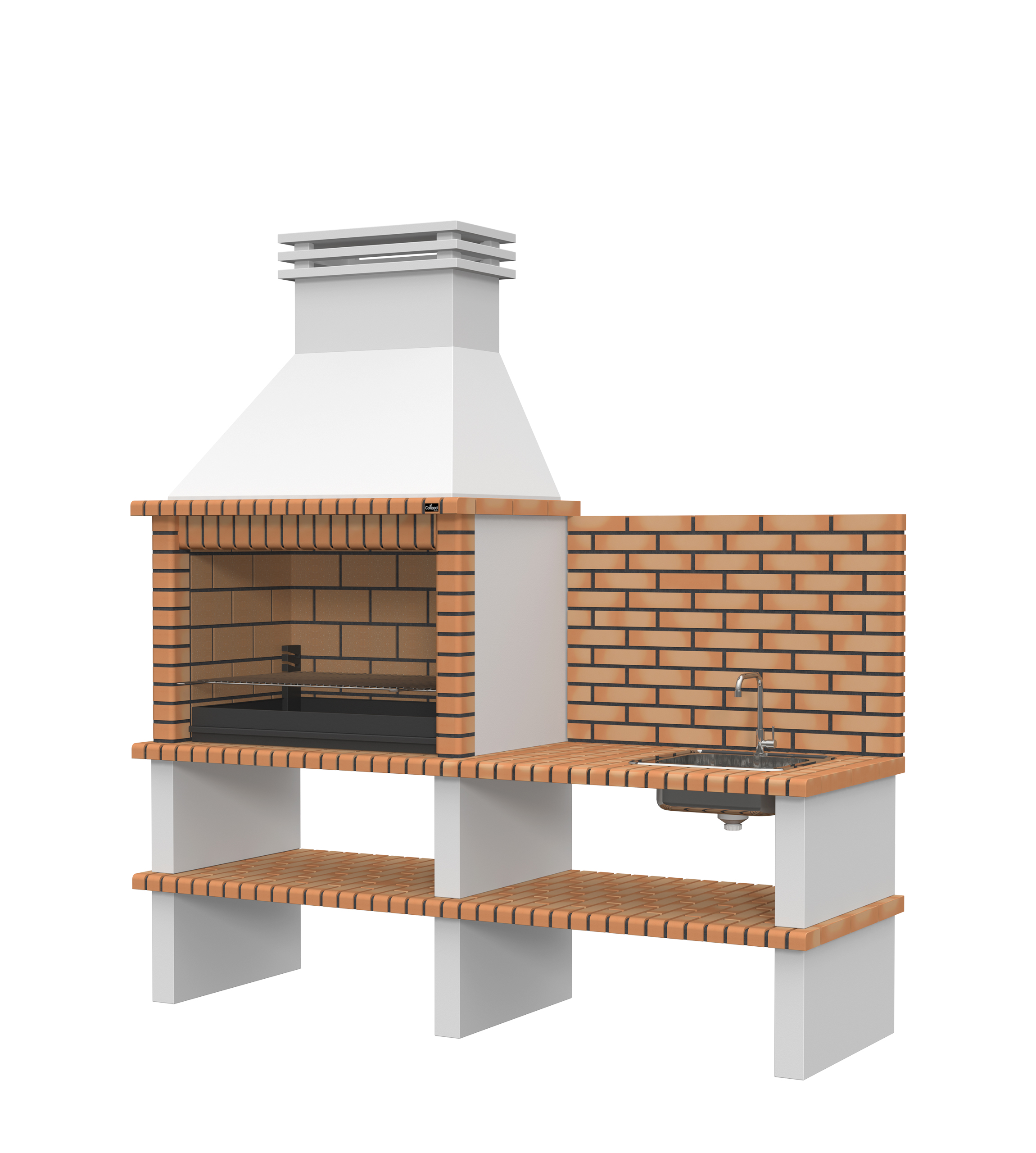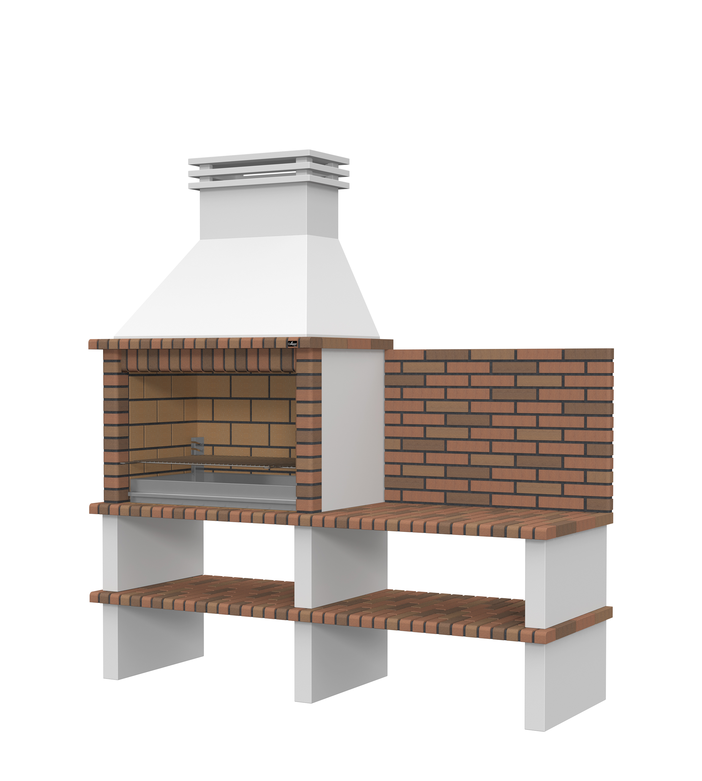 Chaminé e pés em micro betão cinzento liso; laterais em micro betão cinzento texturado; zona de fogo em tijoleira refractária e cimento refractário.