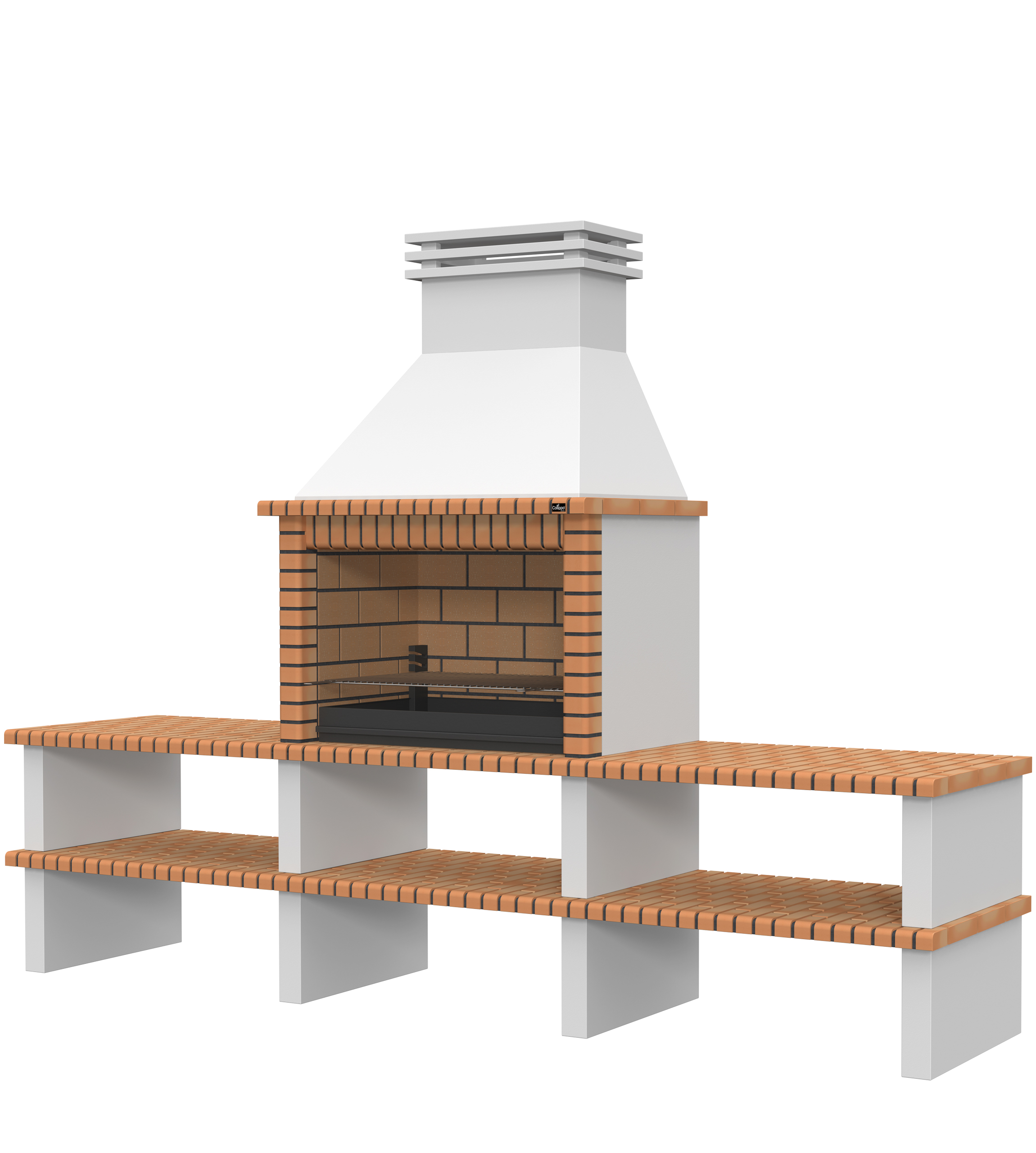 Chaminé e pés em micro betão cinzento liso; laterais em micro betão cinzento texturado; zona de fogo em tijoleira refractária e cimento refractário.