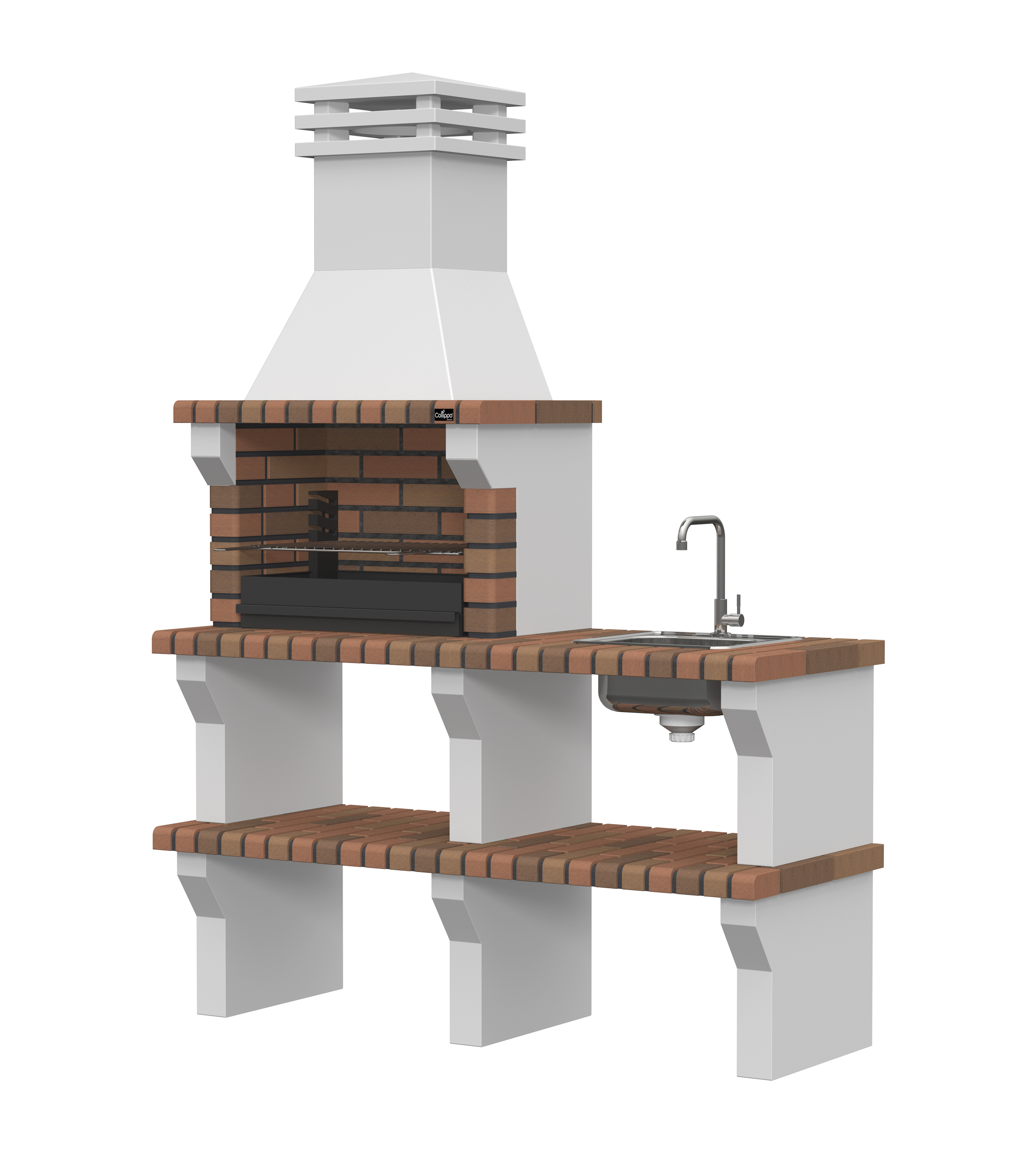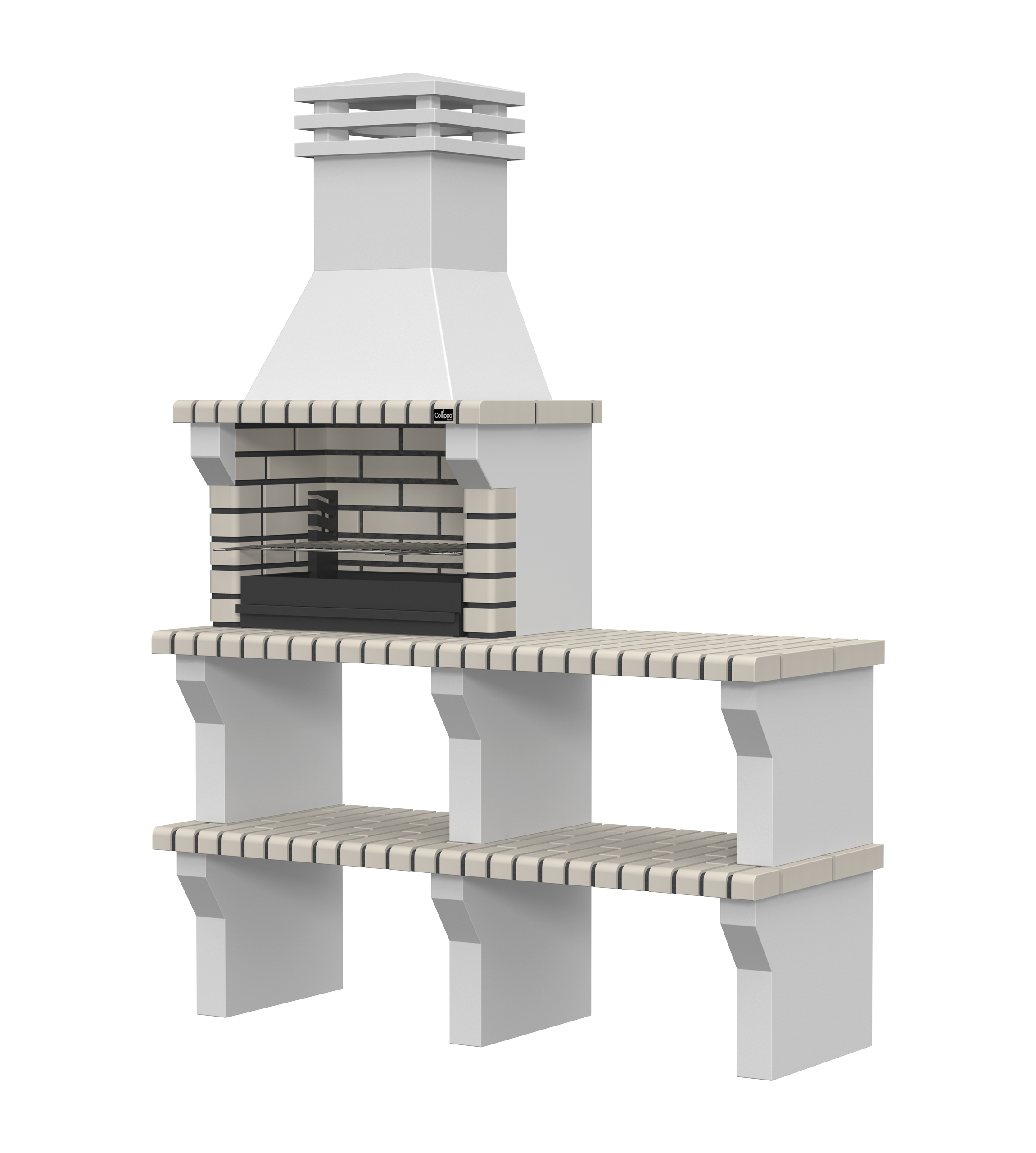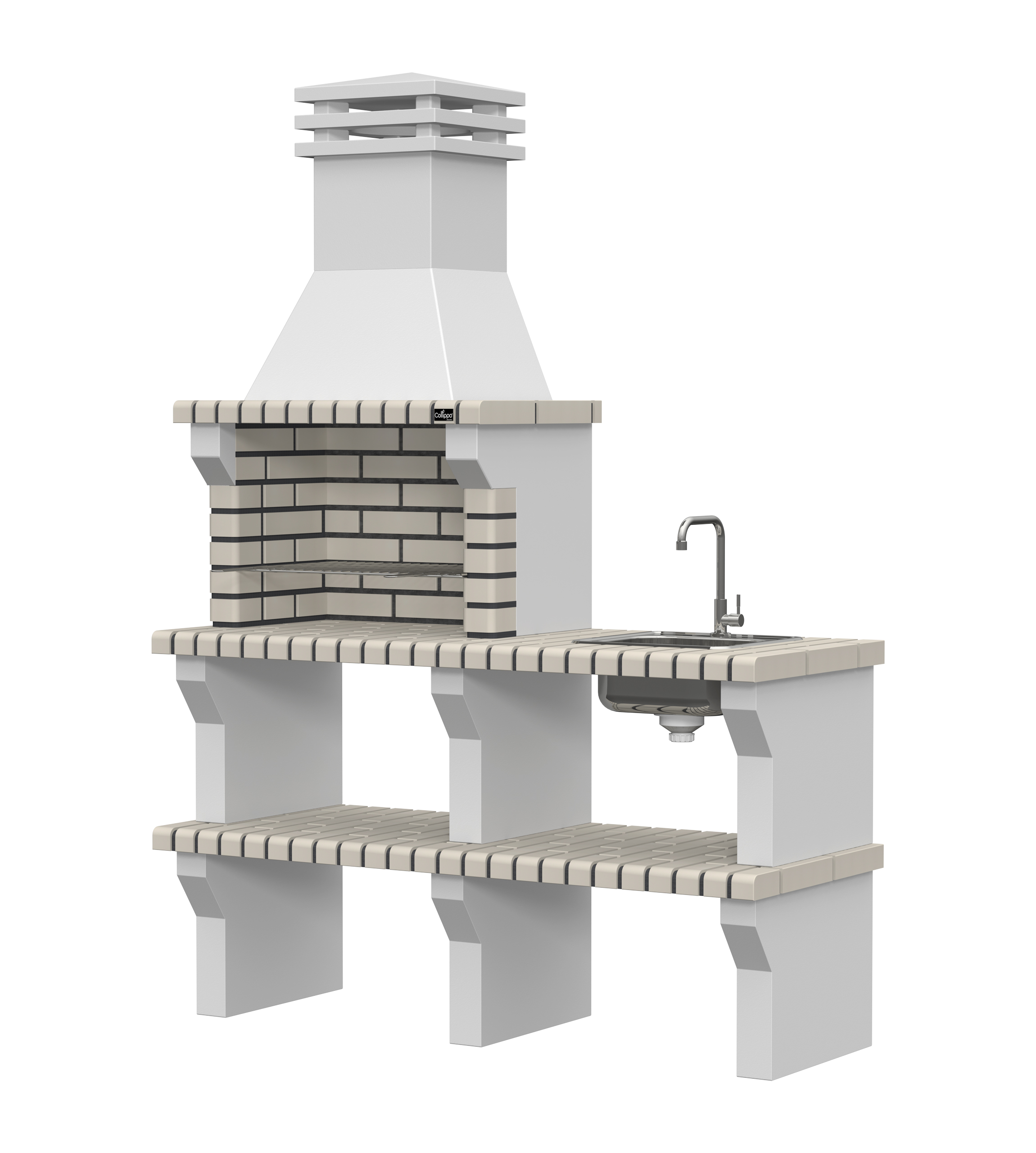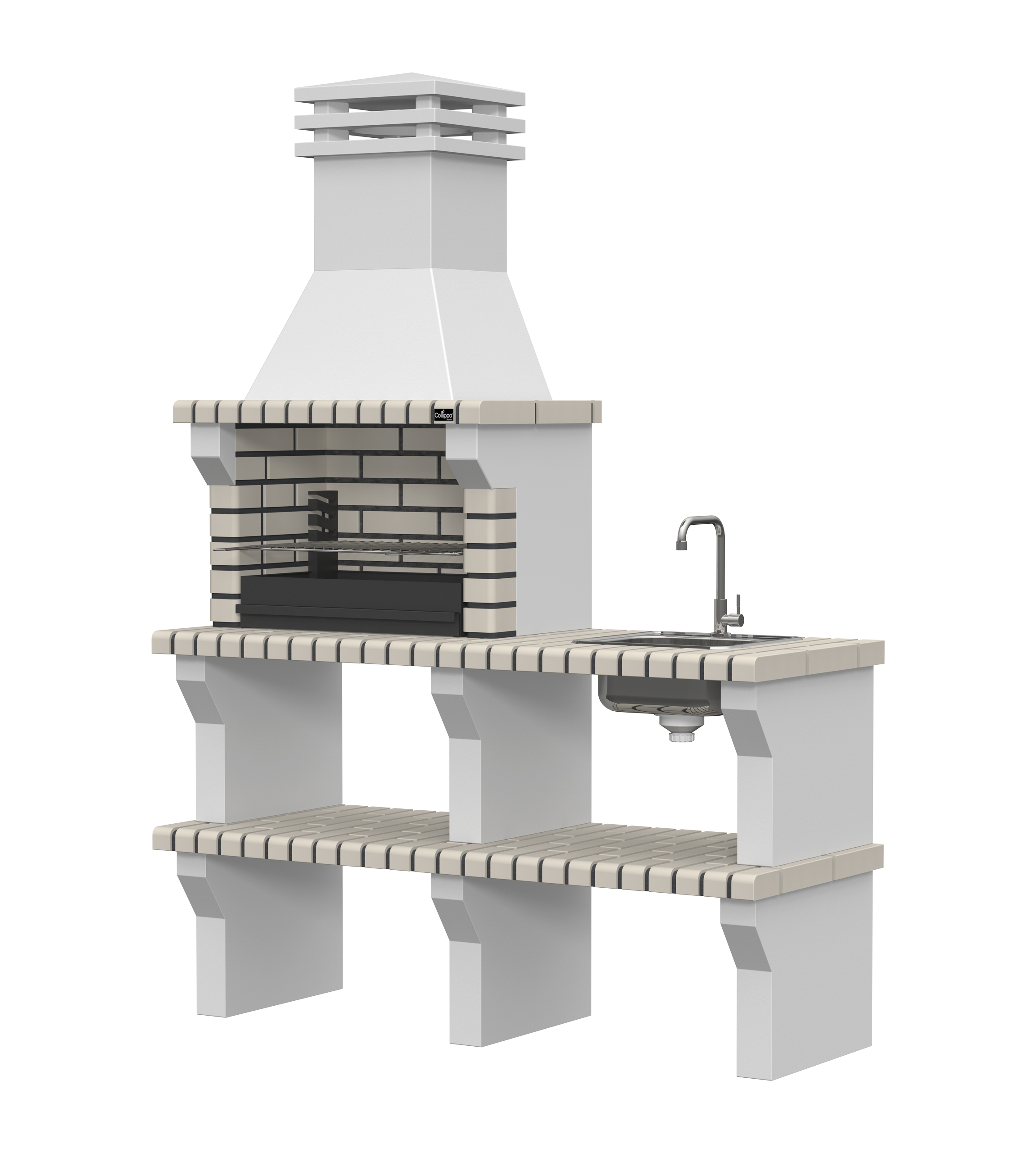 Peças em micro betão cinzento liso e micro betão cinzento texturado; zona de fogo em tijolo e cimento refractário