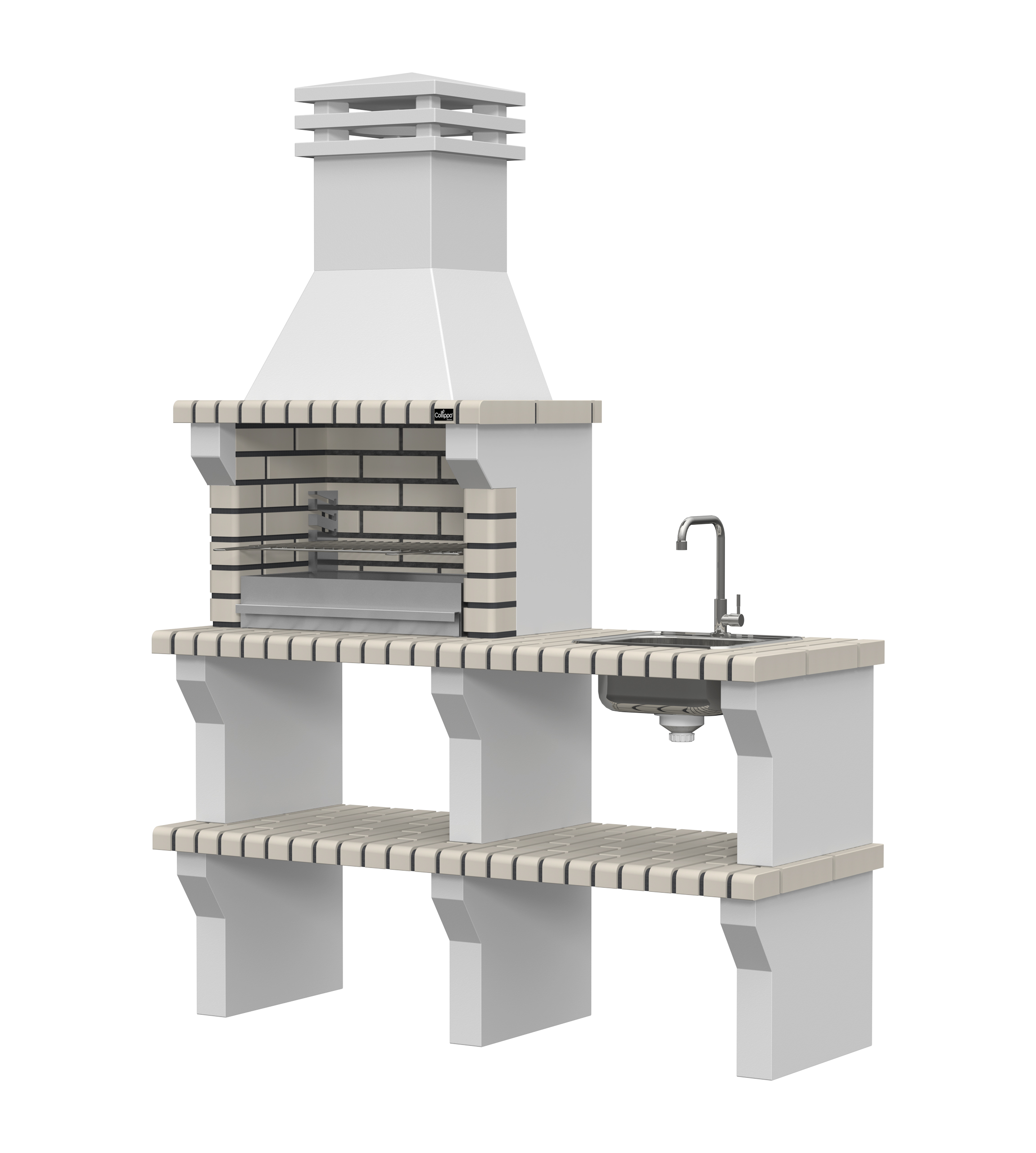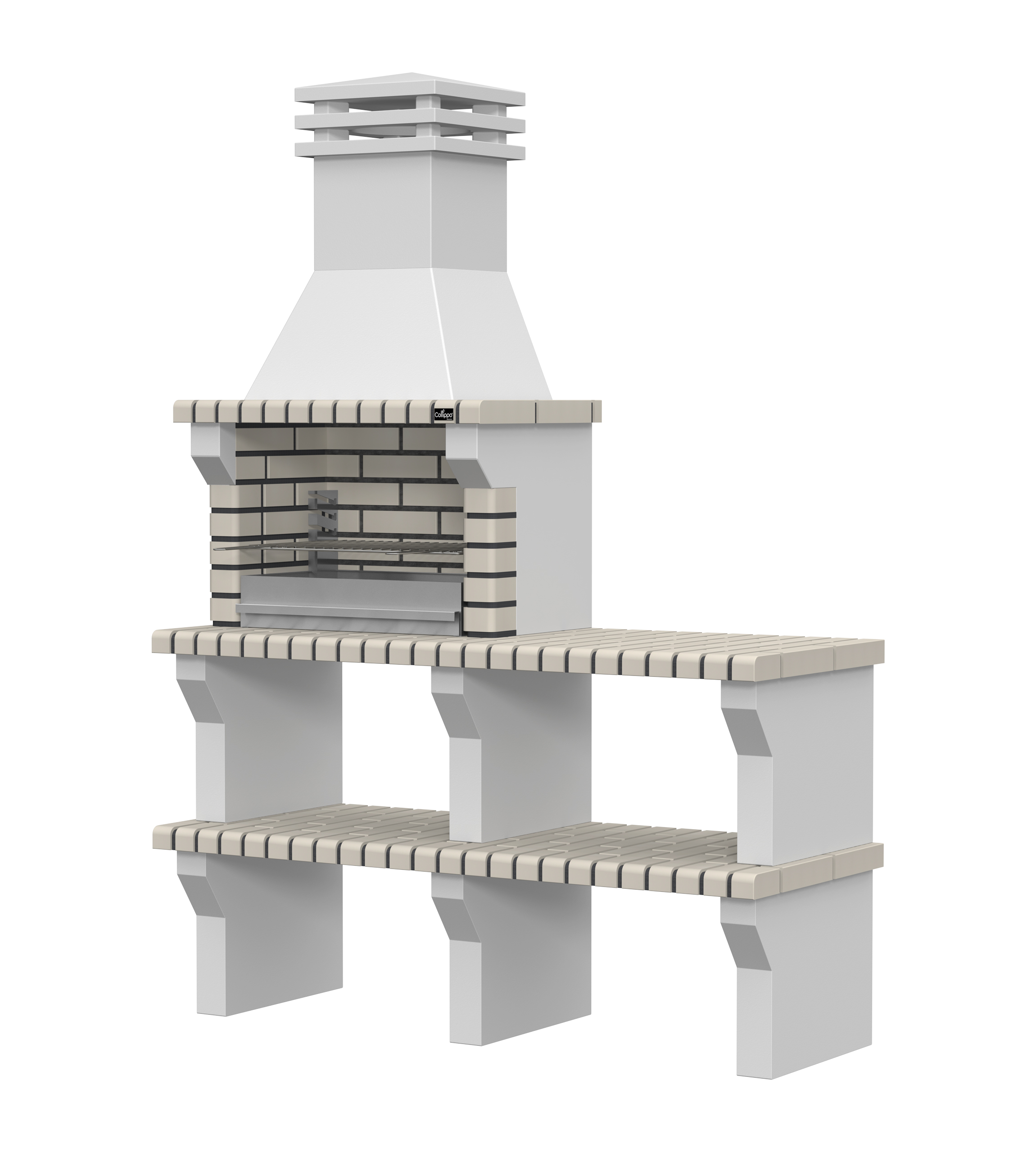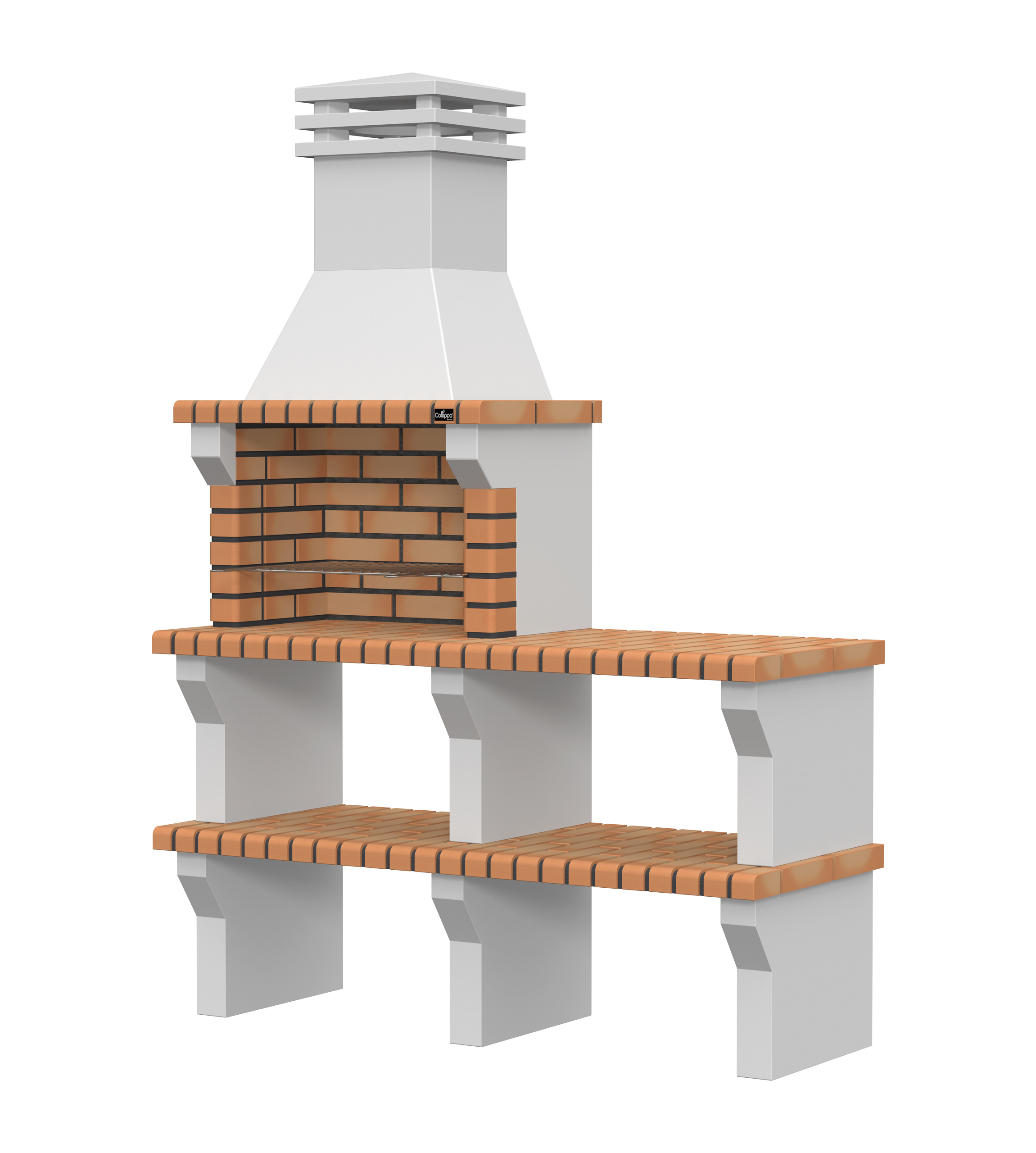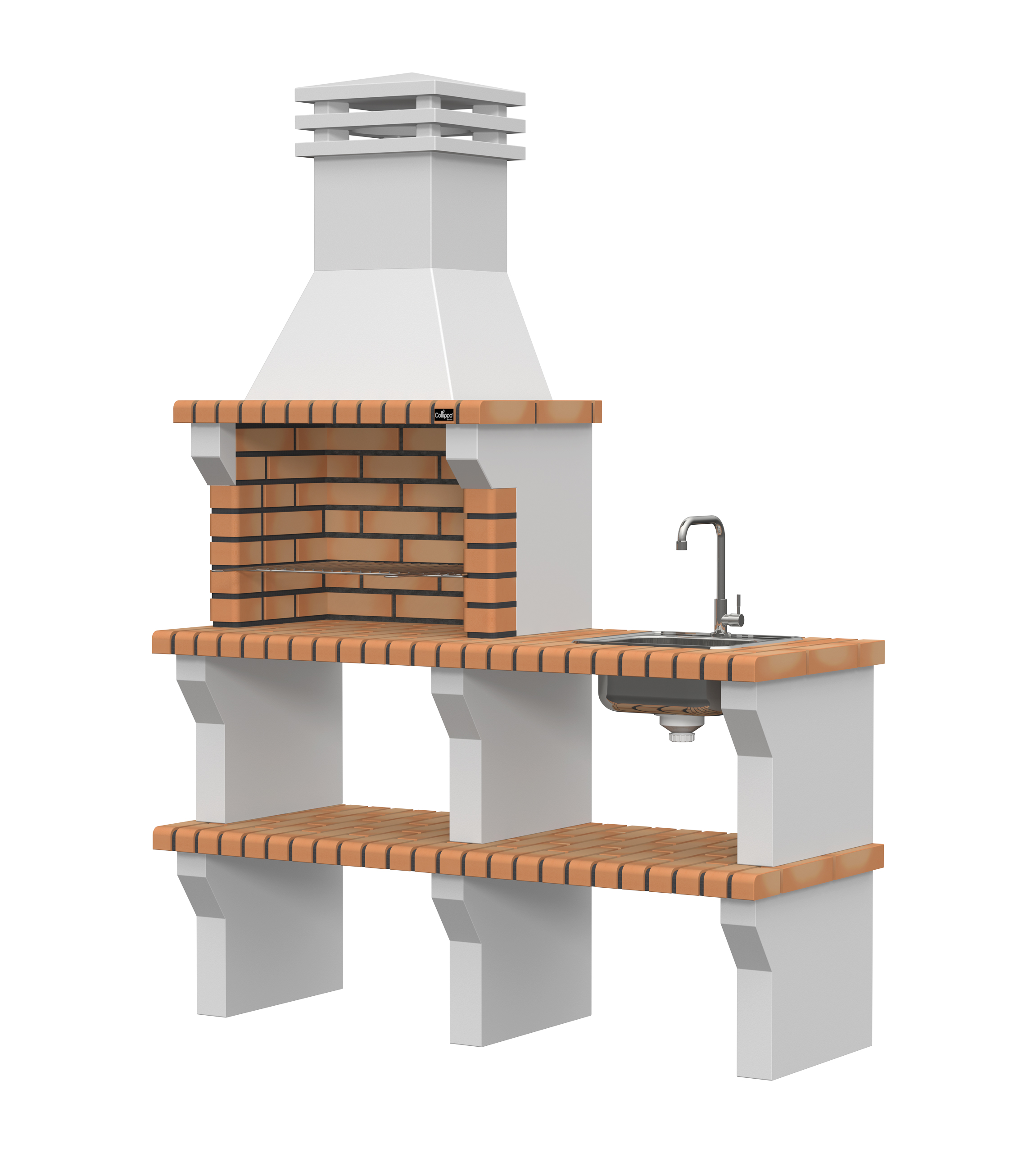 Peças em micro betão cinzento liso e micro betão cinzento texturado; zona de fogo em tijolo e cimento refractário