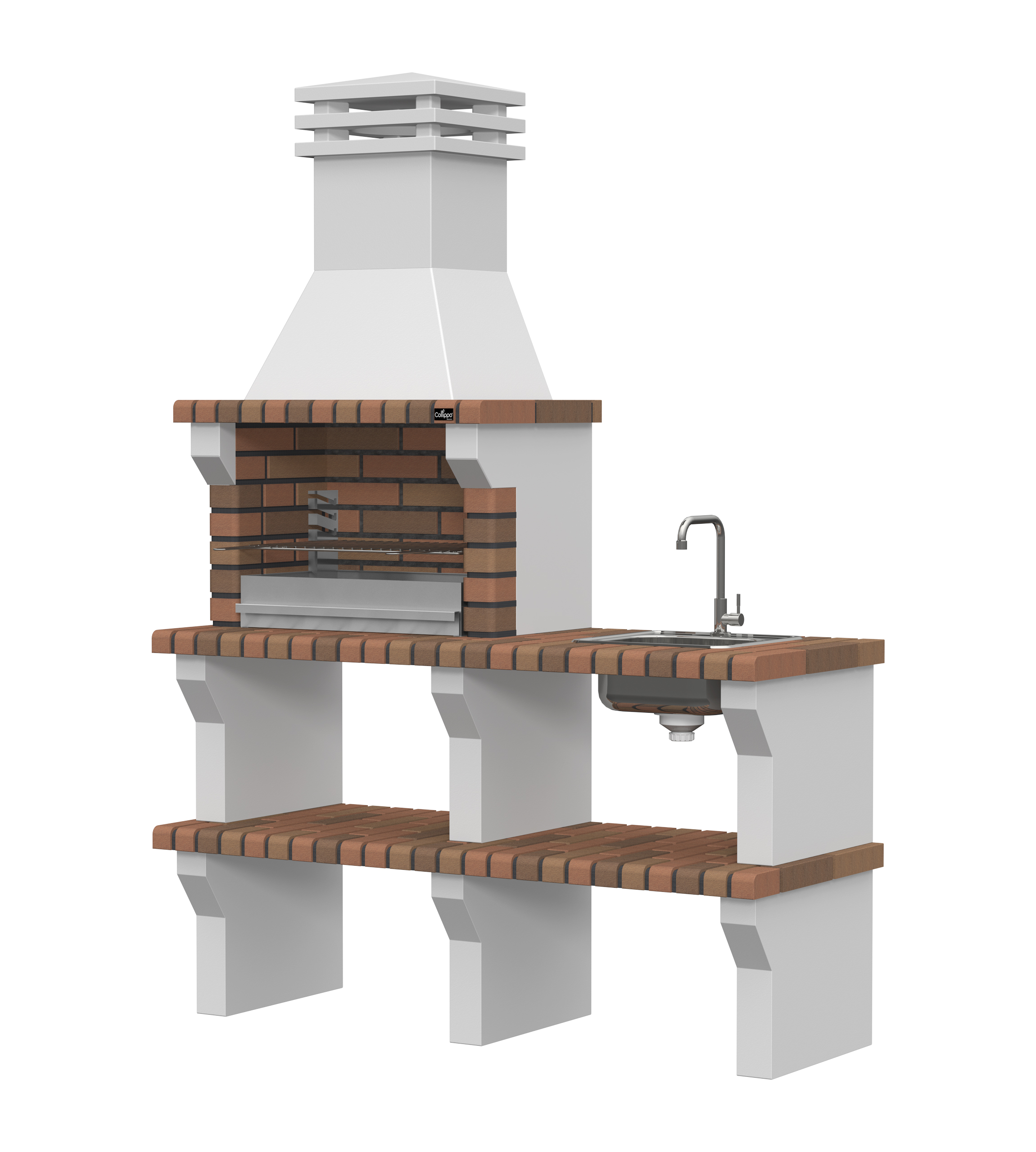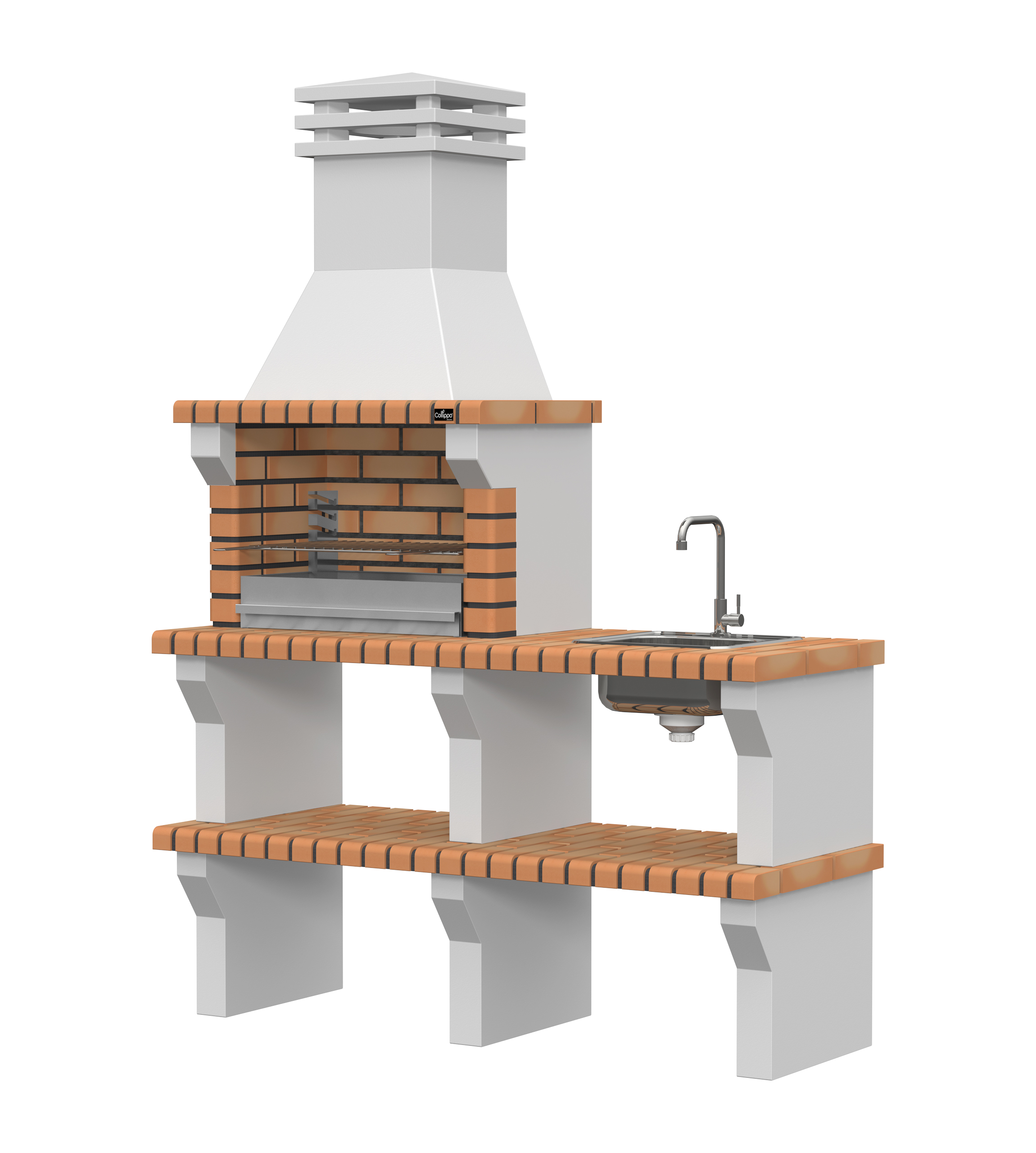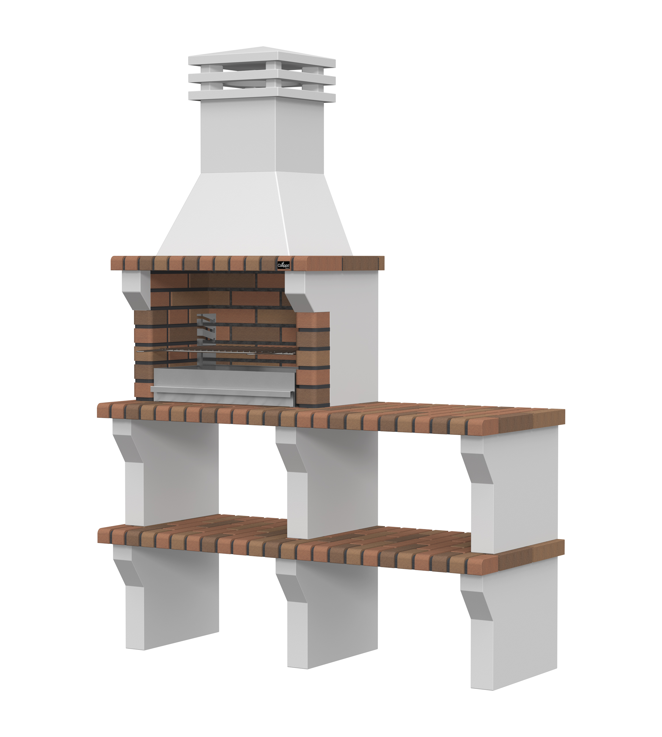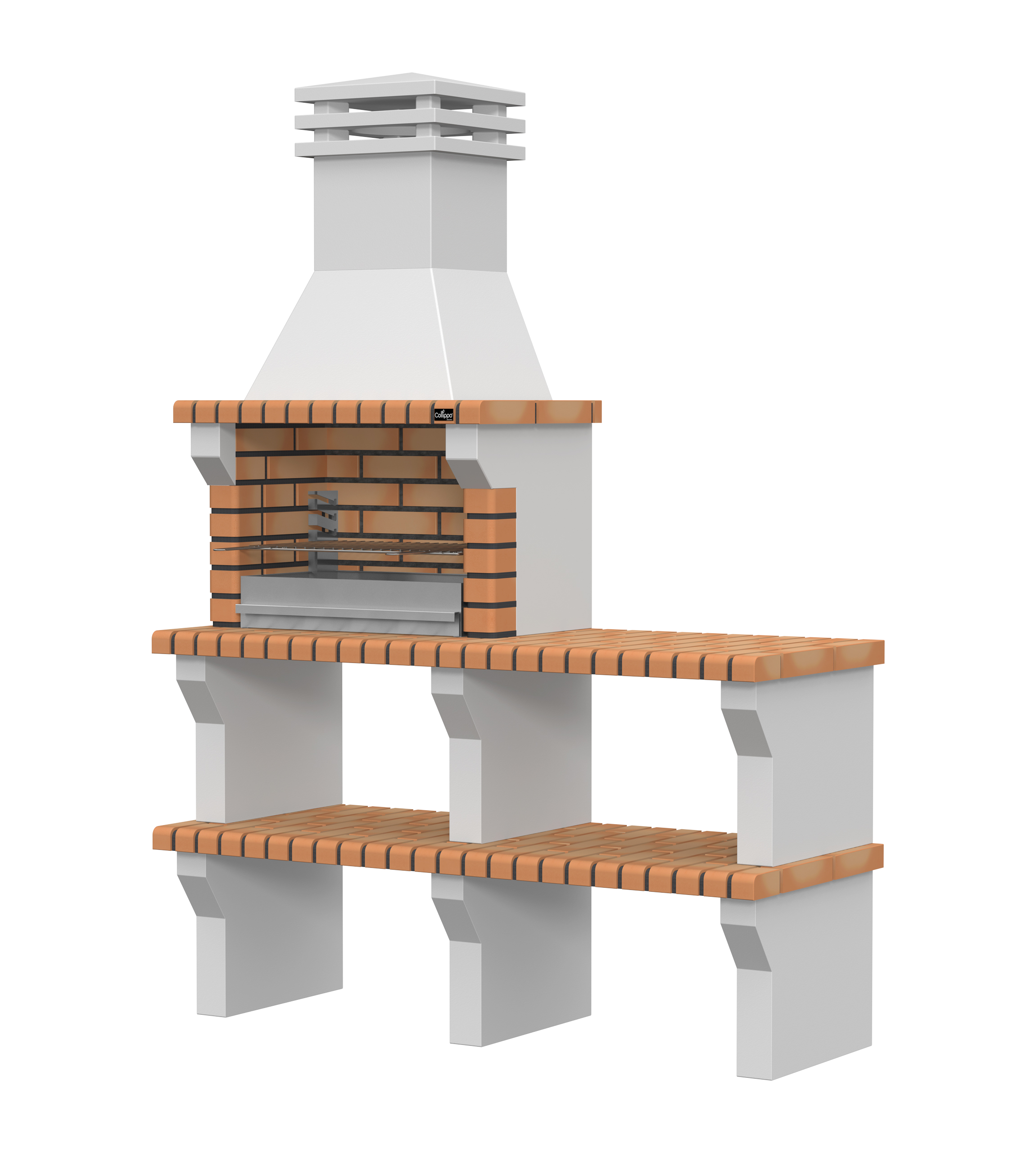 Peças em micro betão cinzento liso e micro betão cinzento texturado; zona de fogo em tijolo e cimento refractário