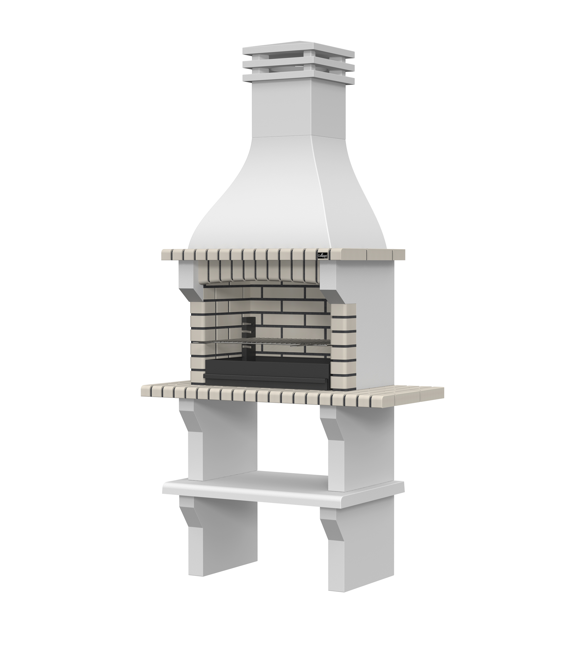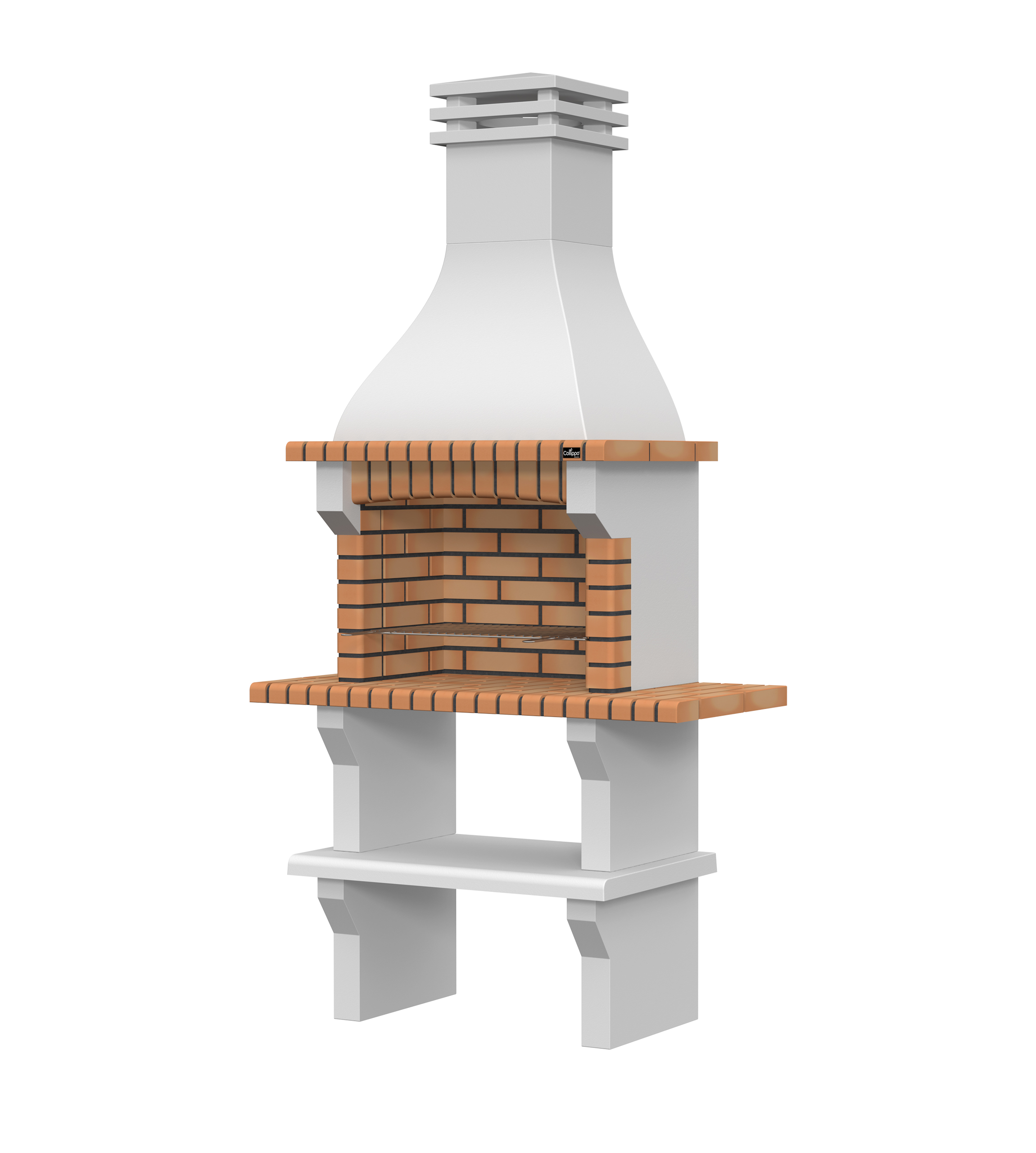 Peças em micro betão cinzento liso e micro betão cinzento texturado; zona de fogo em tijolo e cimento refractário