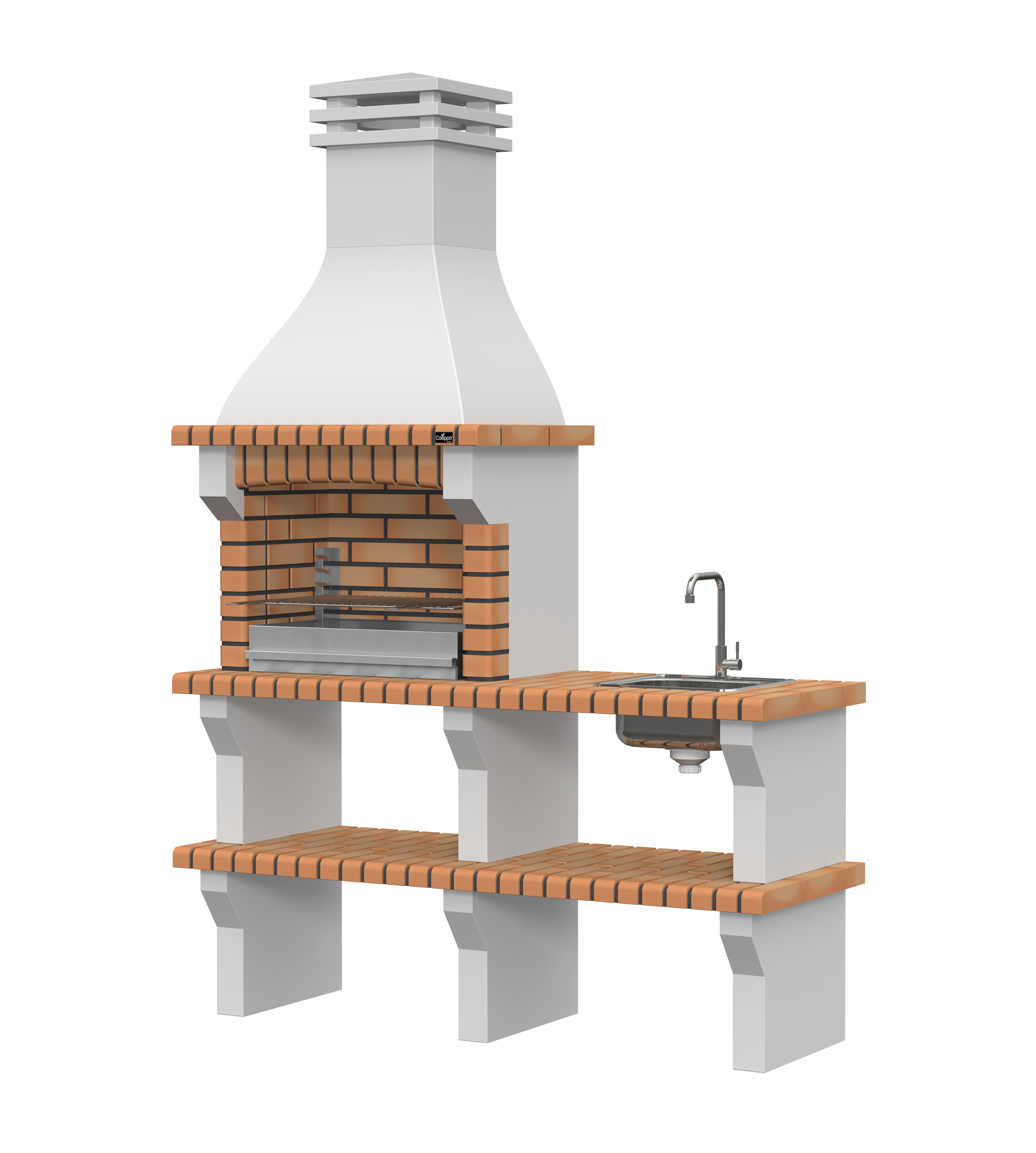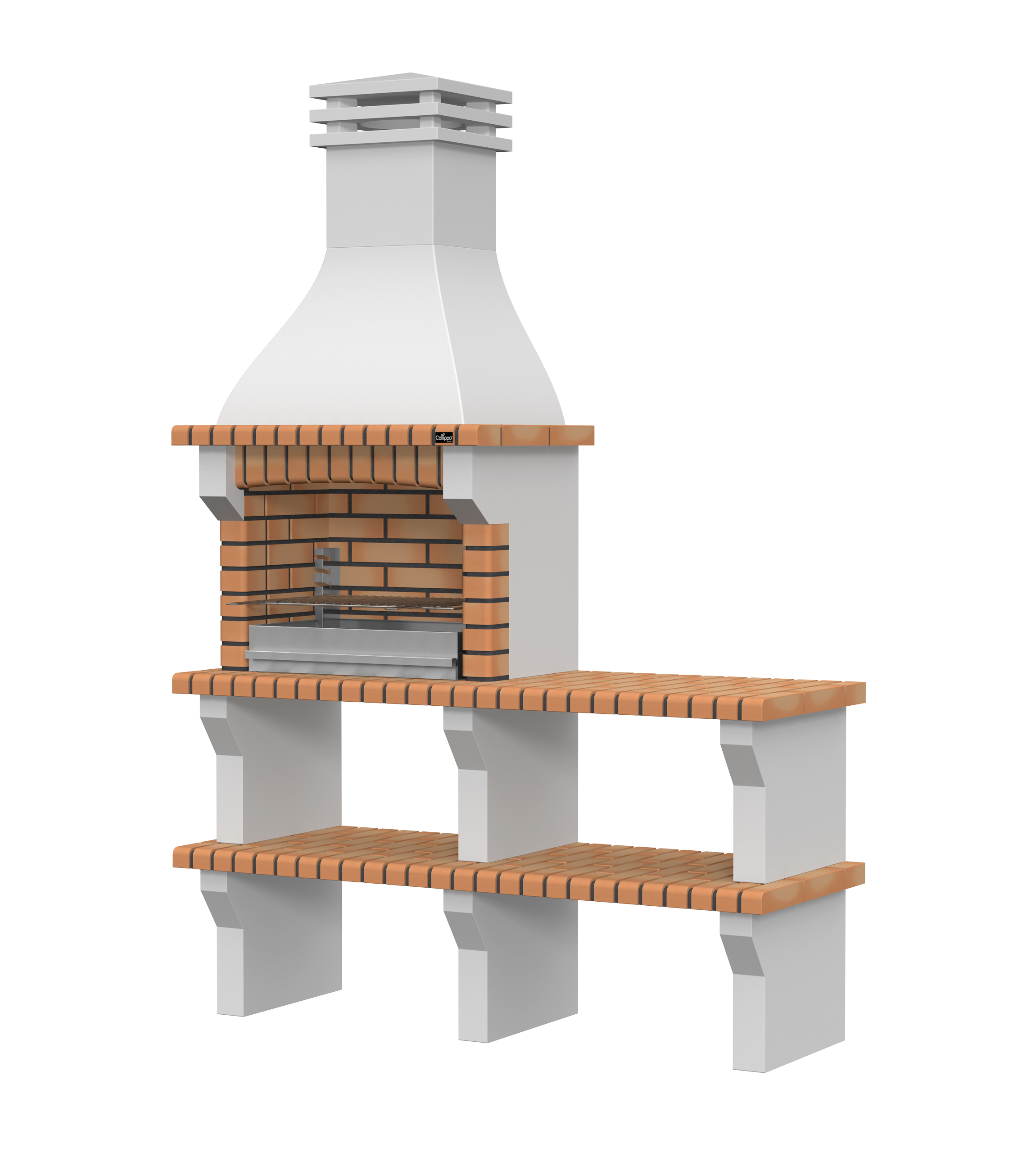 Peças em micro betão cinzento liso e micro betão cinzento texturado; zona de fogo em tijolo e cimento refractário