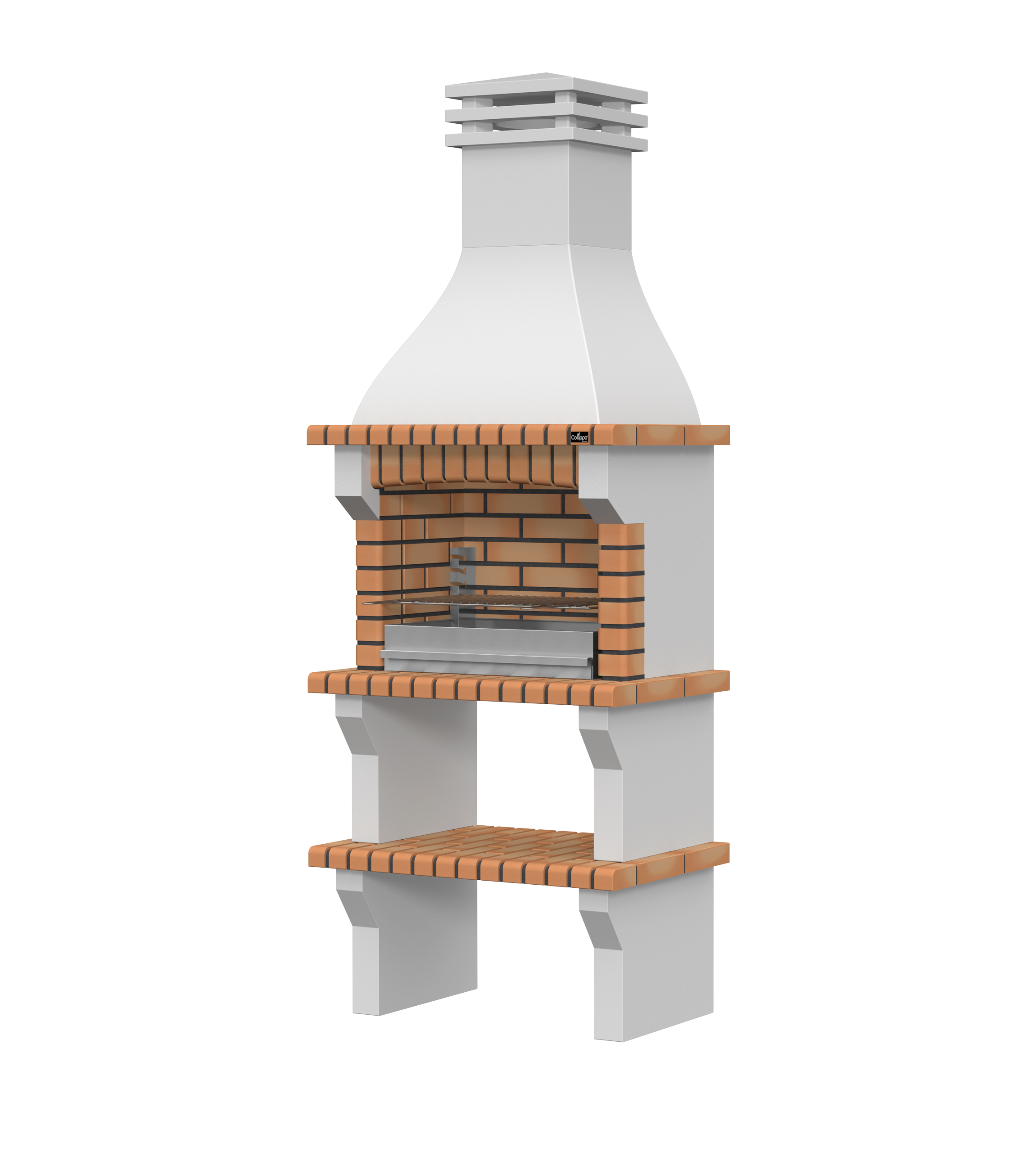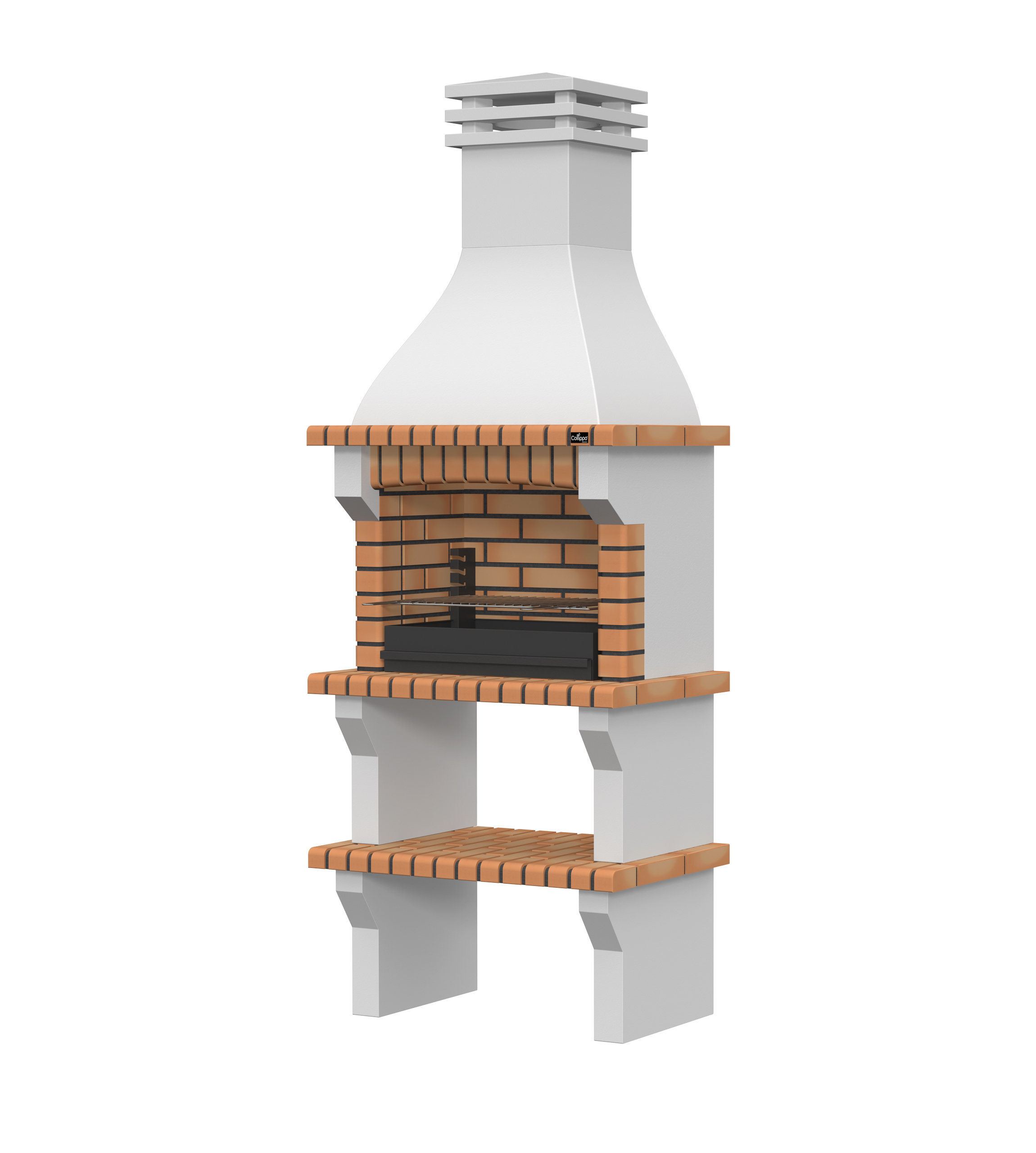 Peças em micro betão cinzento liso e micro betão cinzento texturado; zona de fogo em tijolo e cimento refractário