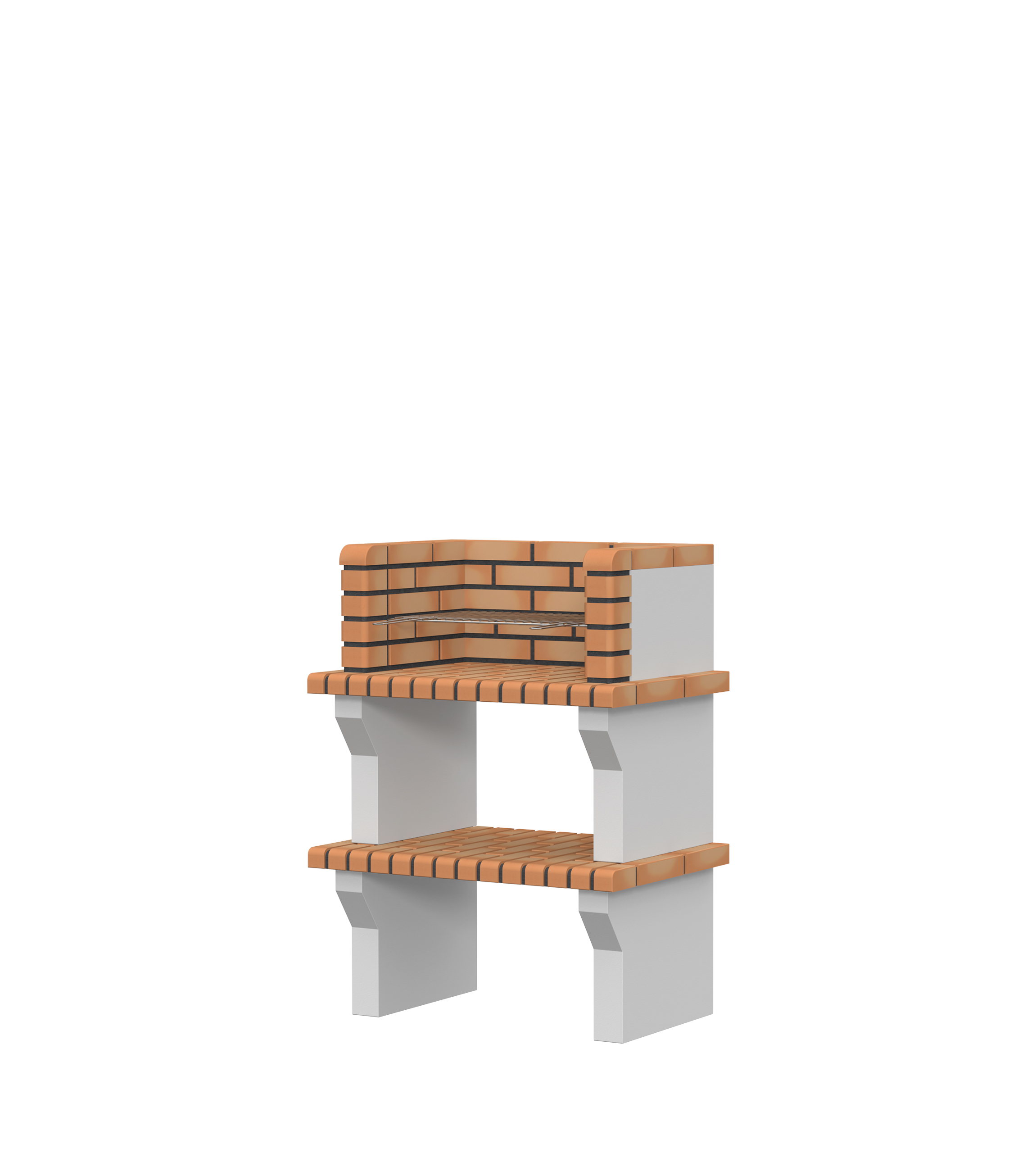 Pés e lateral em micro betão cinzento texturado; prateleira em tijolo; zona de fogo em tijolo e cimento refractário.
