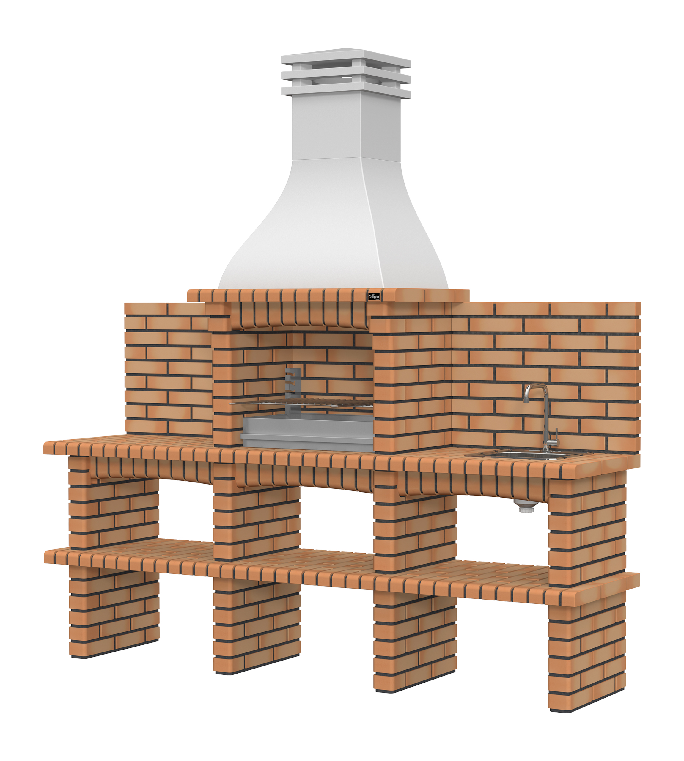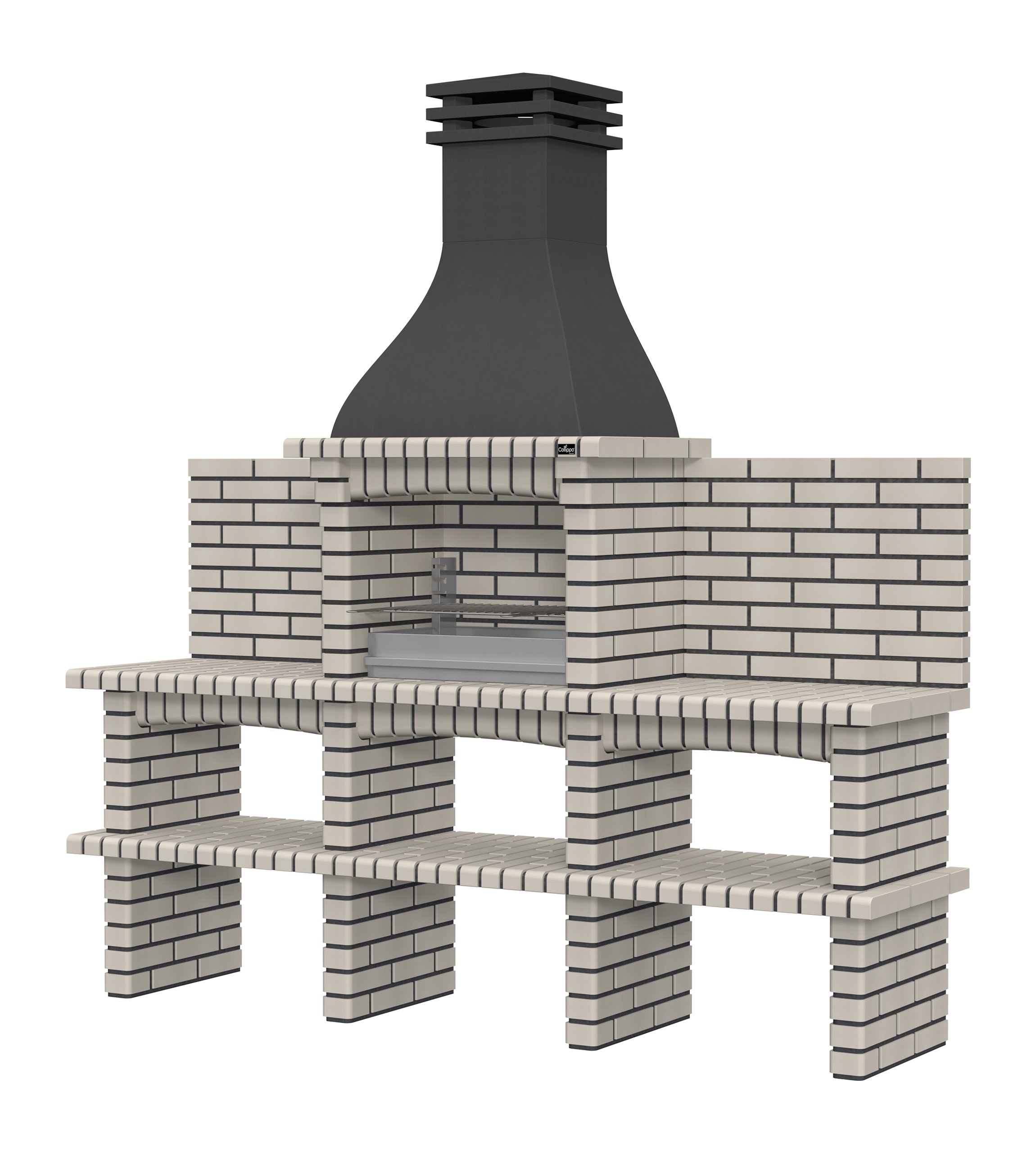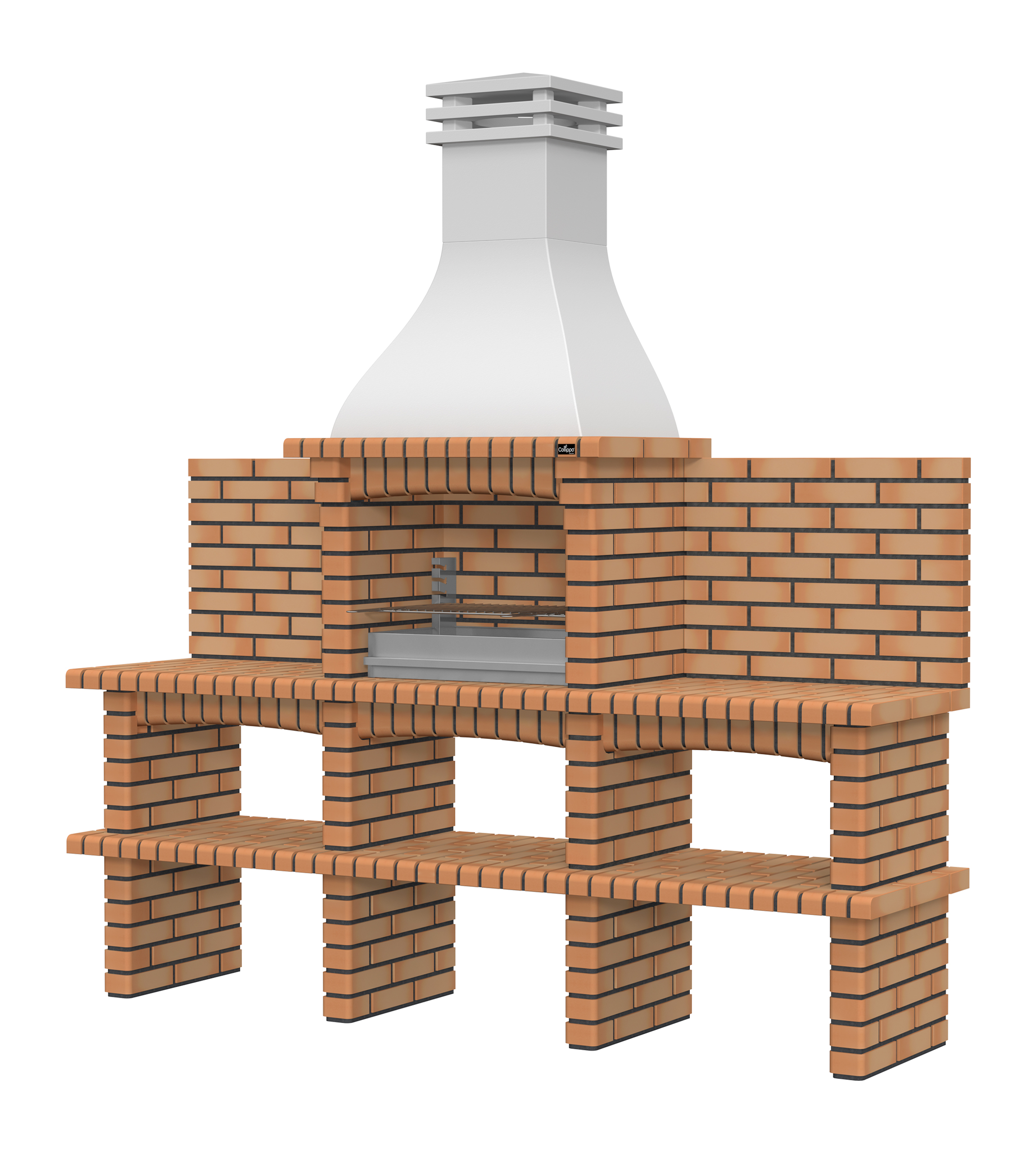Chaminé em branco liso ou com pintura preta; zona de fogo em tijolo e cimento refractário
