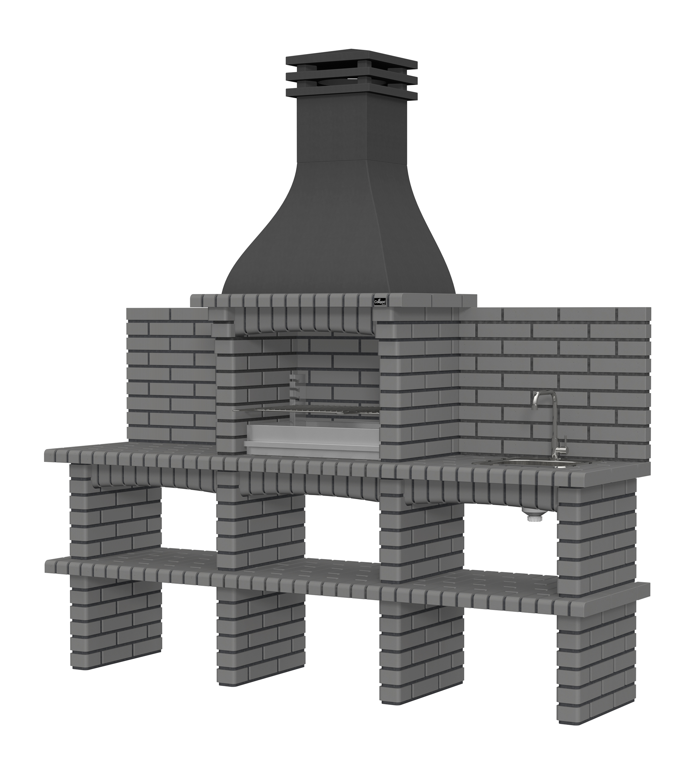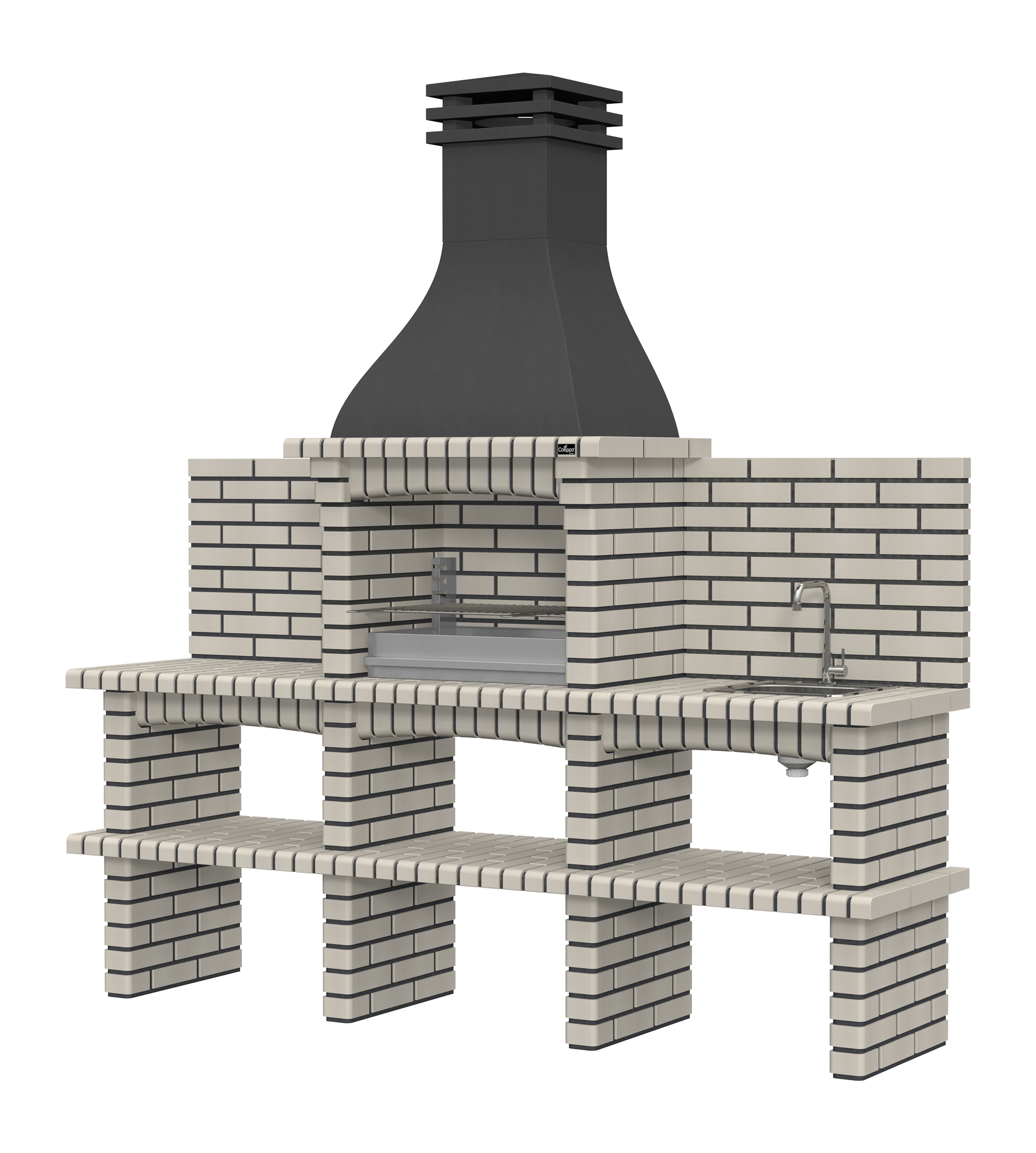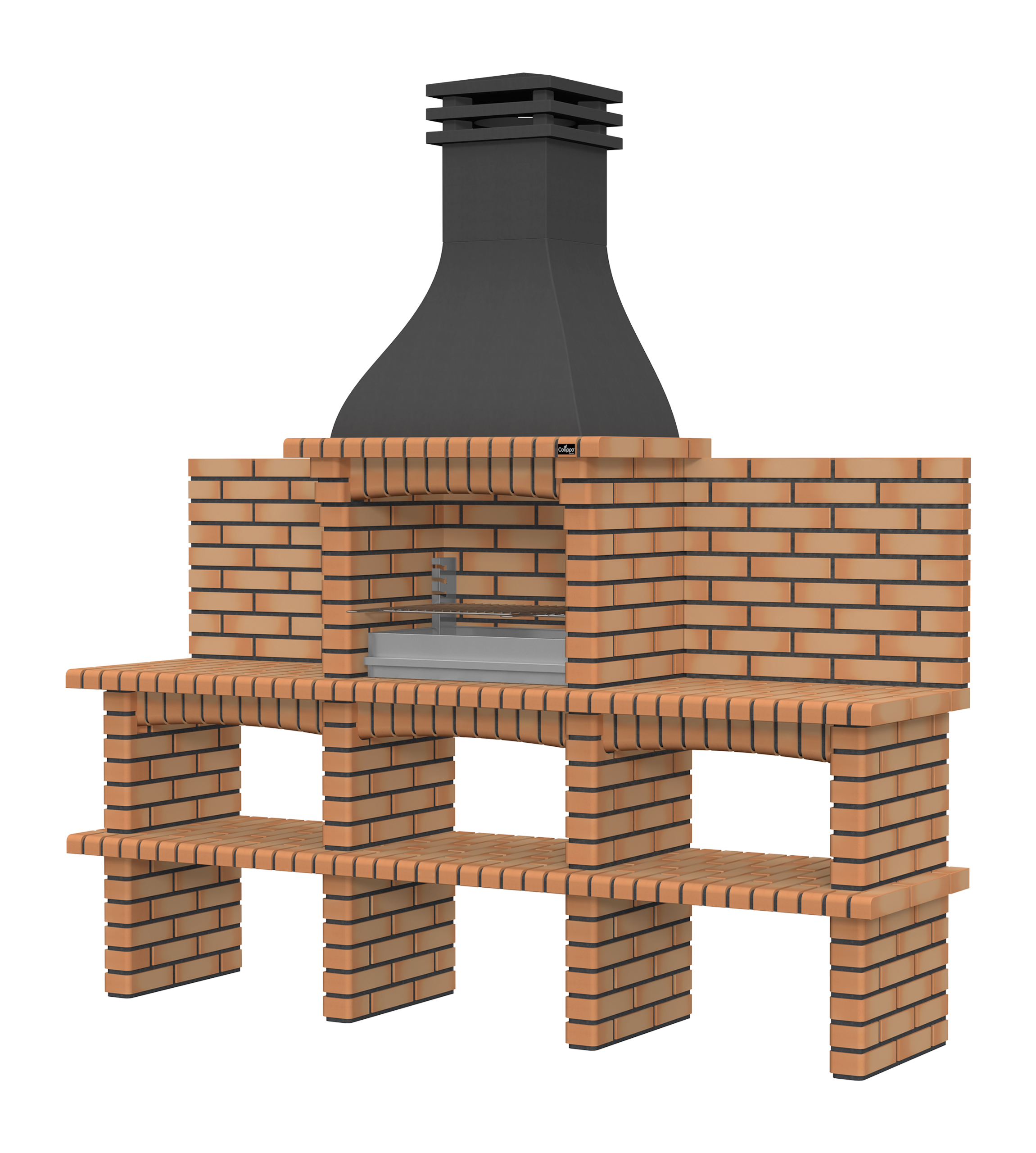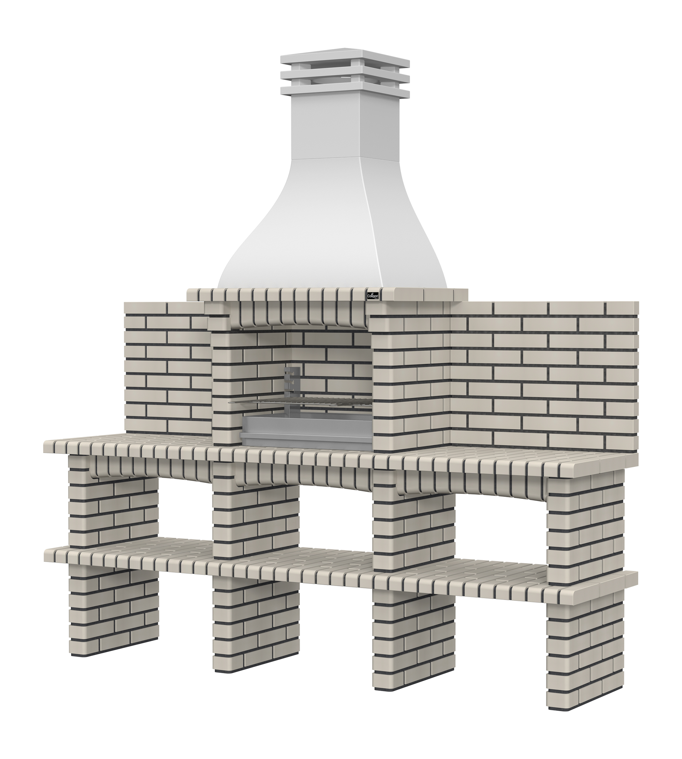 Chaminé em branco liso ou com pintura preta; zona de fogo em tijolo e cimento refractário