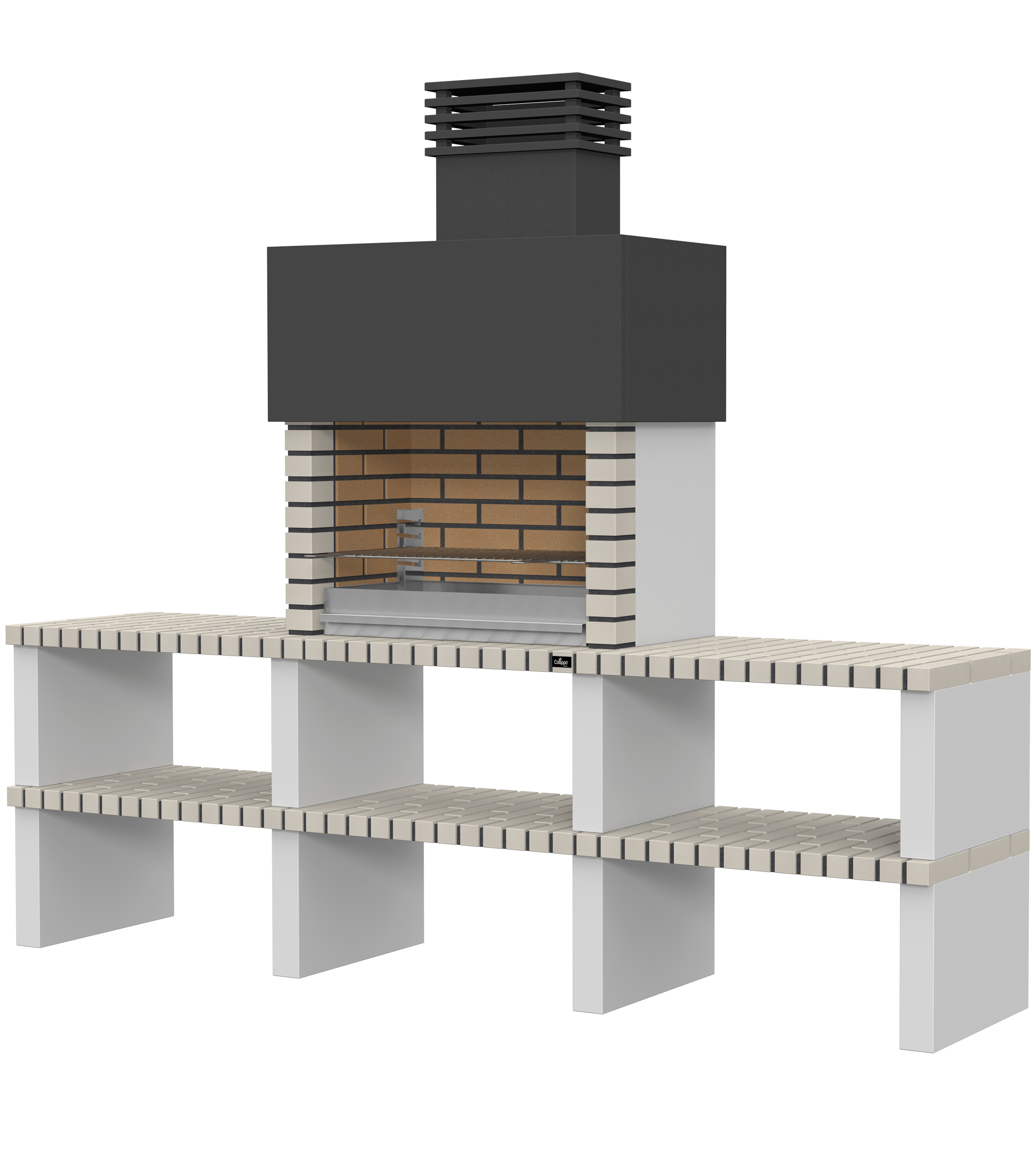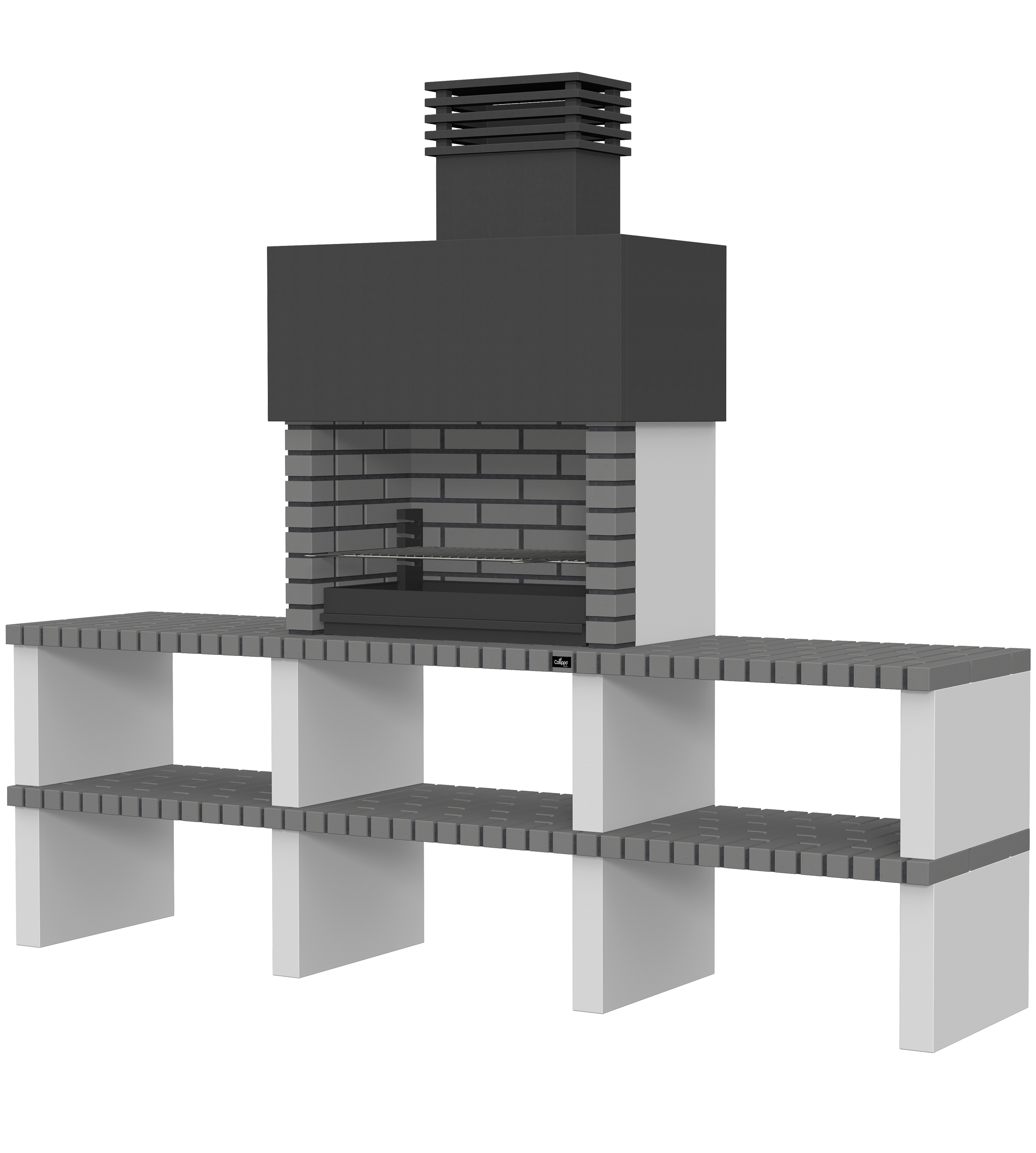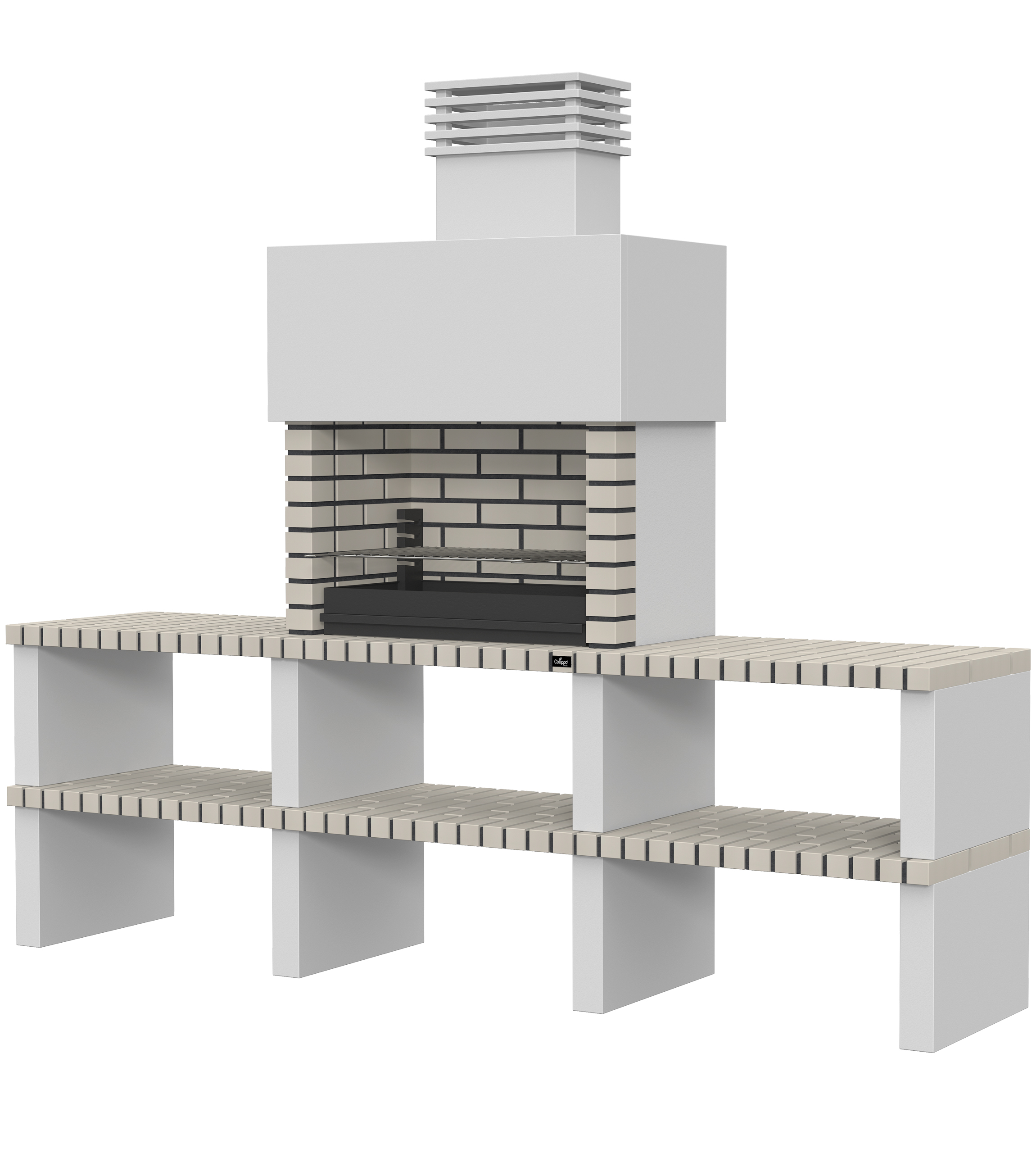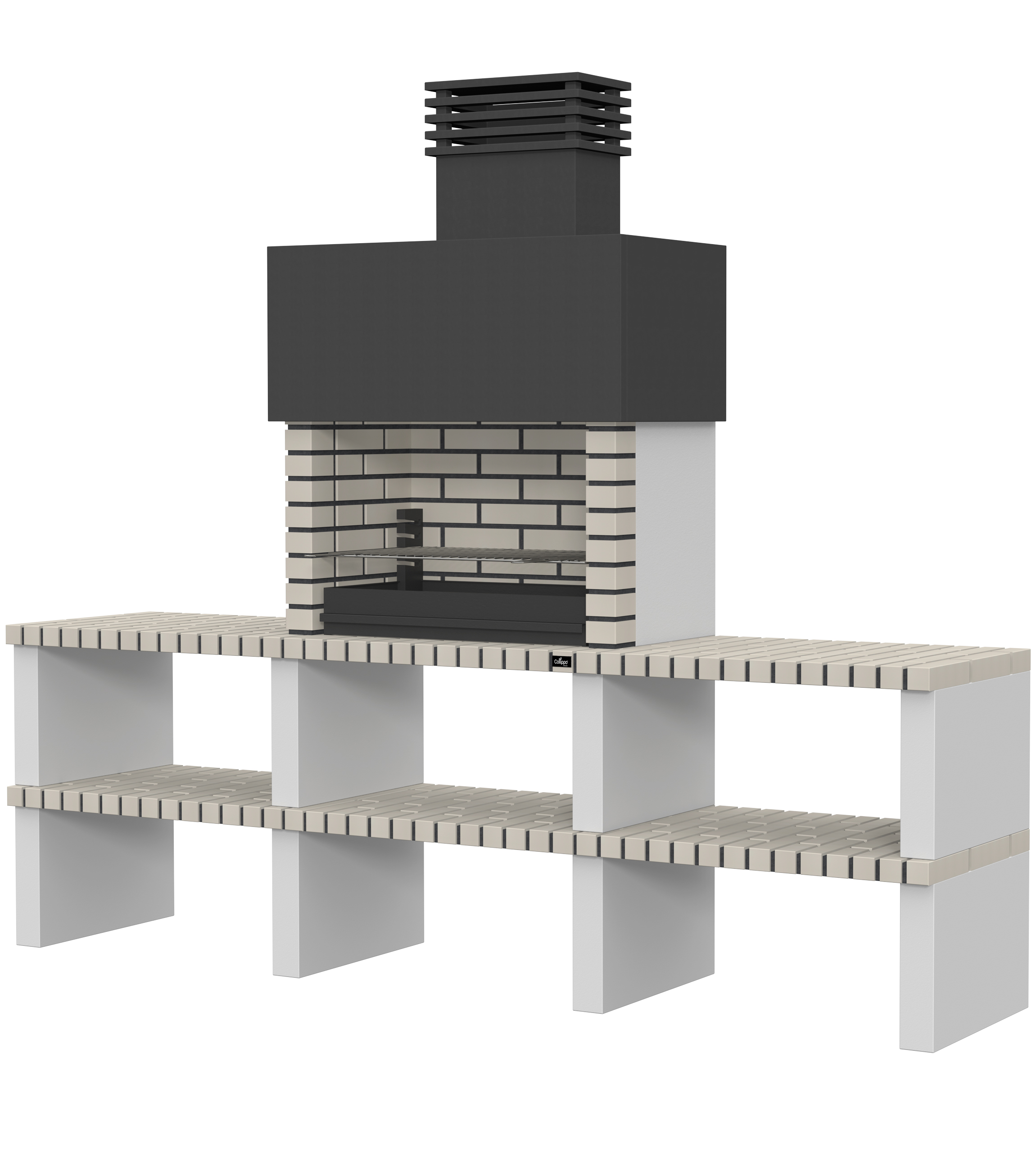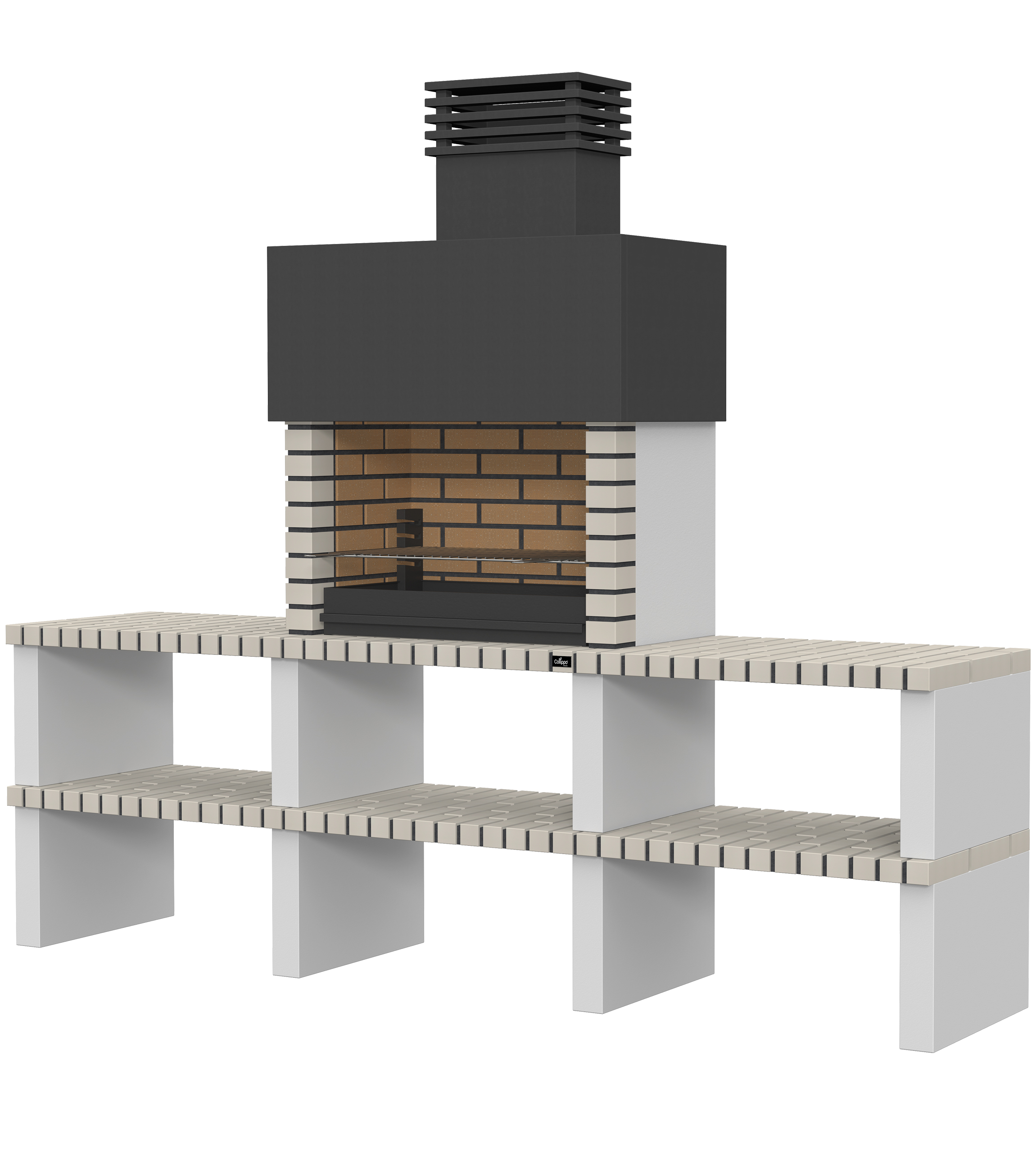 Micro betão liso branco; laterais em micro betão texturado cinzento; peças com pintura preta; zona de fogo em tijolo e cimento refractário