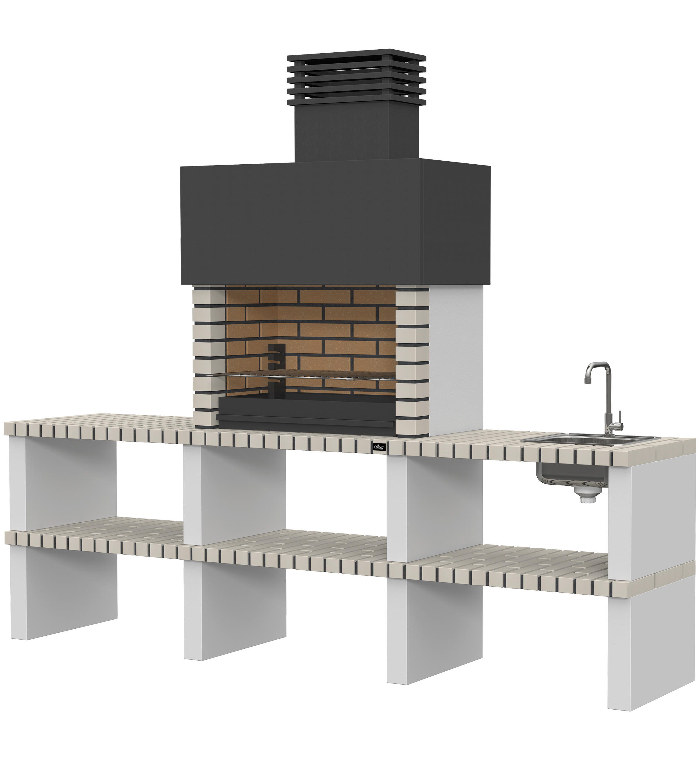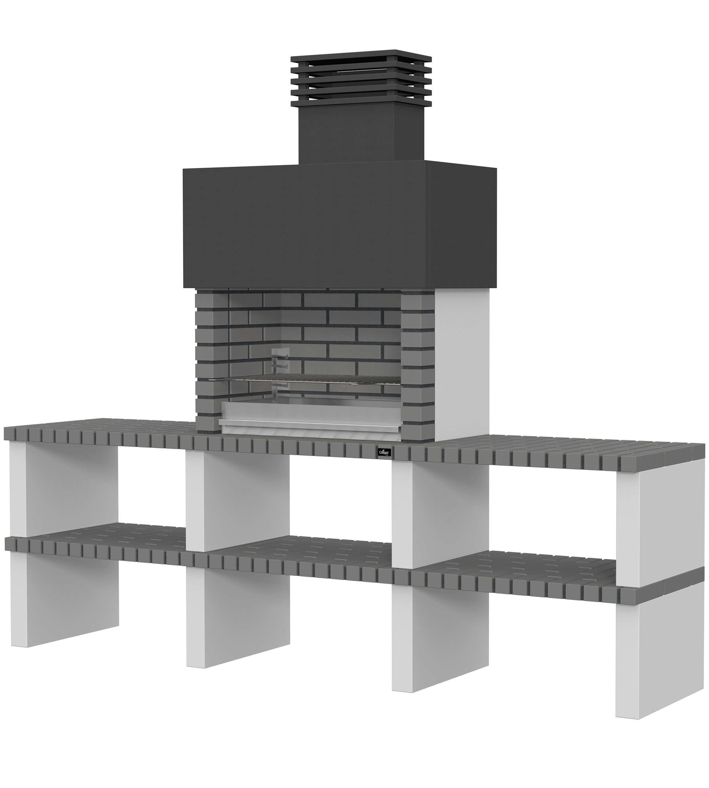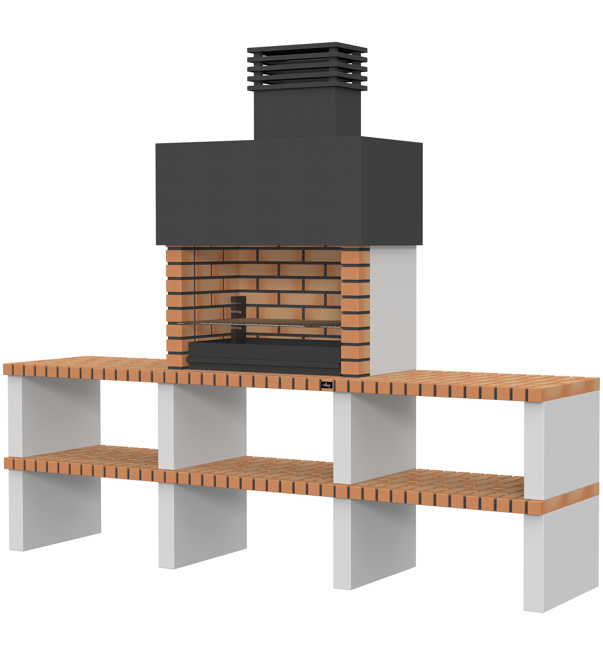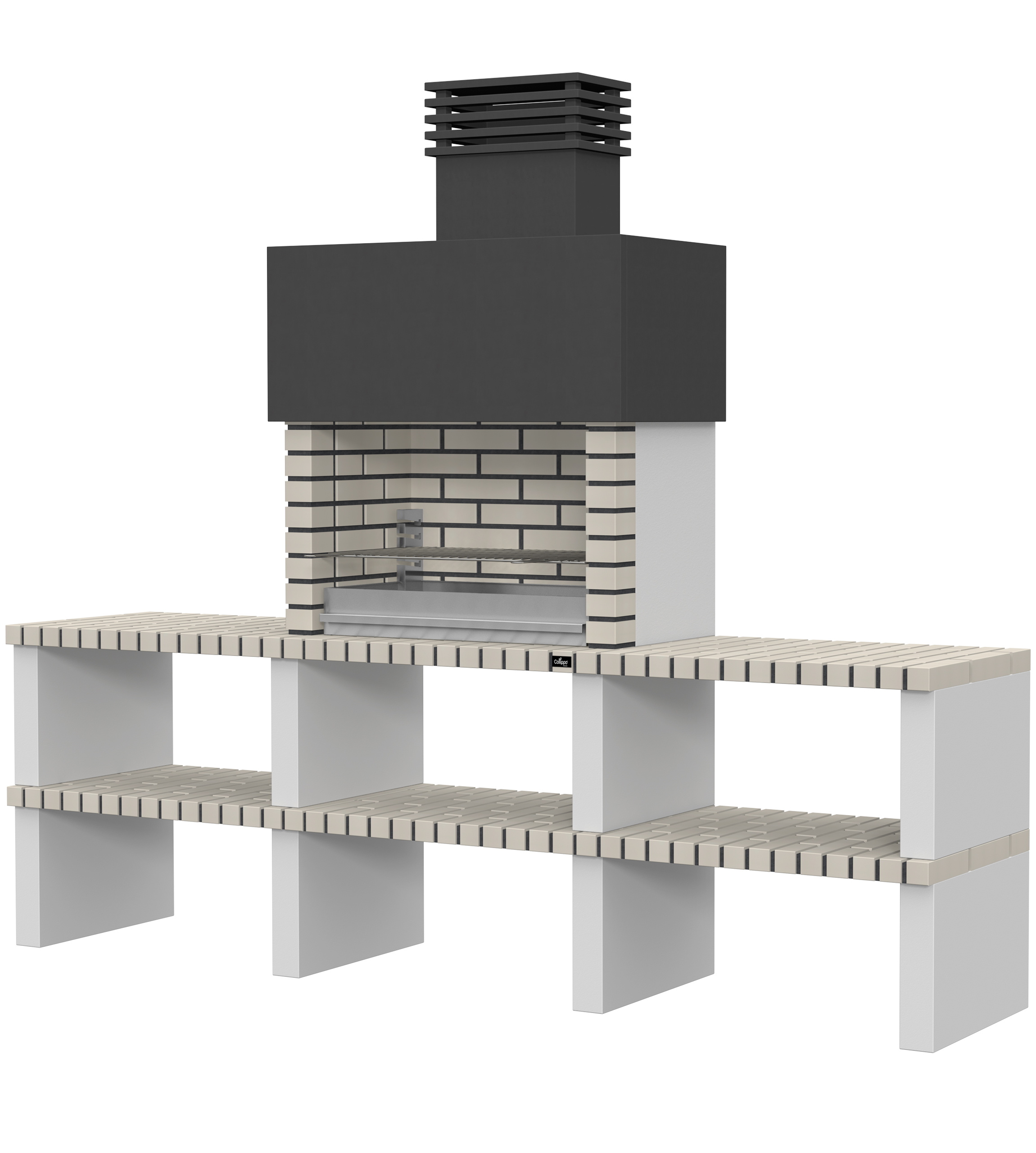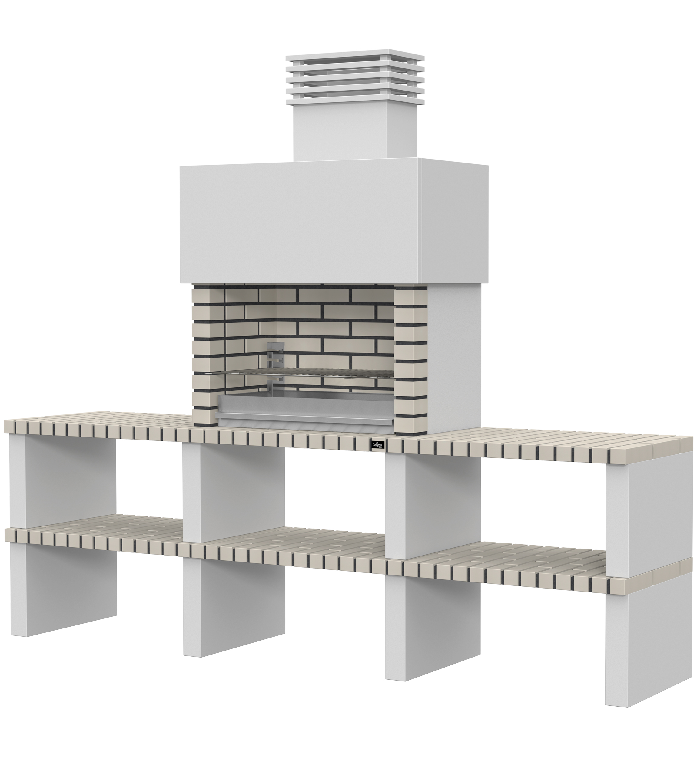 Micro betão liso branco; laterais em micro betão texturado cinzento; peças com pintura preta; zona de fogo em tijolo e cimento refractário