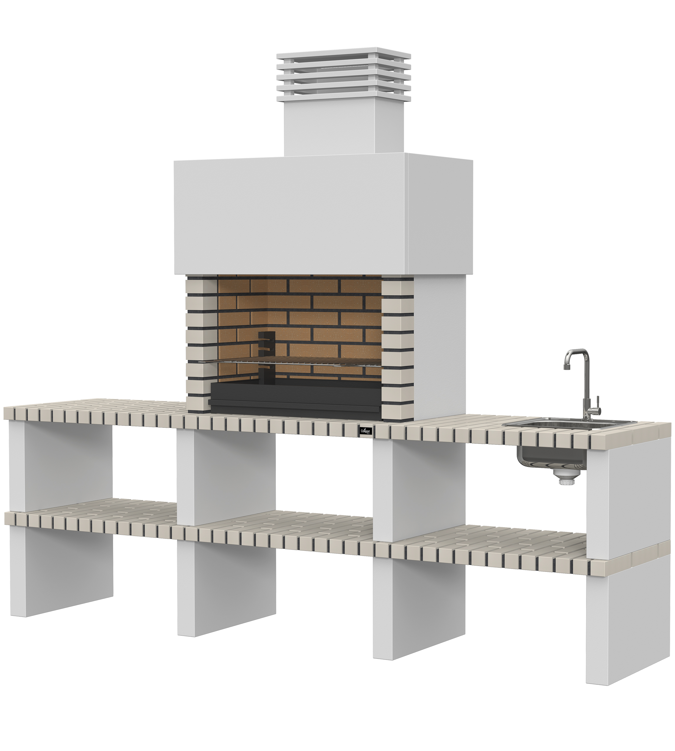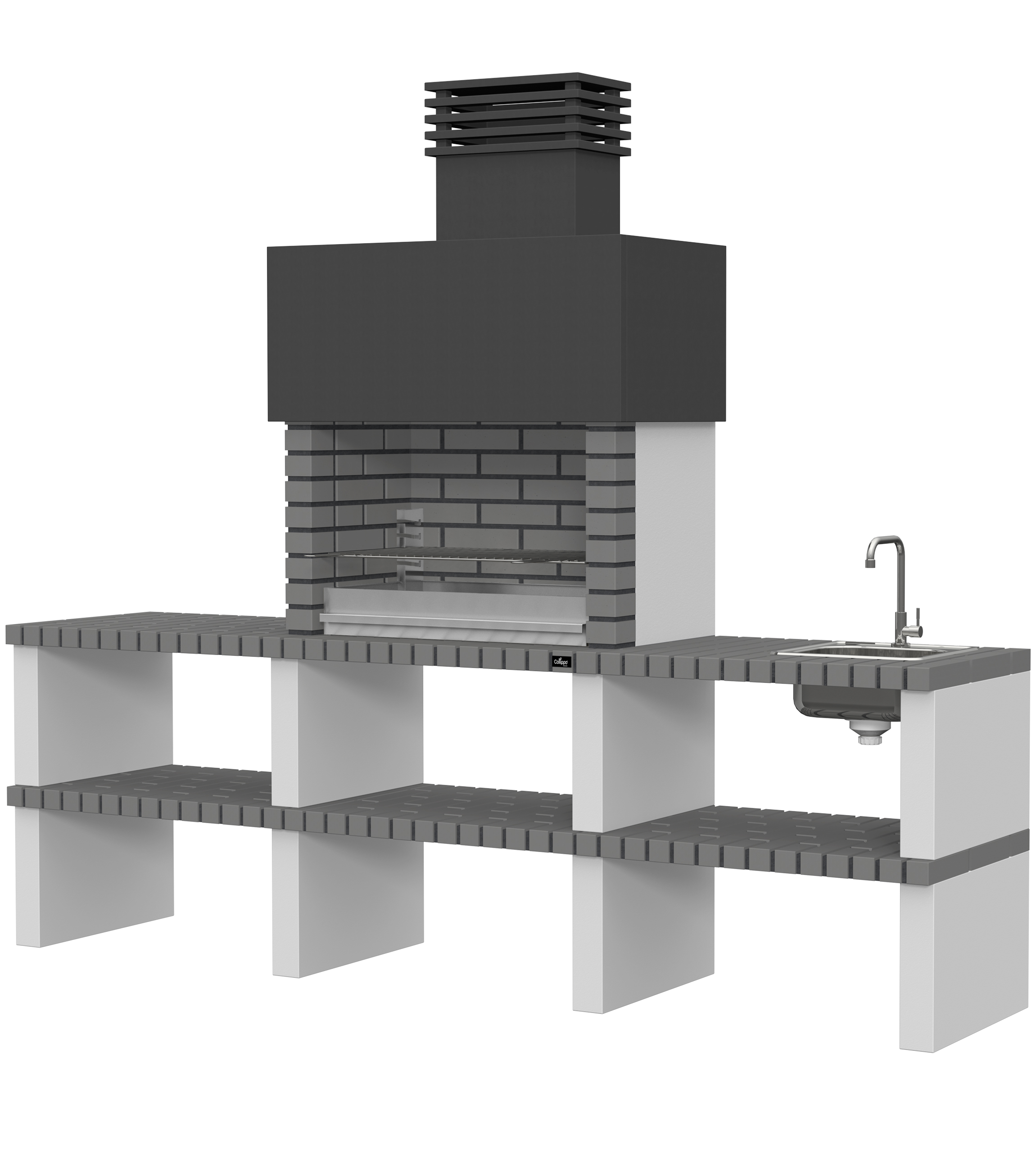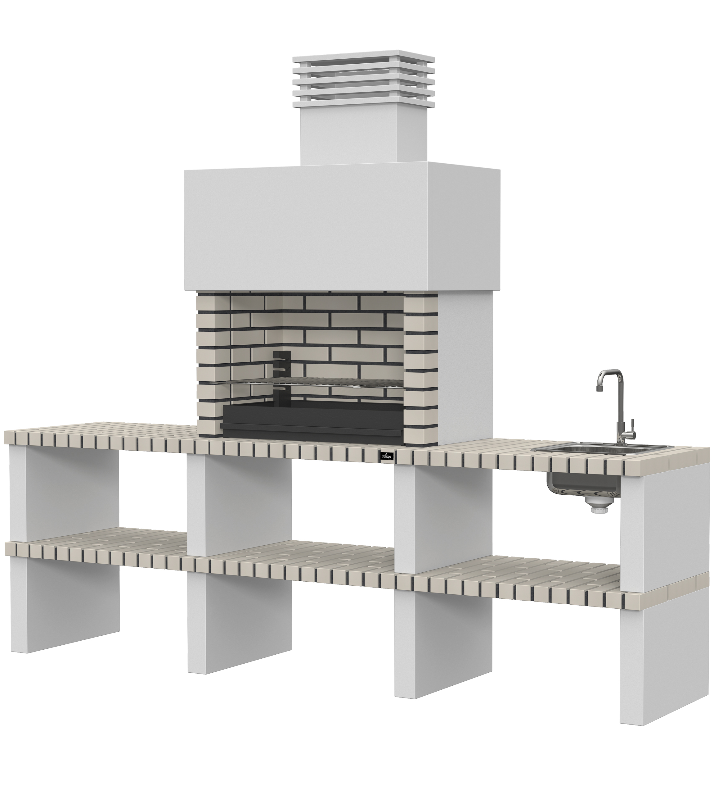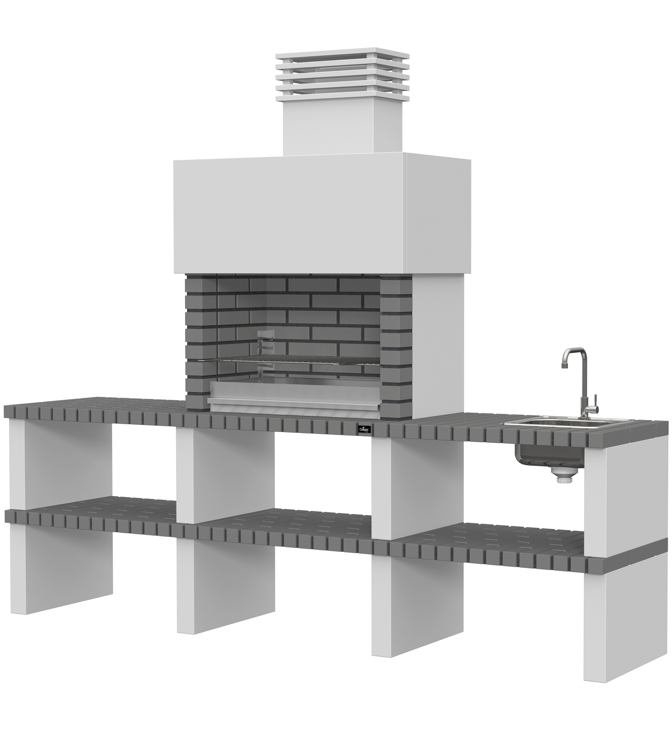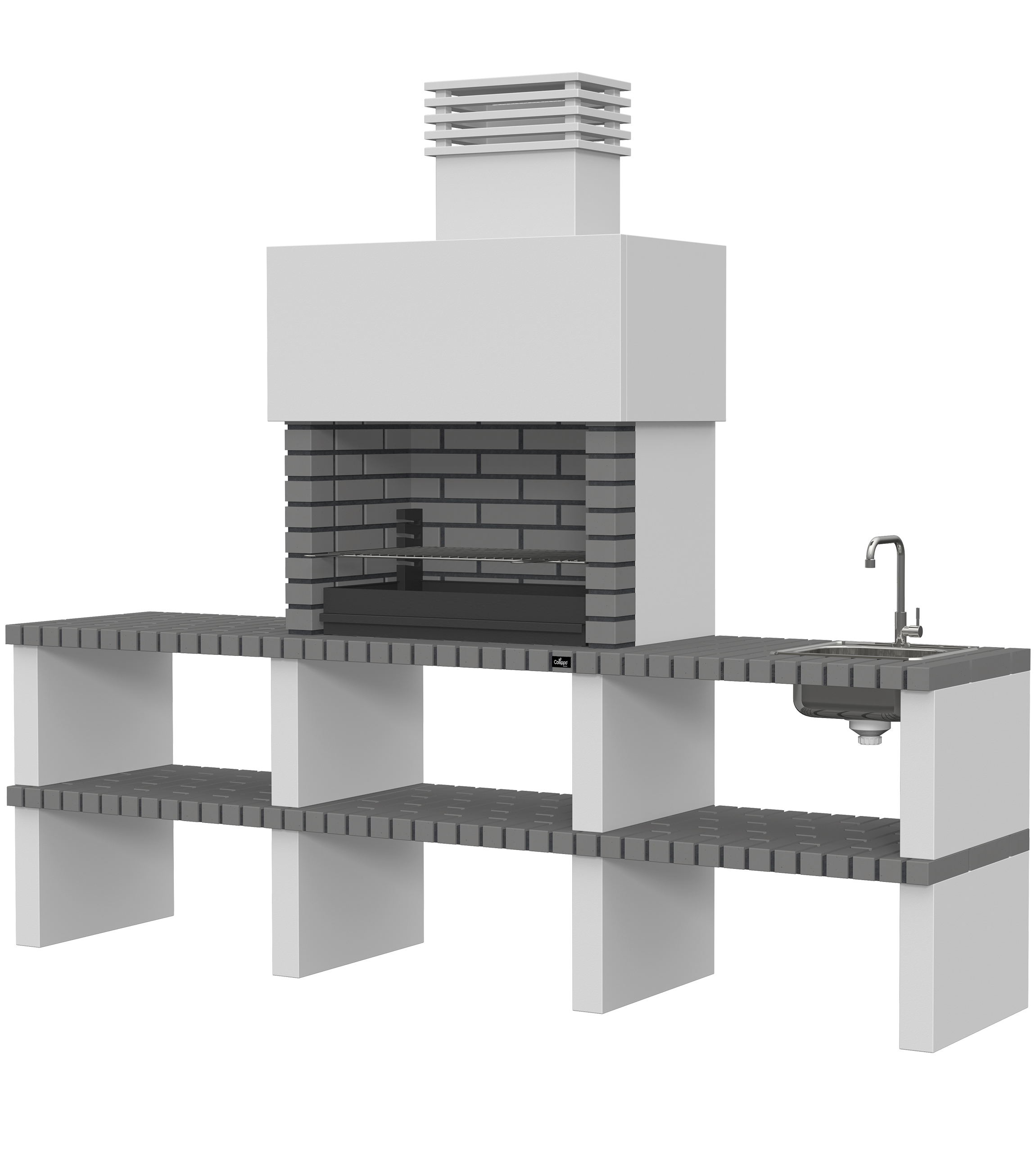 Micro betão liso branco; laterais em micro betão texturado cinzento; peças com pintura preta; zona de fogo em tijolo e cimento refractário