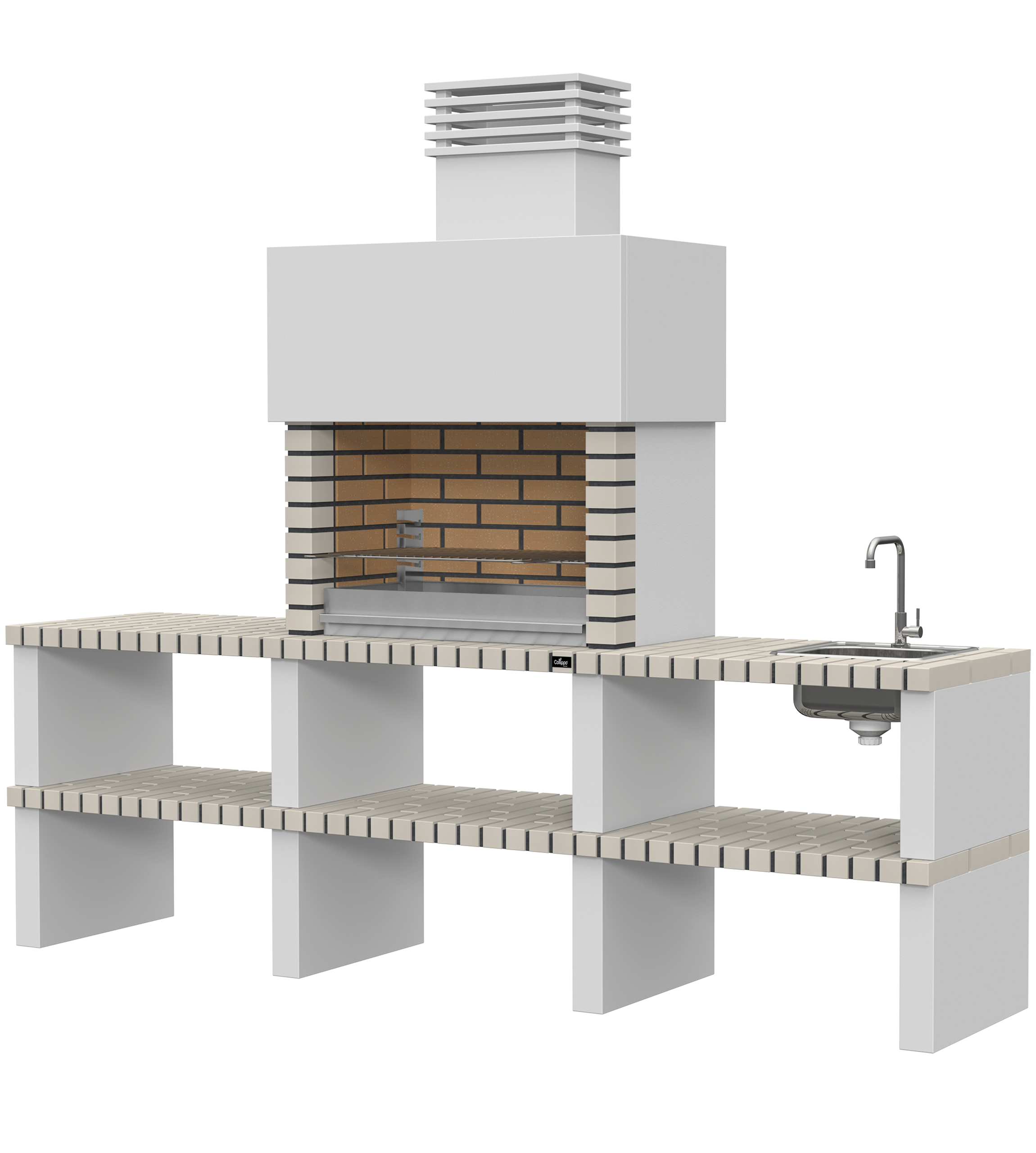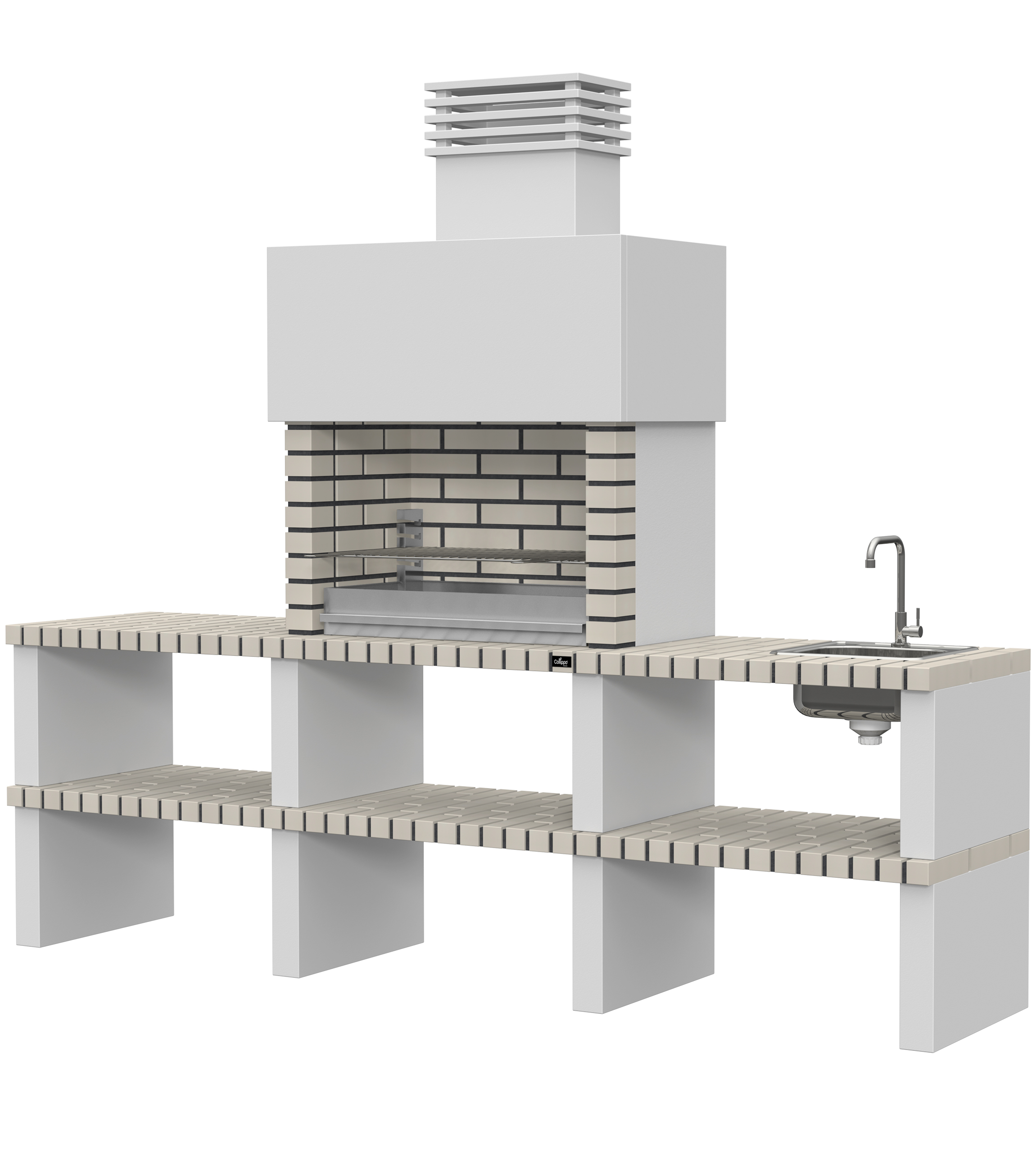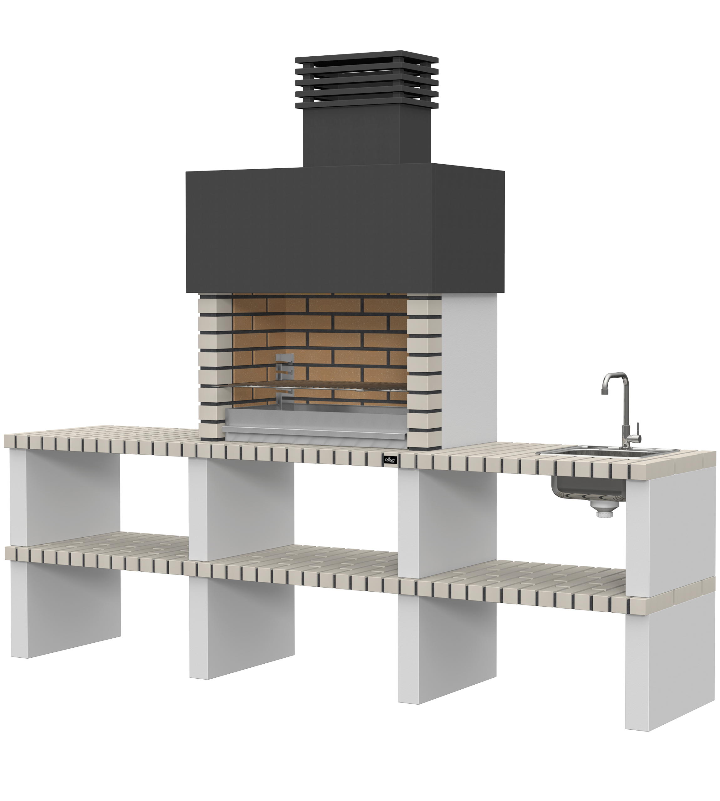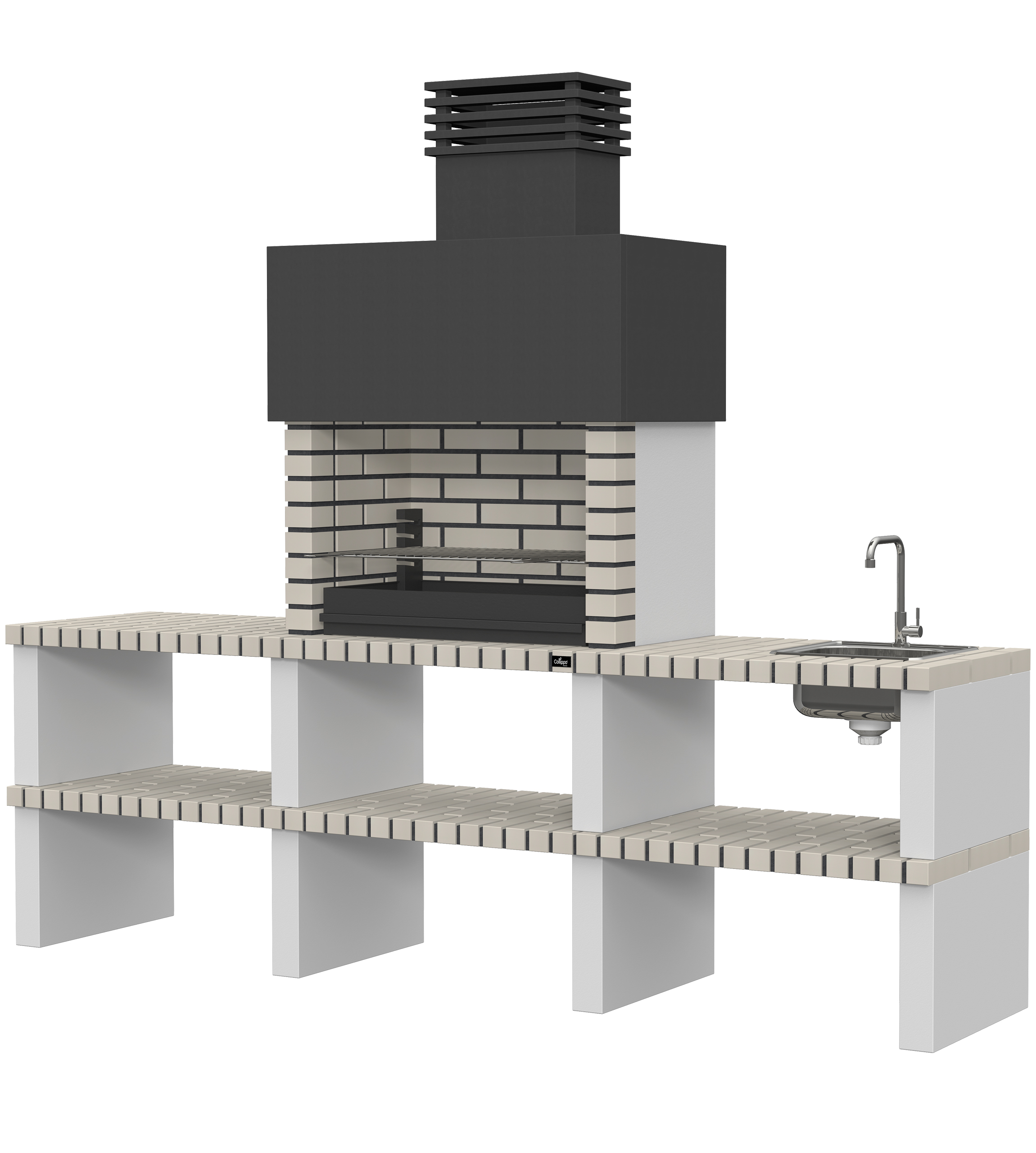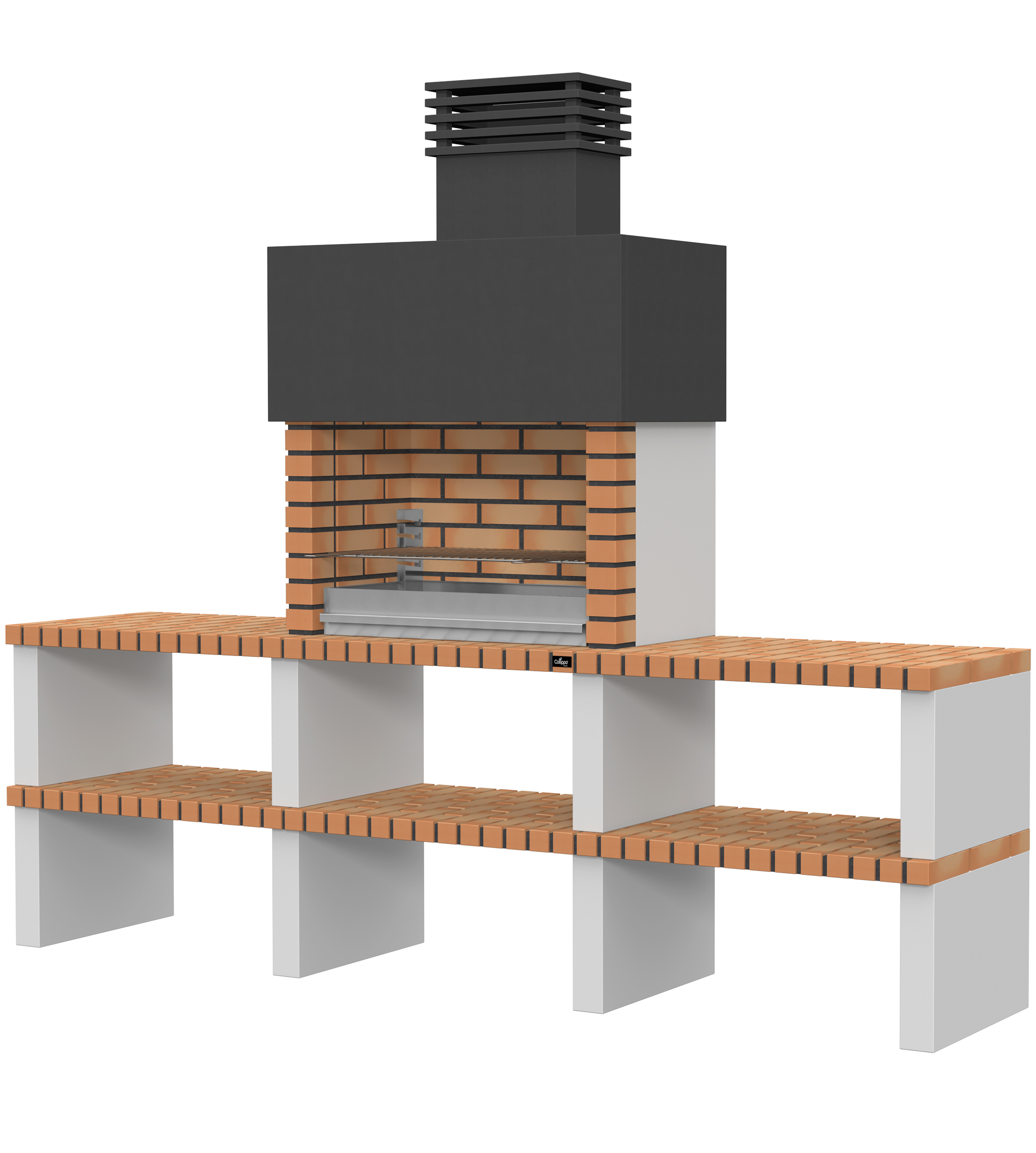 Micro betão liso branco; laterais em micro betão texturado cinzento; peças com pintura preta; zona de fogo em tijolo e cimento refractário