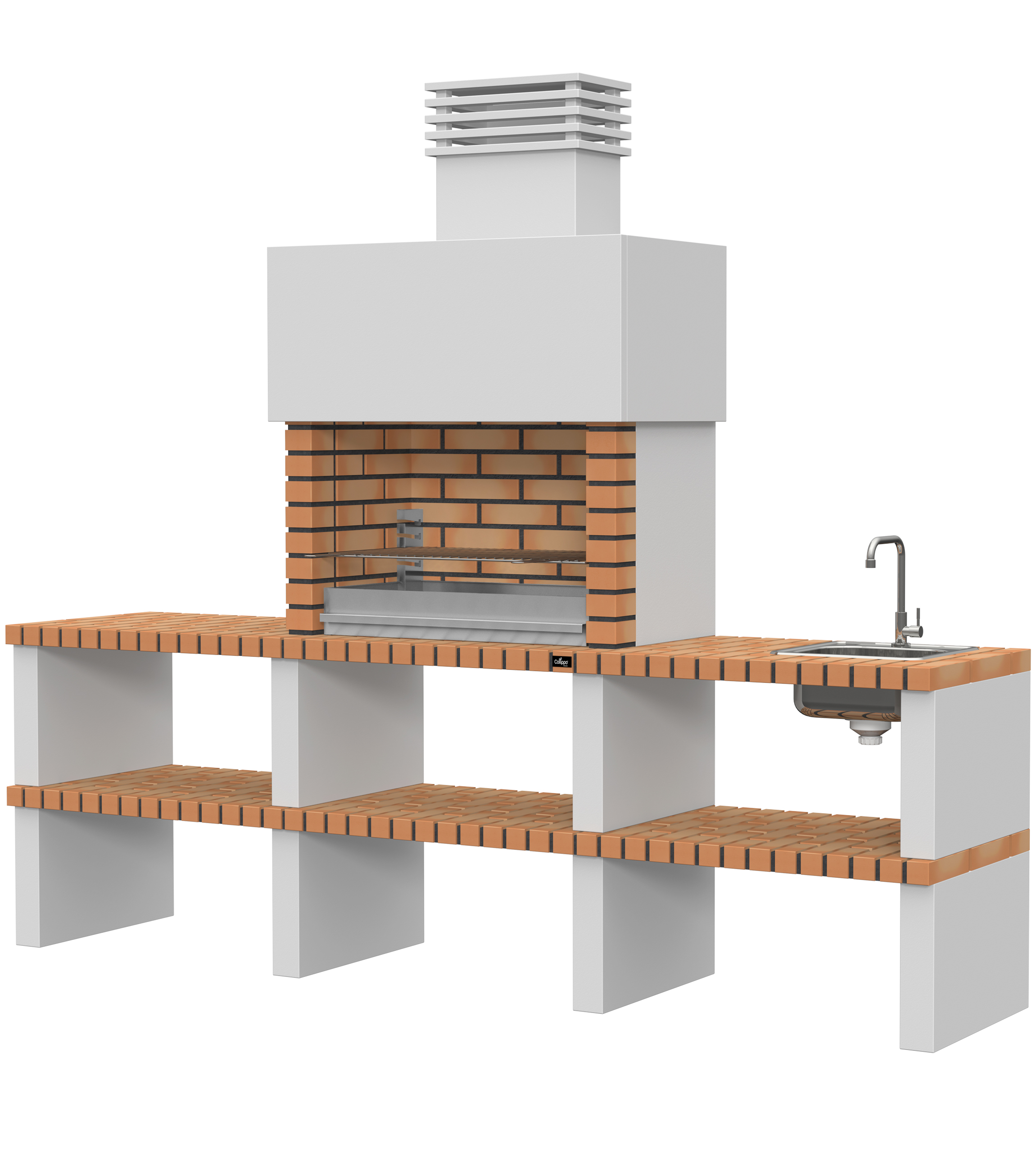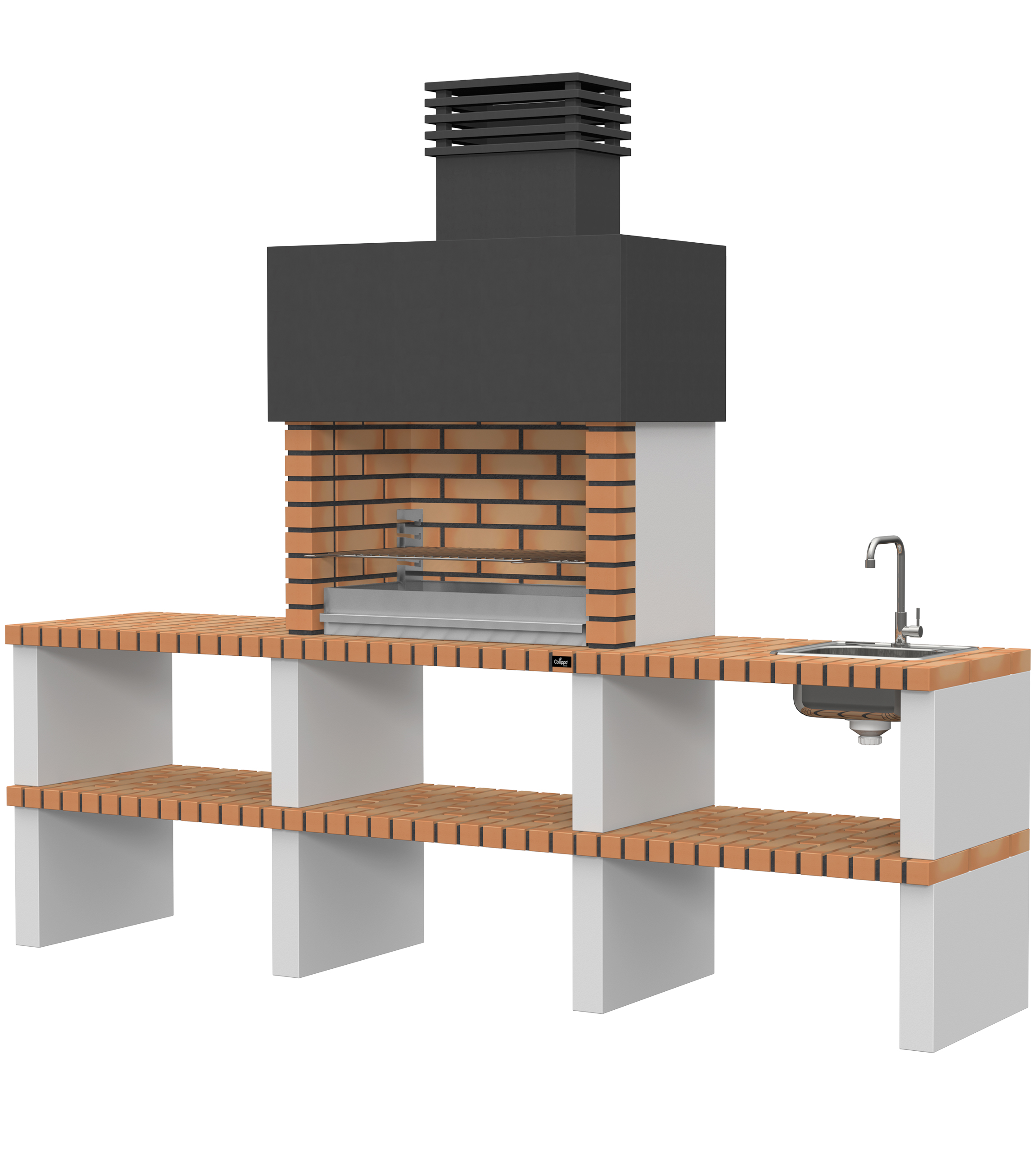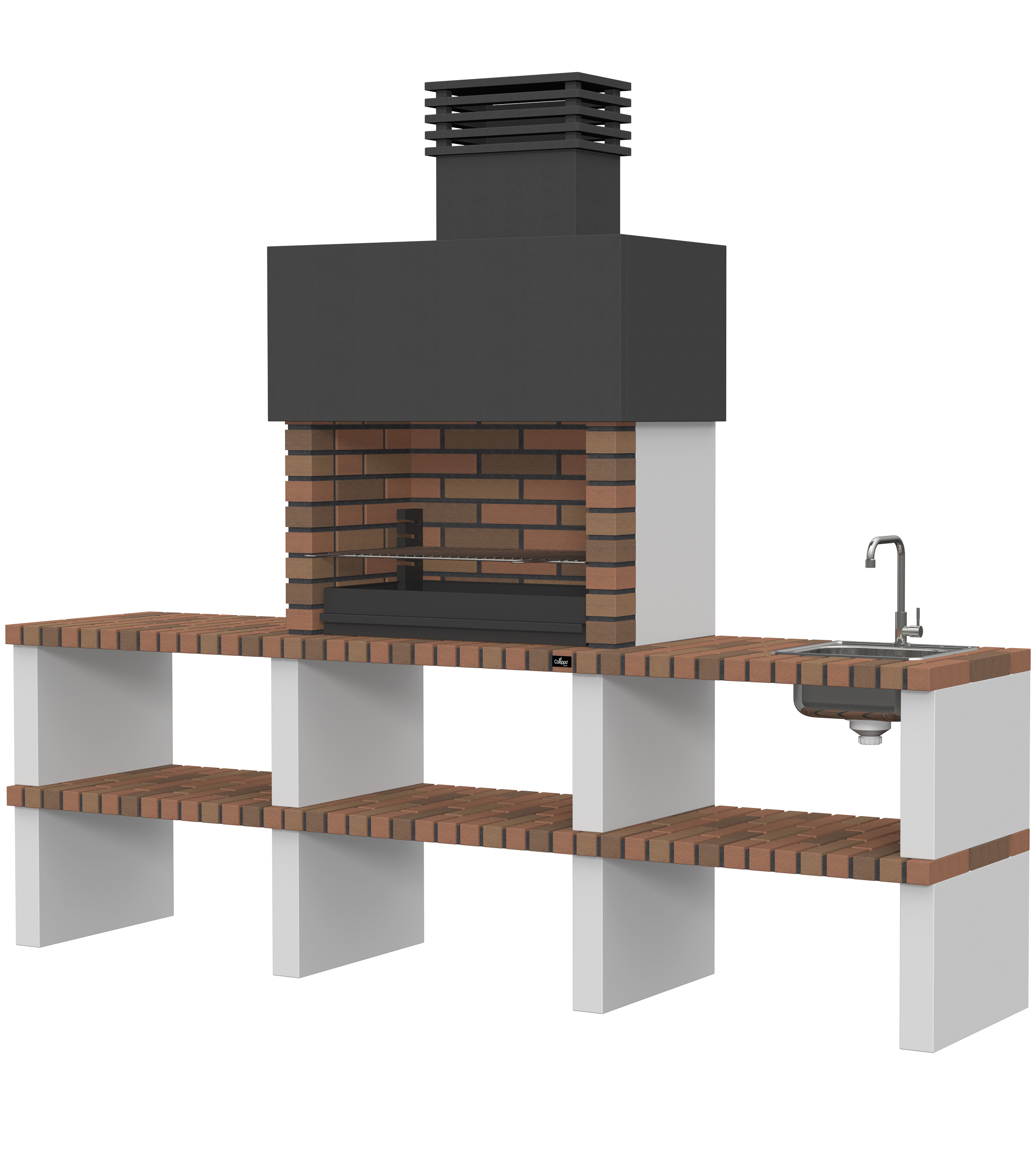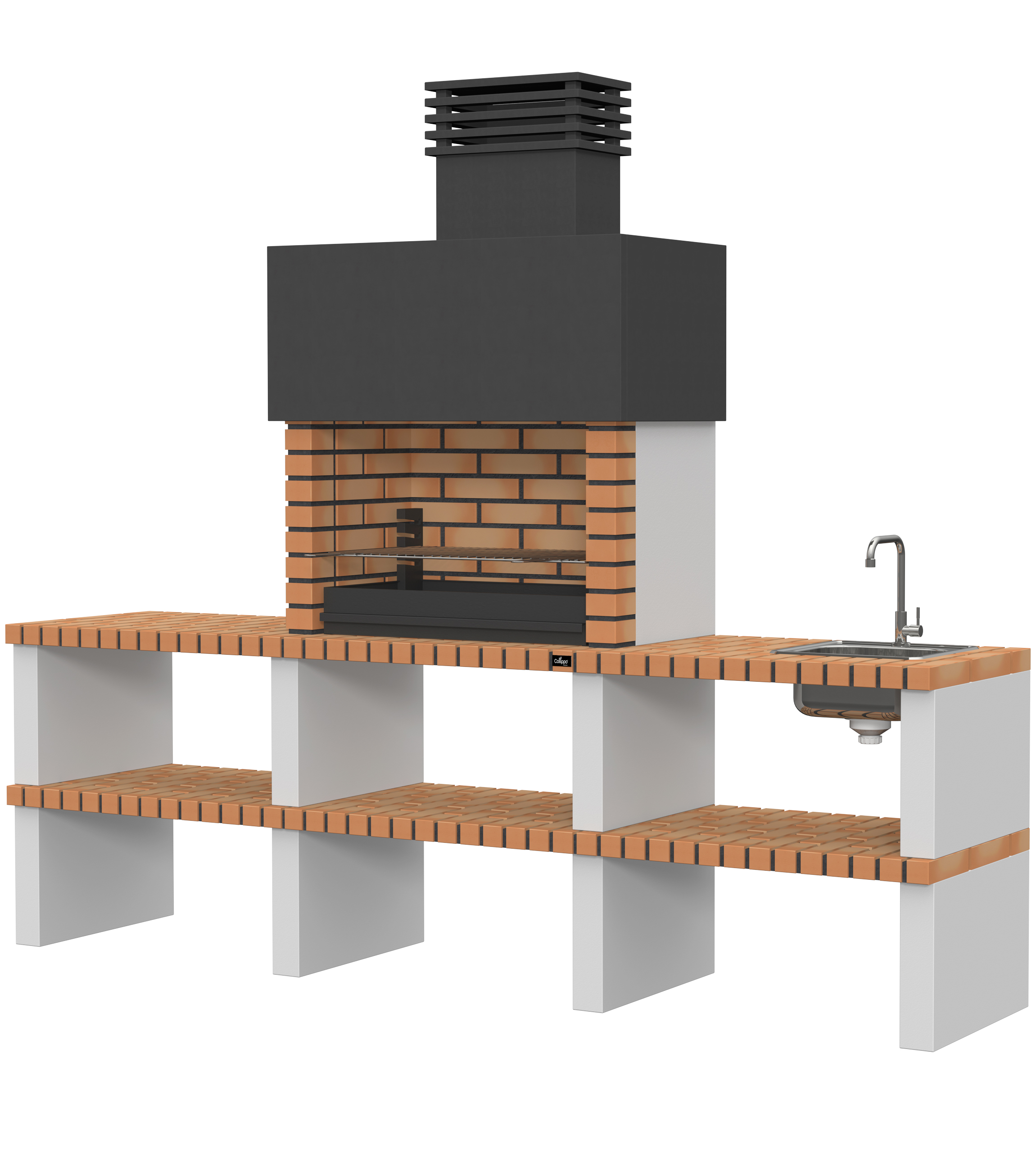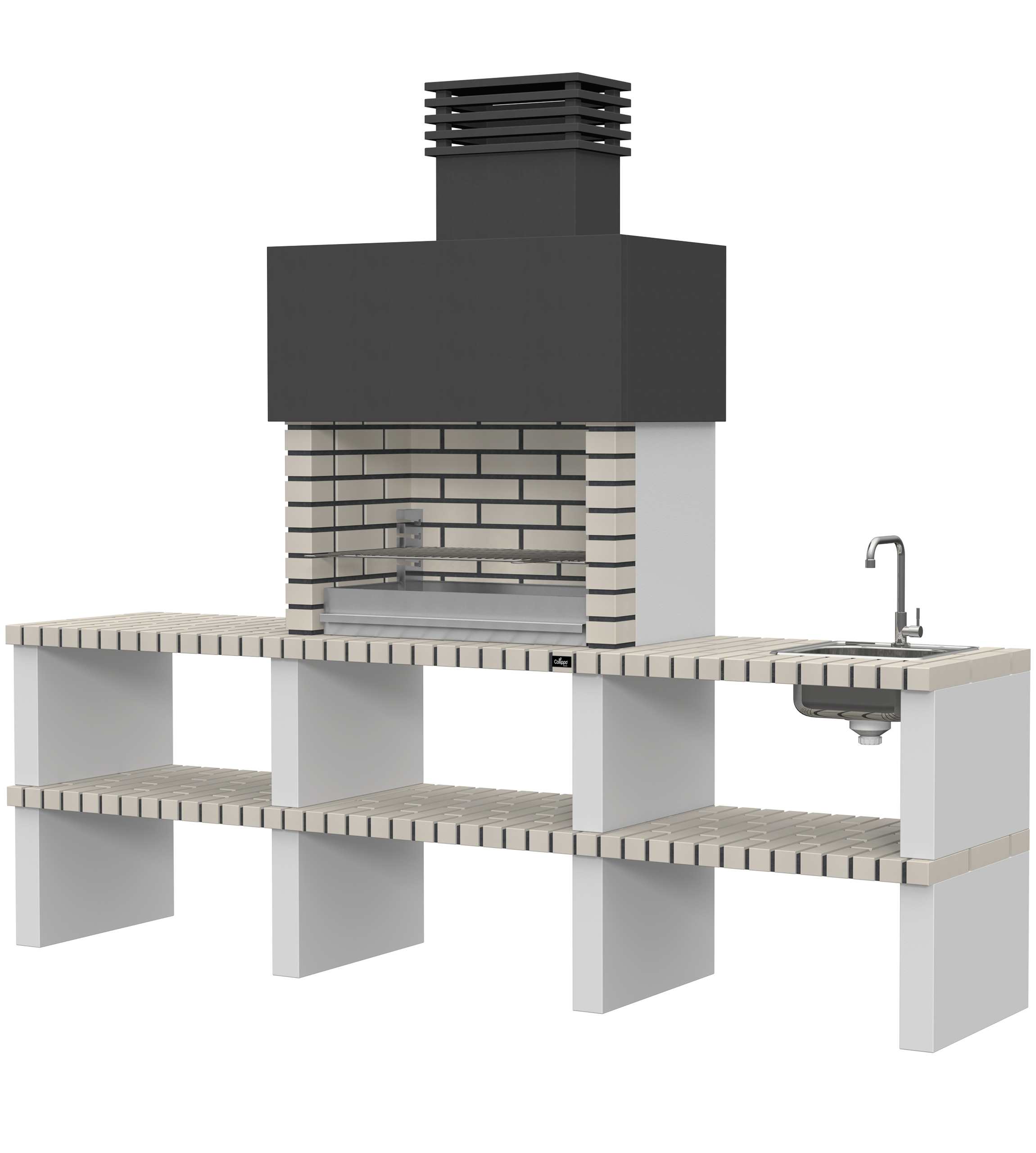 Micro betão liso branco; laterais em micro betão texturado cinzento; peças com pintura preta; zona de fogo em tijolo e cimento refractário