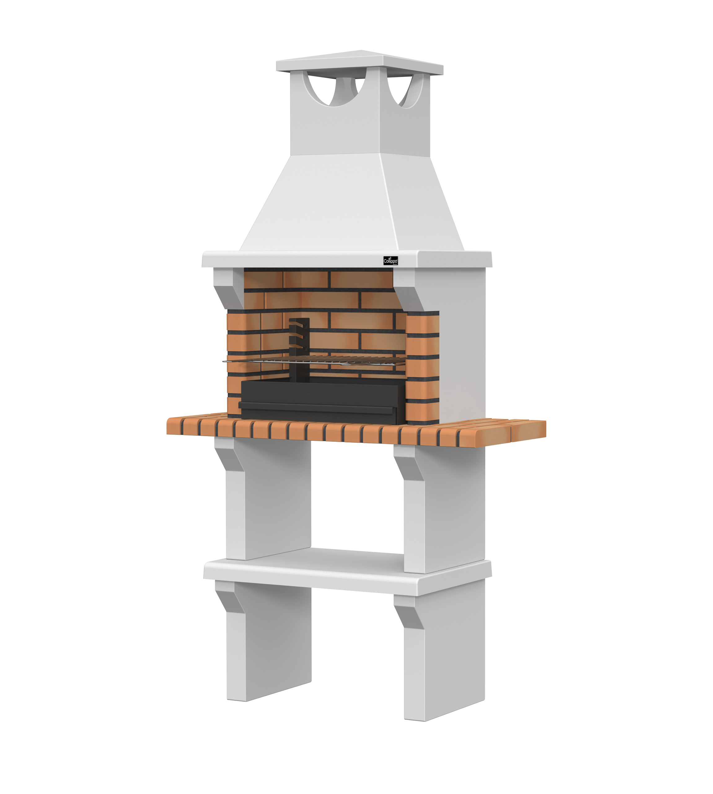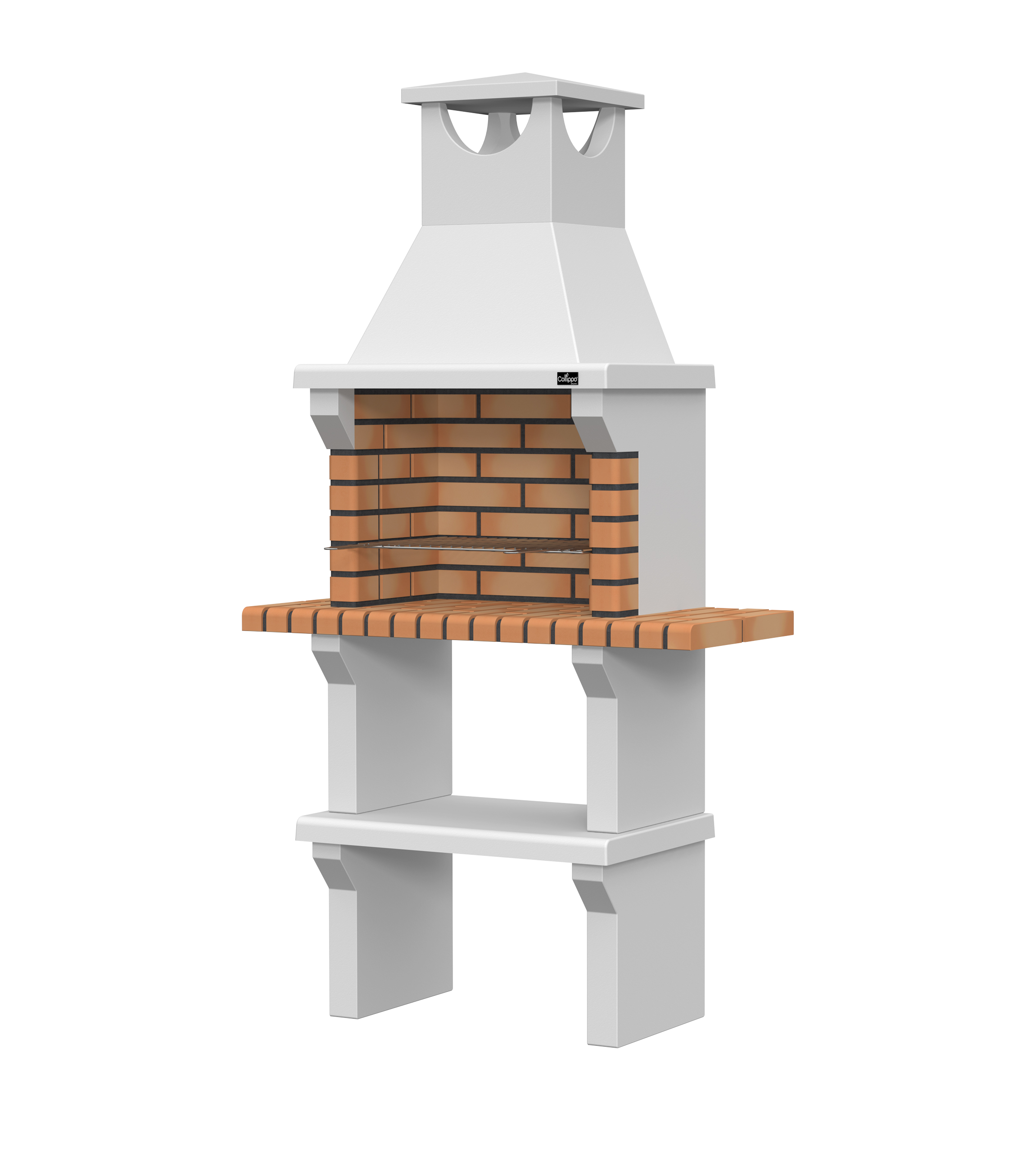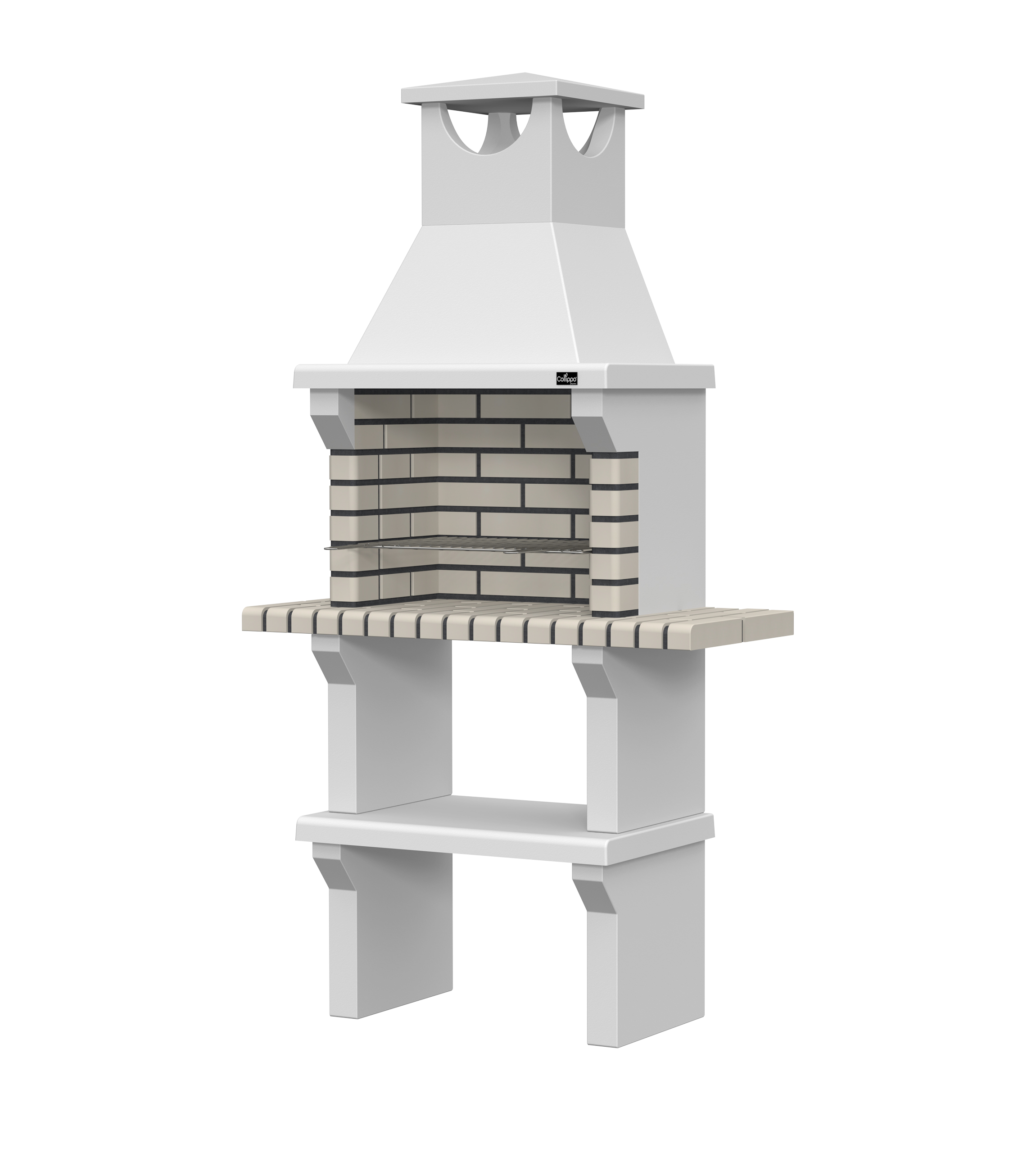 Peças em micro betão cinzento liso e micro betão cinzento texturado; zona de fogo em tijolo e cimento refractário