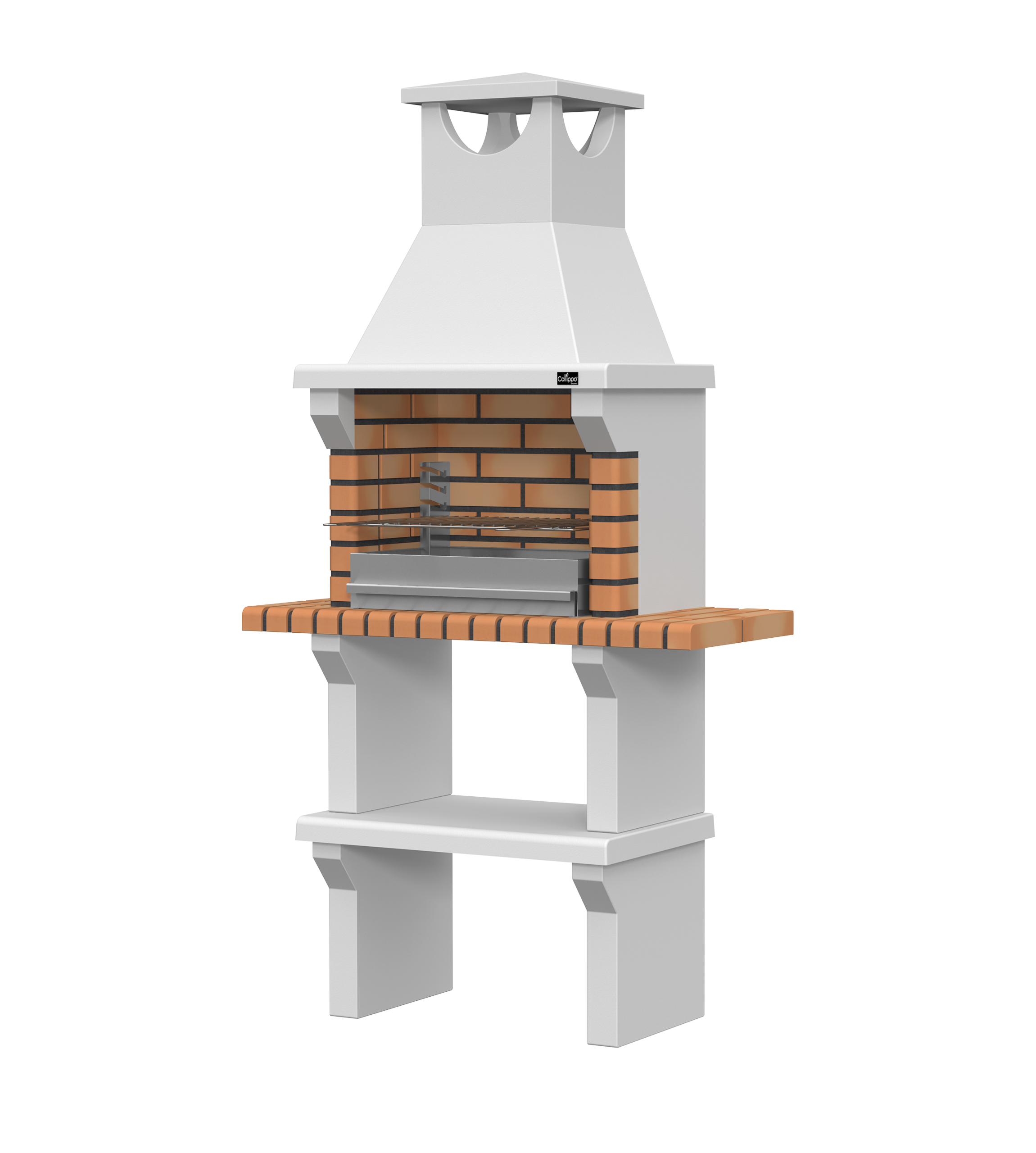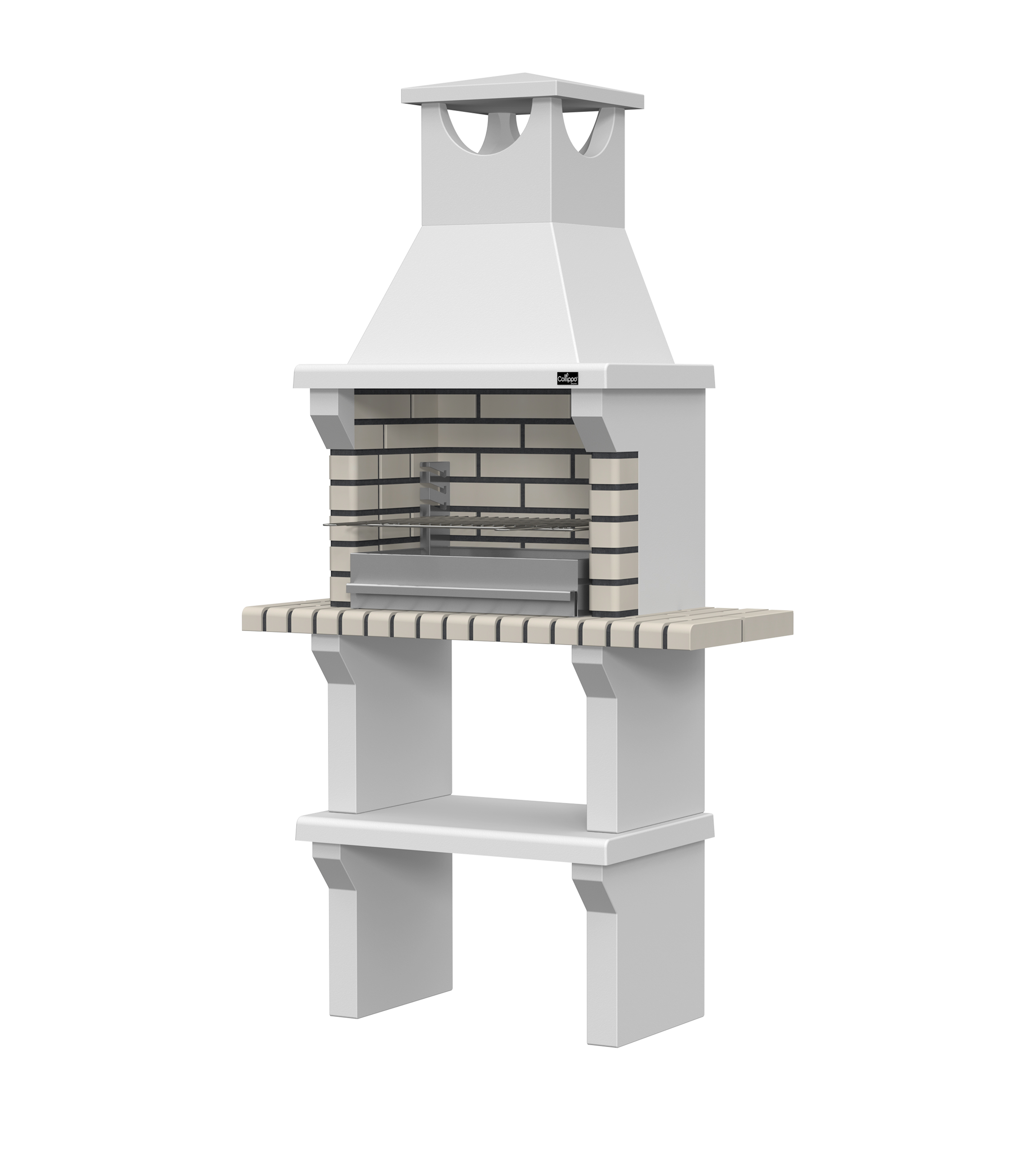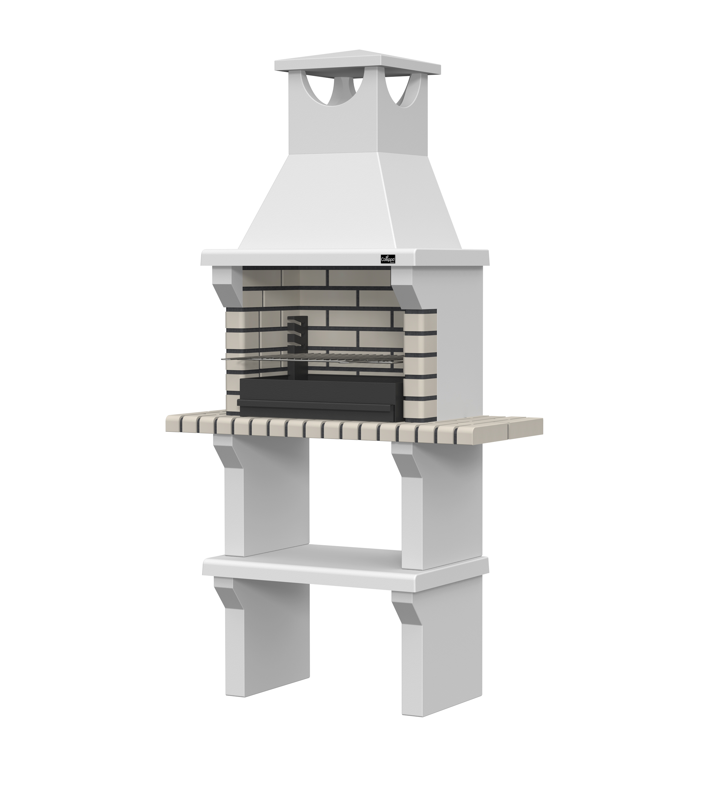 Peças em micro betão cinzento liso e micro betão cinzento texturado; zona de fogo em tijolo e cimento refractário