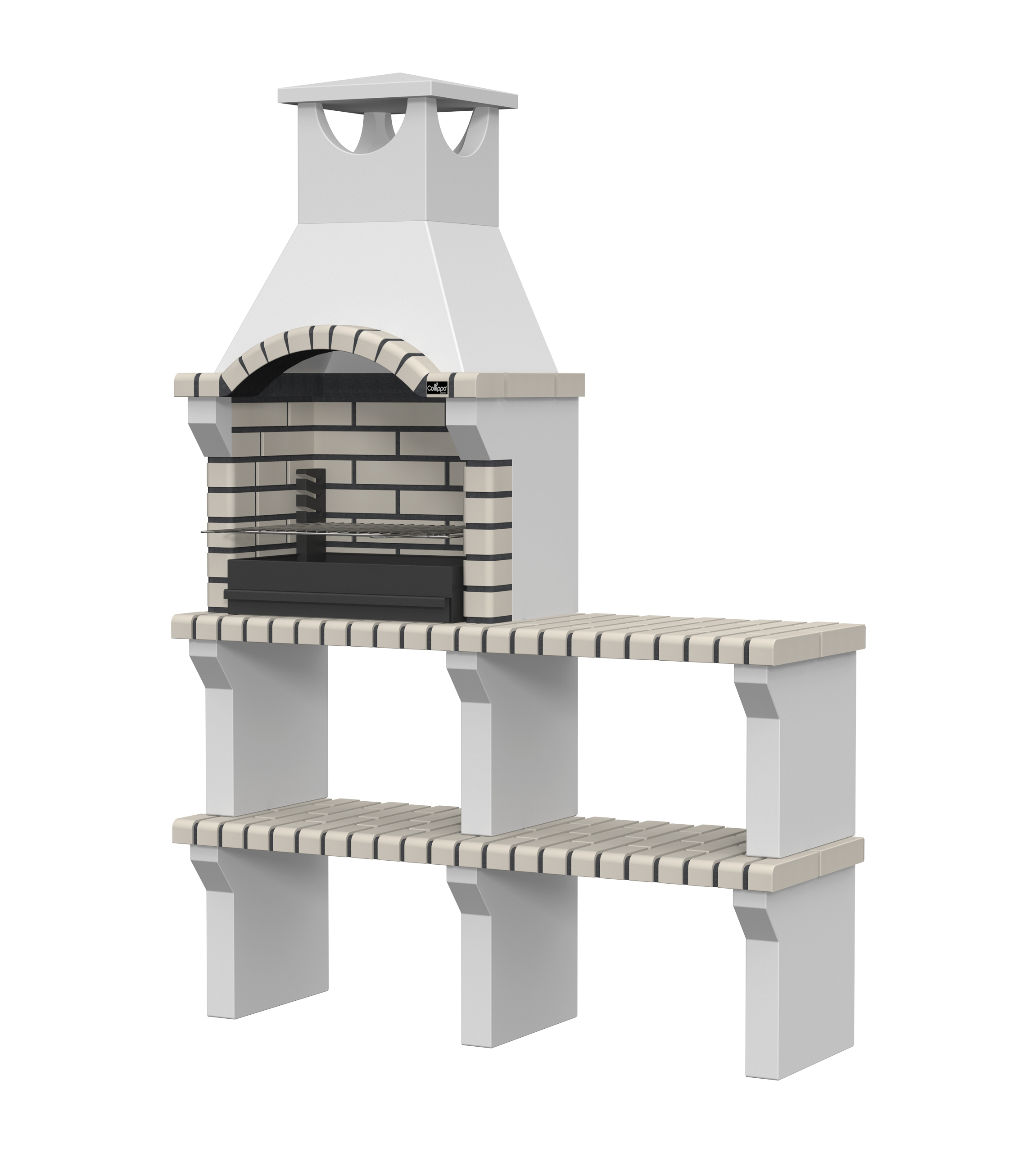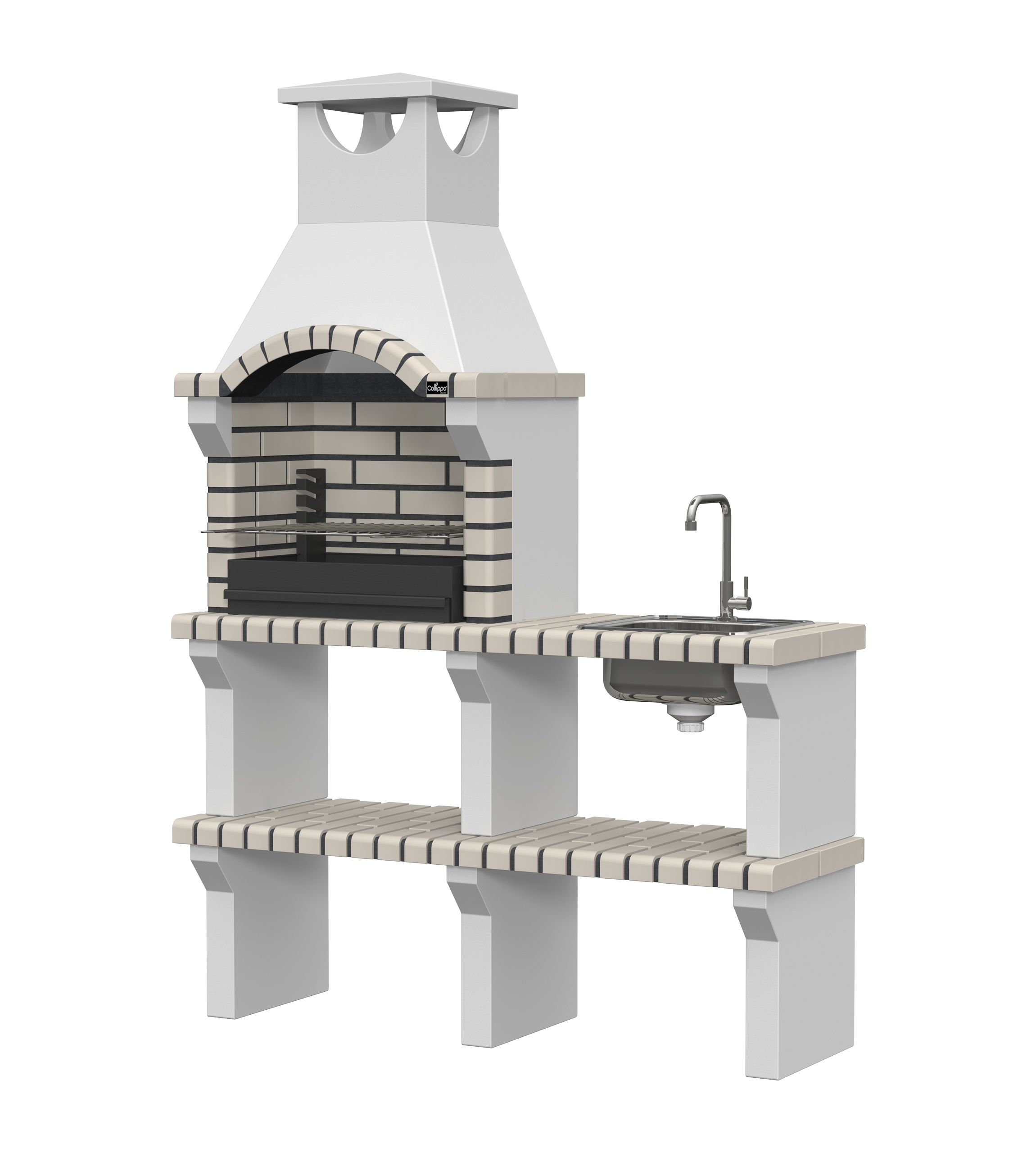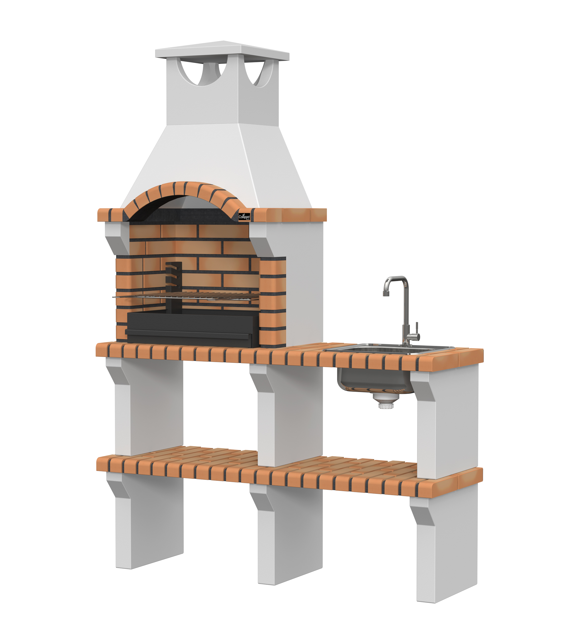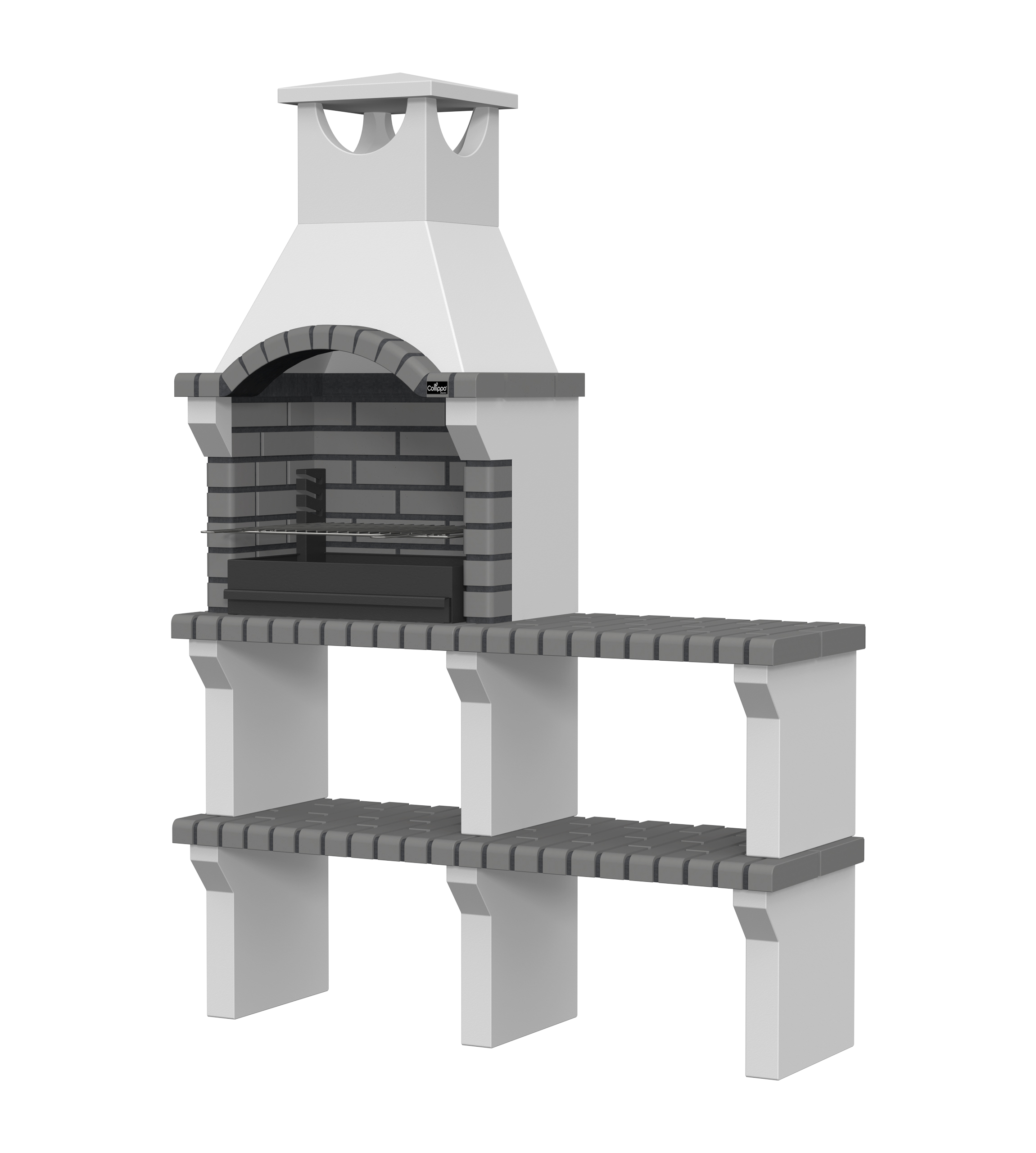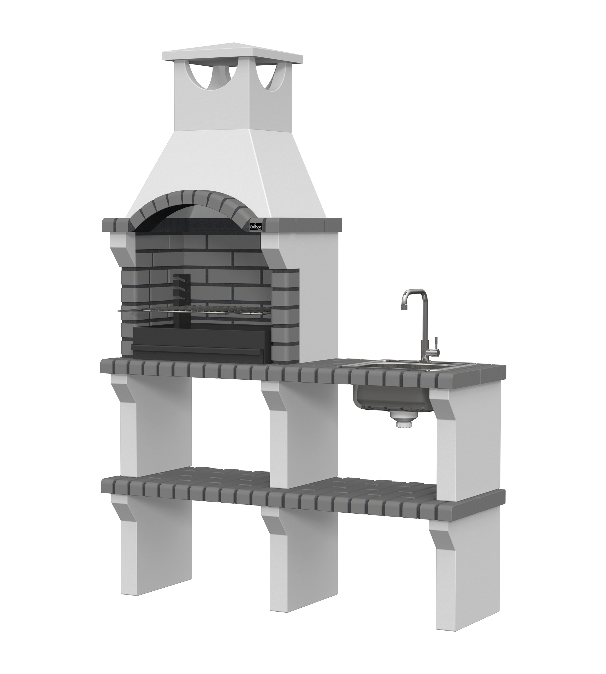 Peças em micro betão cinzento liso e micro betão cinzento texturado; zona de fogo em tijolo e cimento refractário