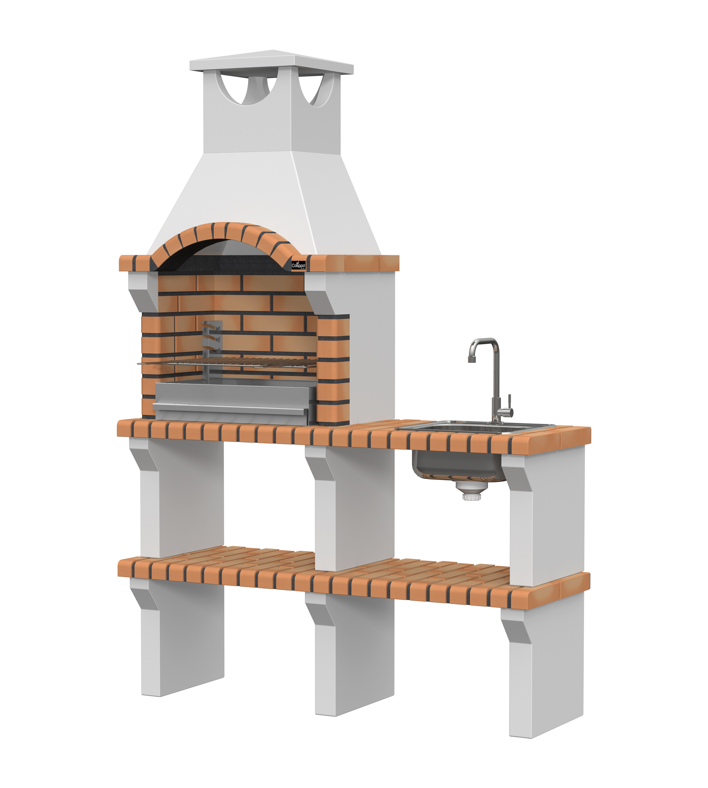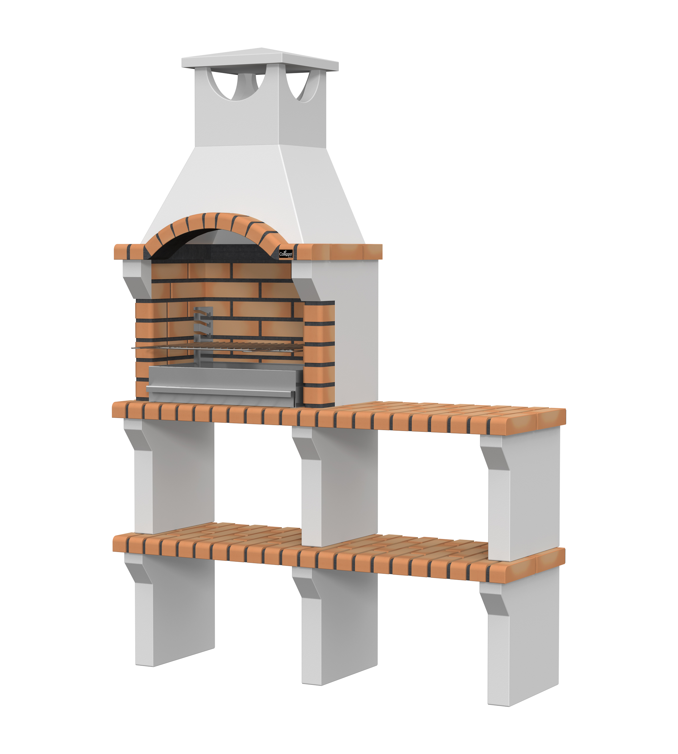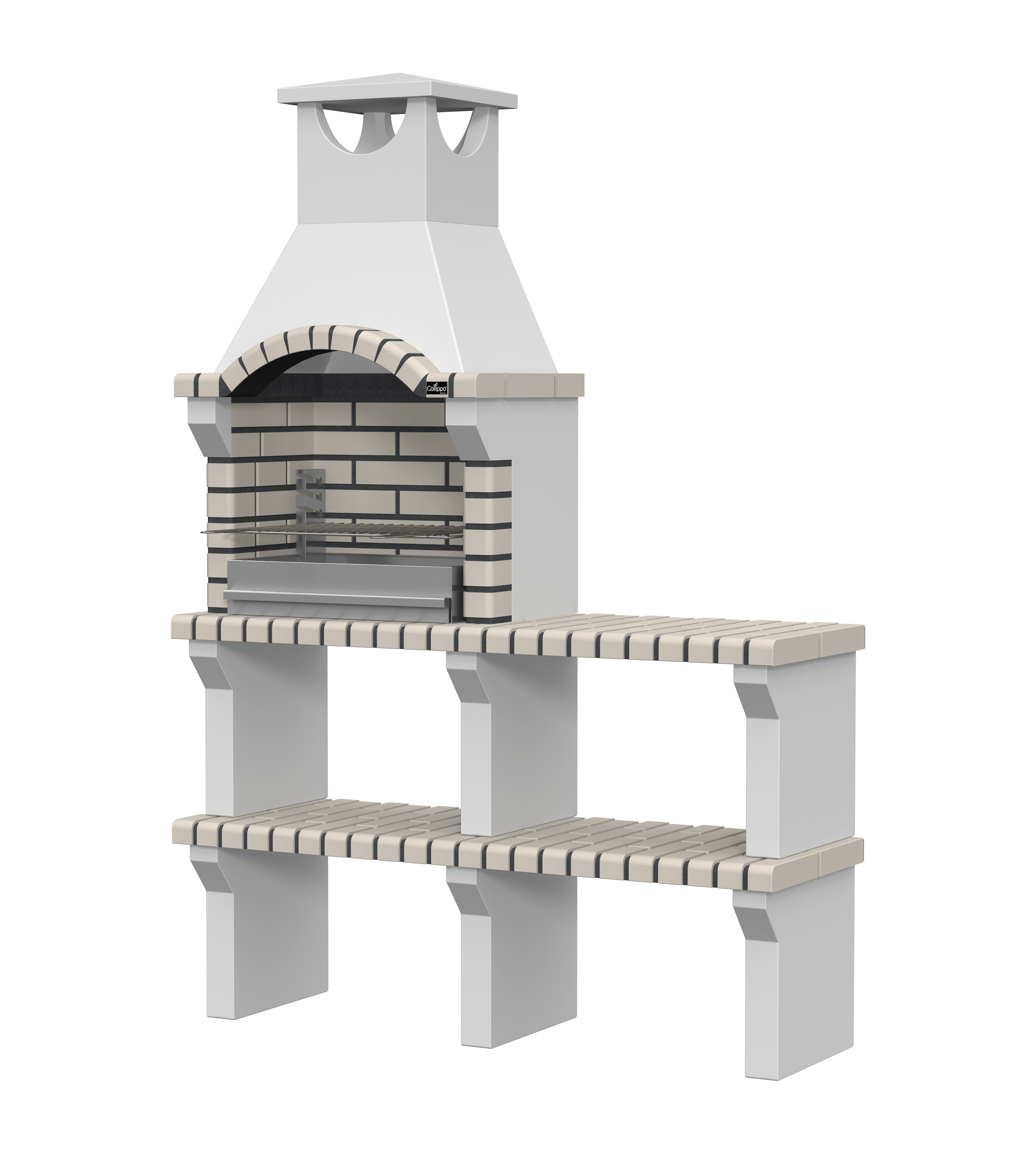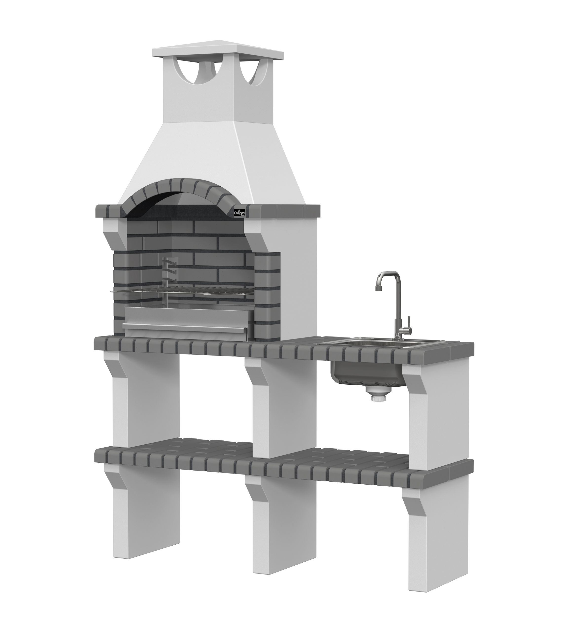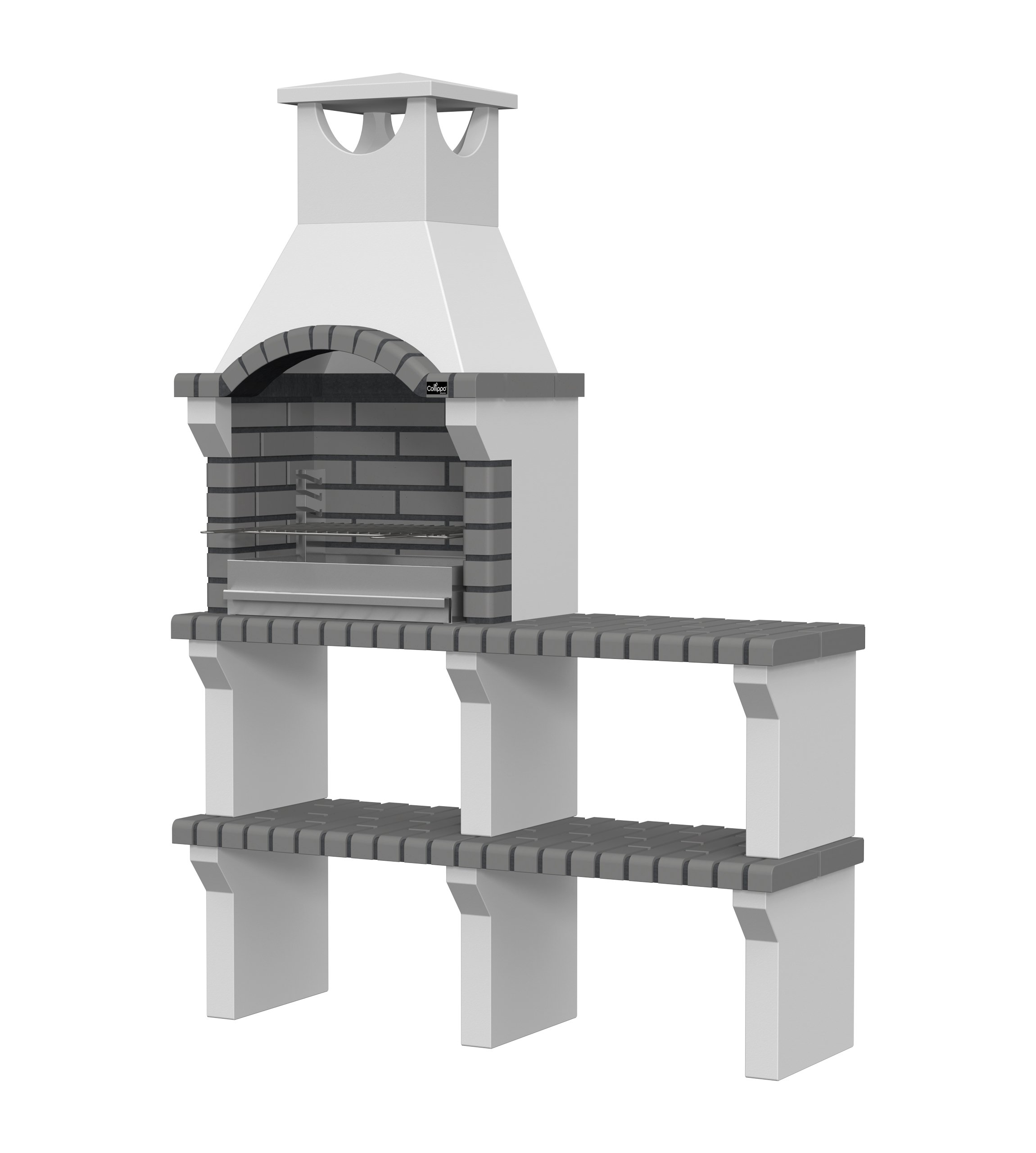 Peças em micro betão cinzento liso e micro betão cinzento texturado; zona de fogo em tijolo e cimento refractário