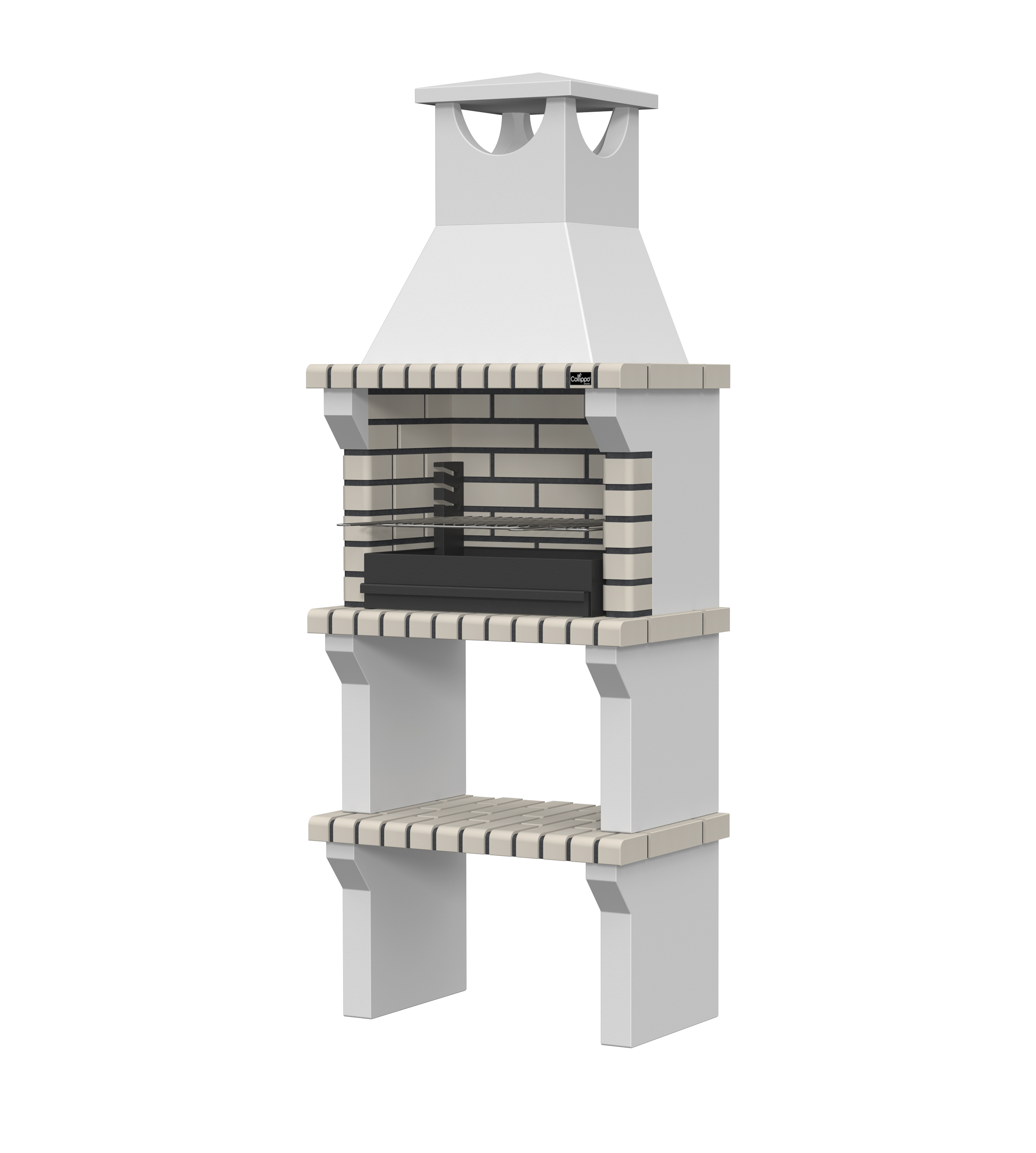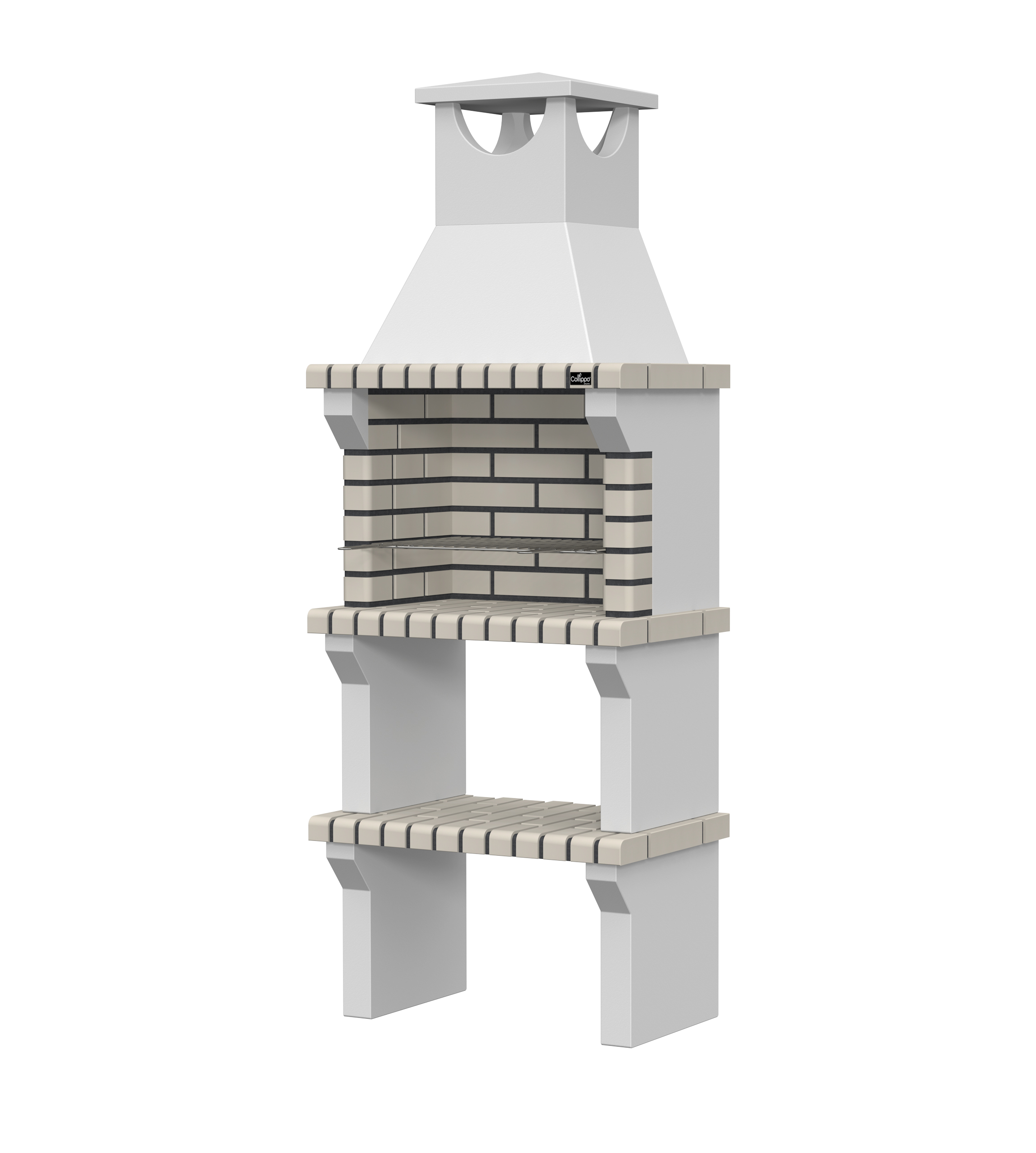 Peças em micro betão cinzento liso e micro betão cinzento texturado; zona de fogo em tijolo e cimento refractário