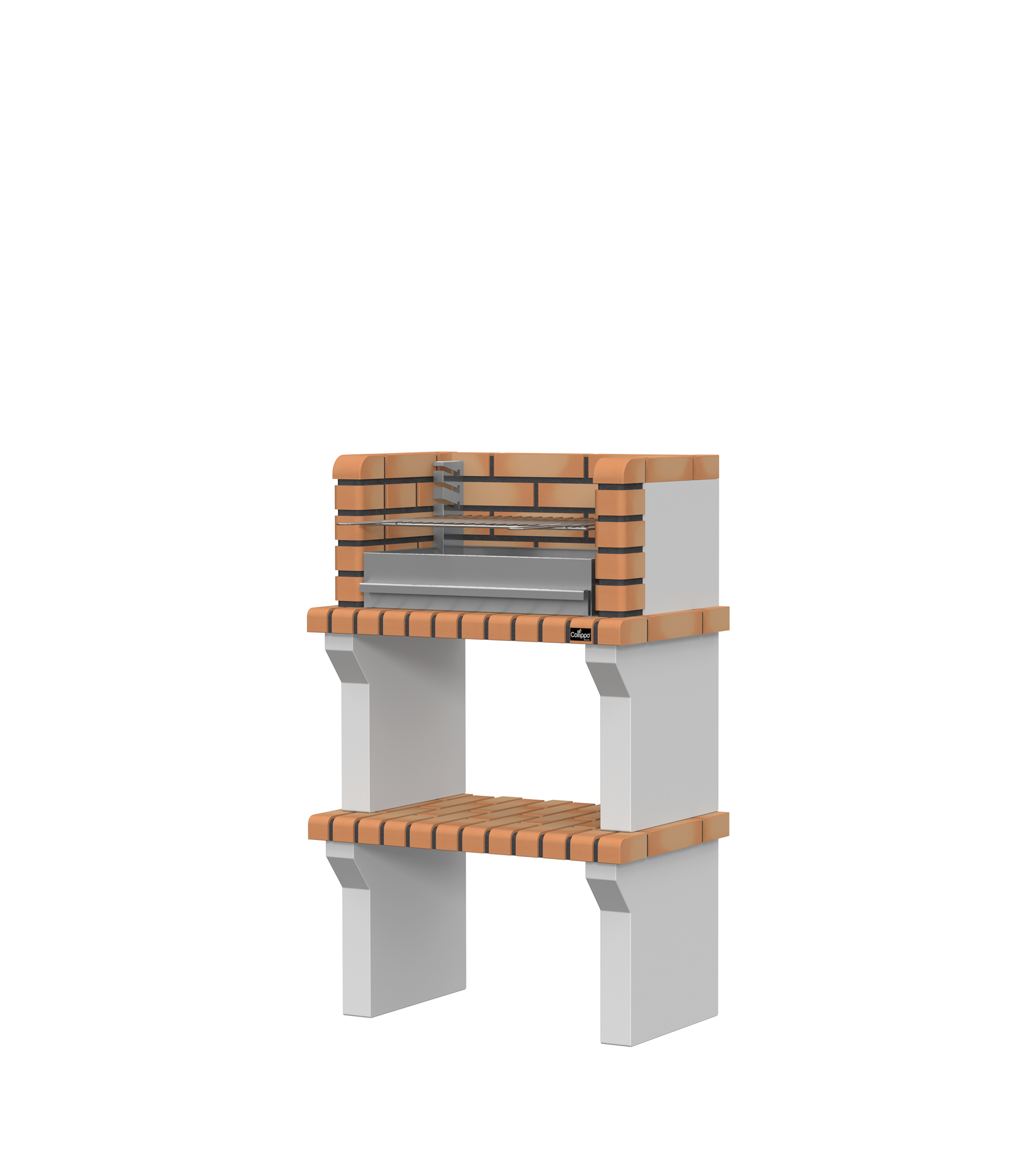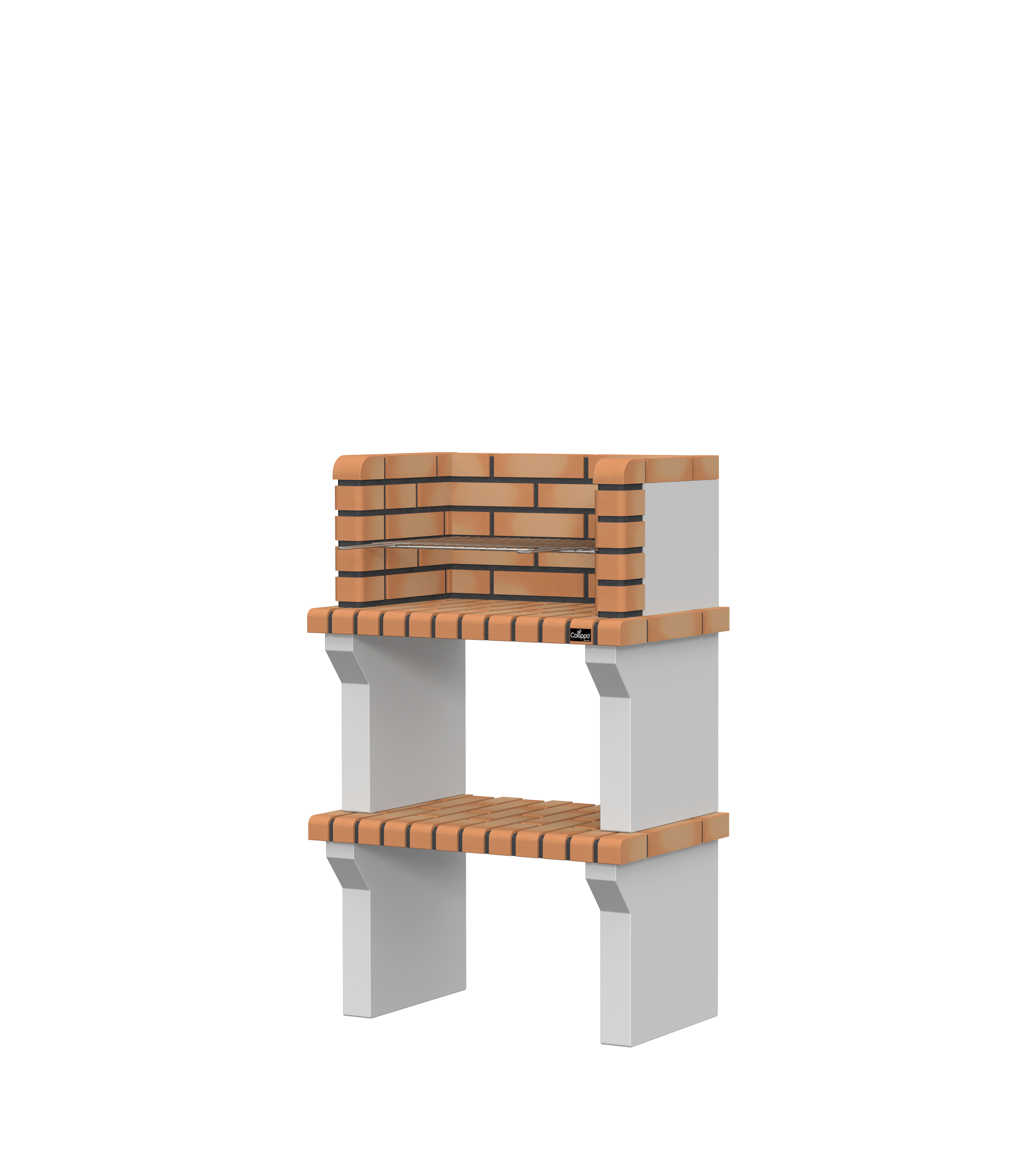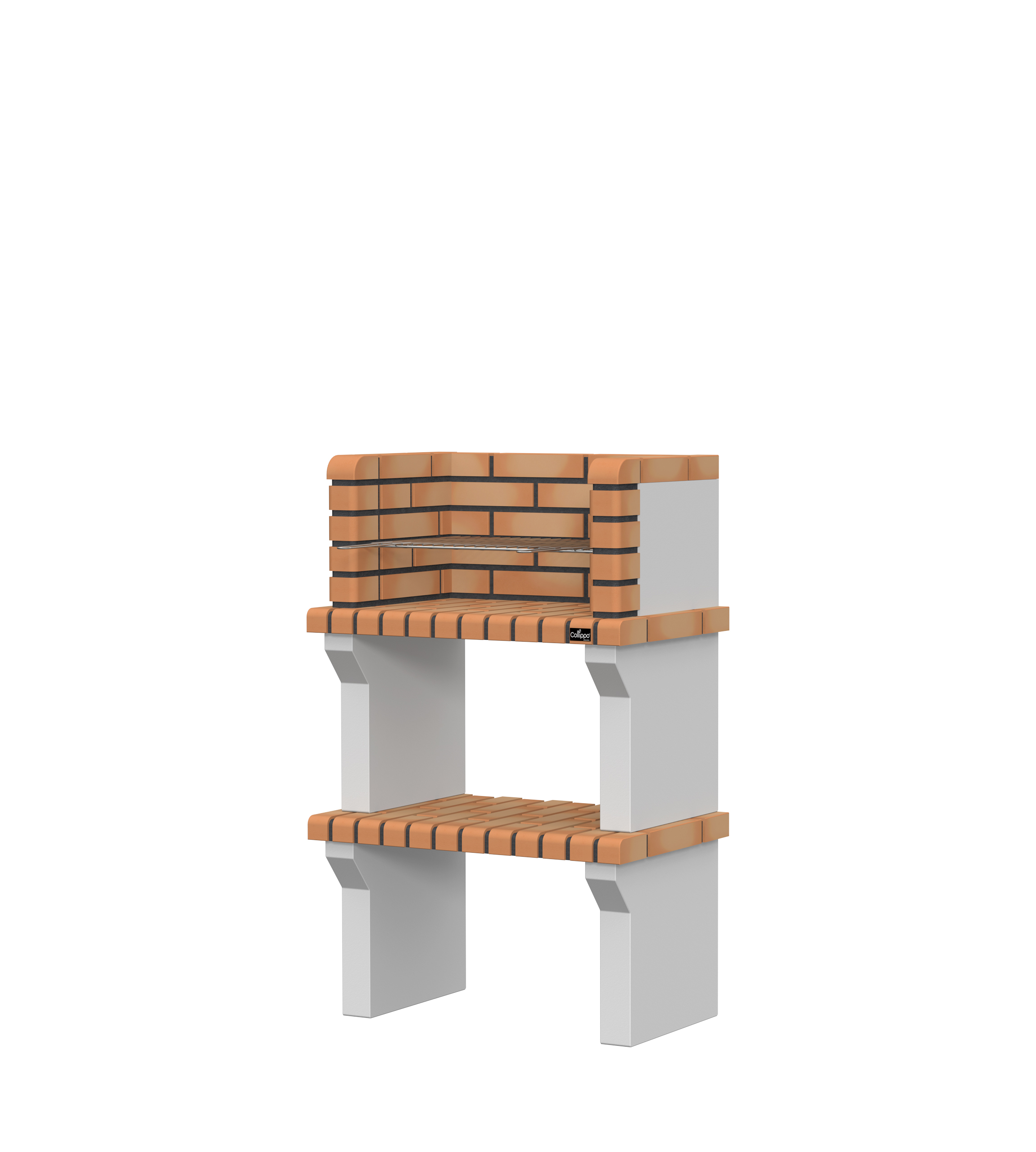 Pés e lateral em micro betão cinzento texturado; prateleira em tijolo; zona de fogo em tijolo e cimento refractário.