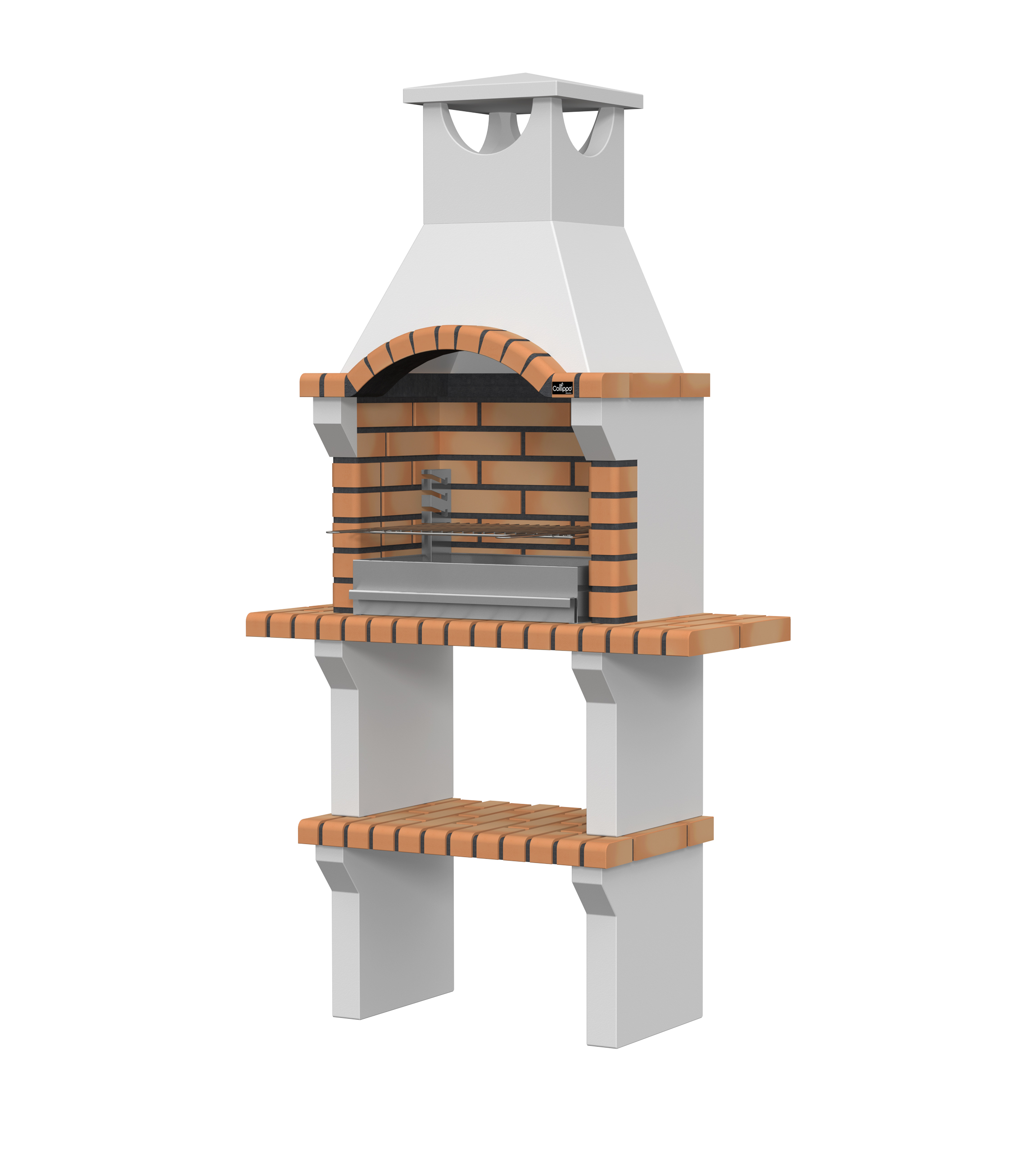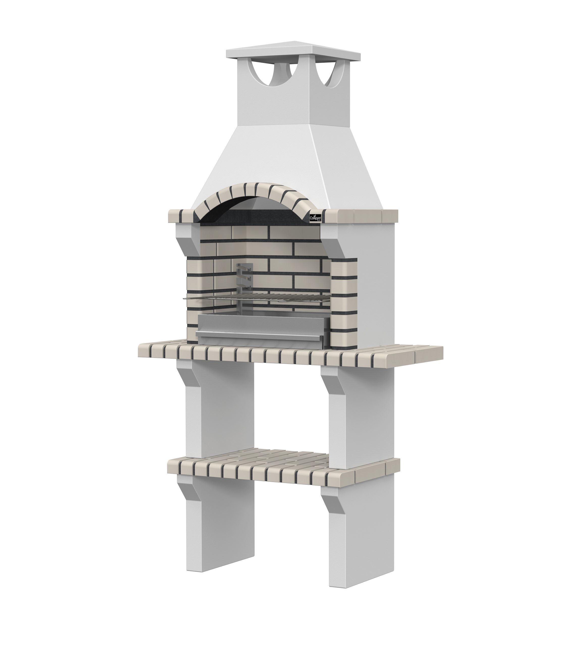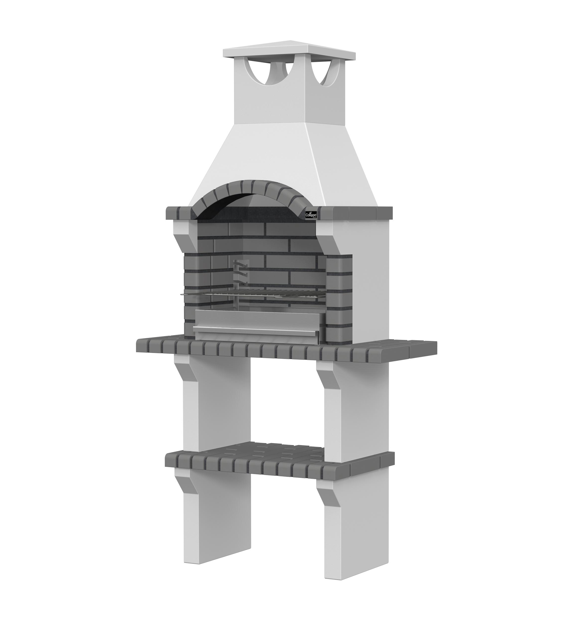 Peças em micro betão cinzento liso e micro betão cinzento texturado; zona de fogo em tijolo e cimento refractário