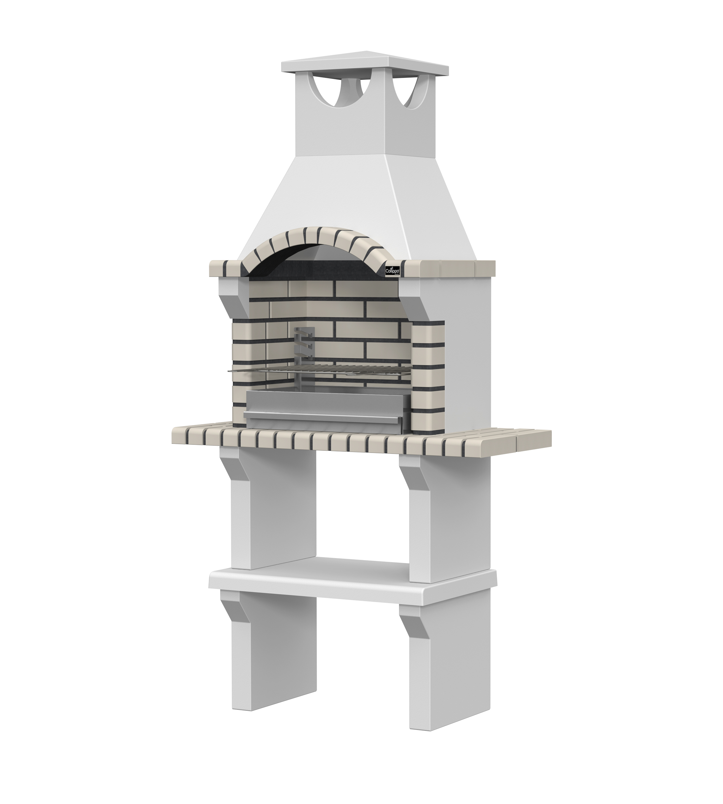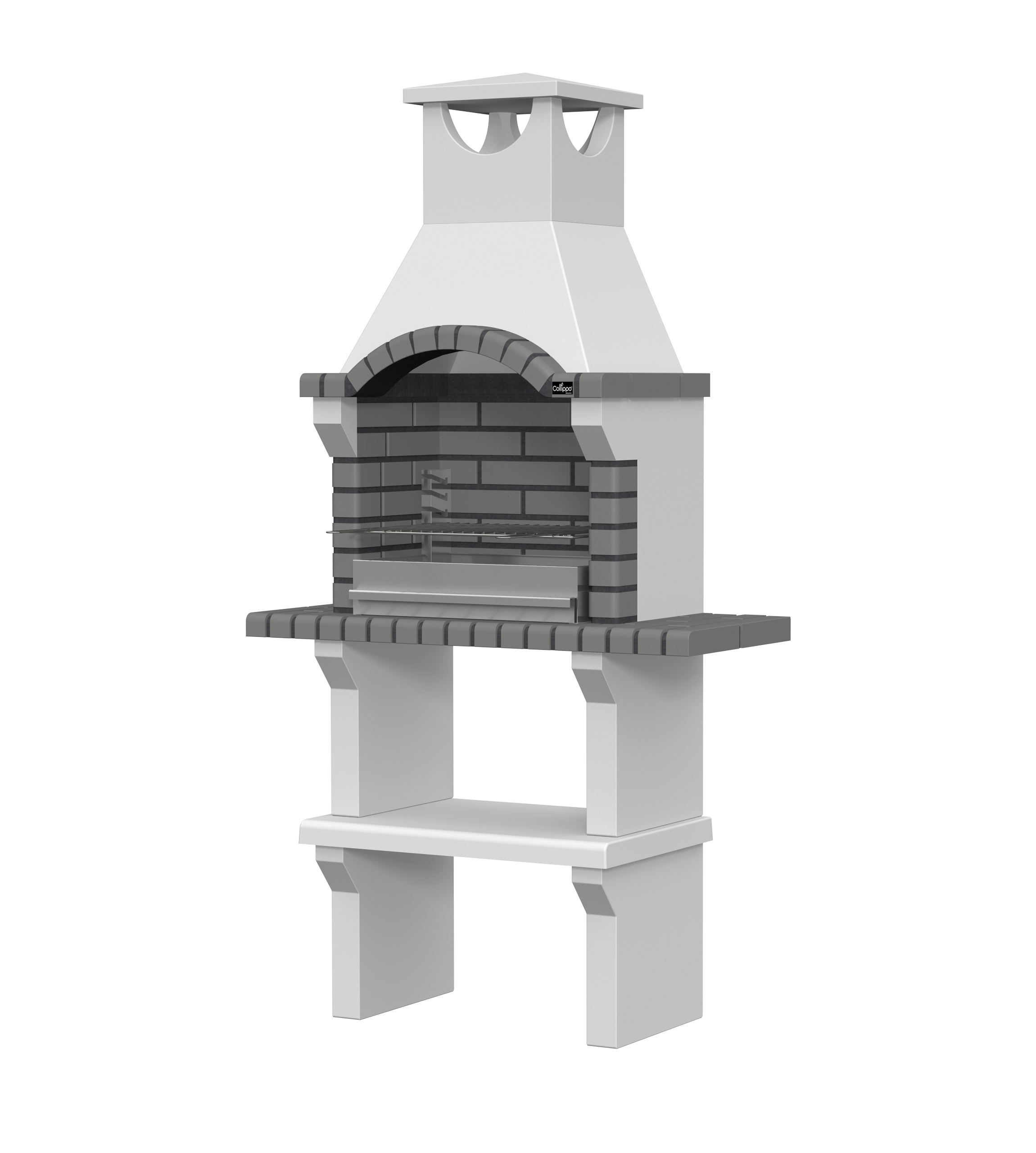 Peças em micro betão cinzento liso e micro betão cinzento texturado; zona de fogo em tijolo e cimento refractário