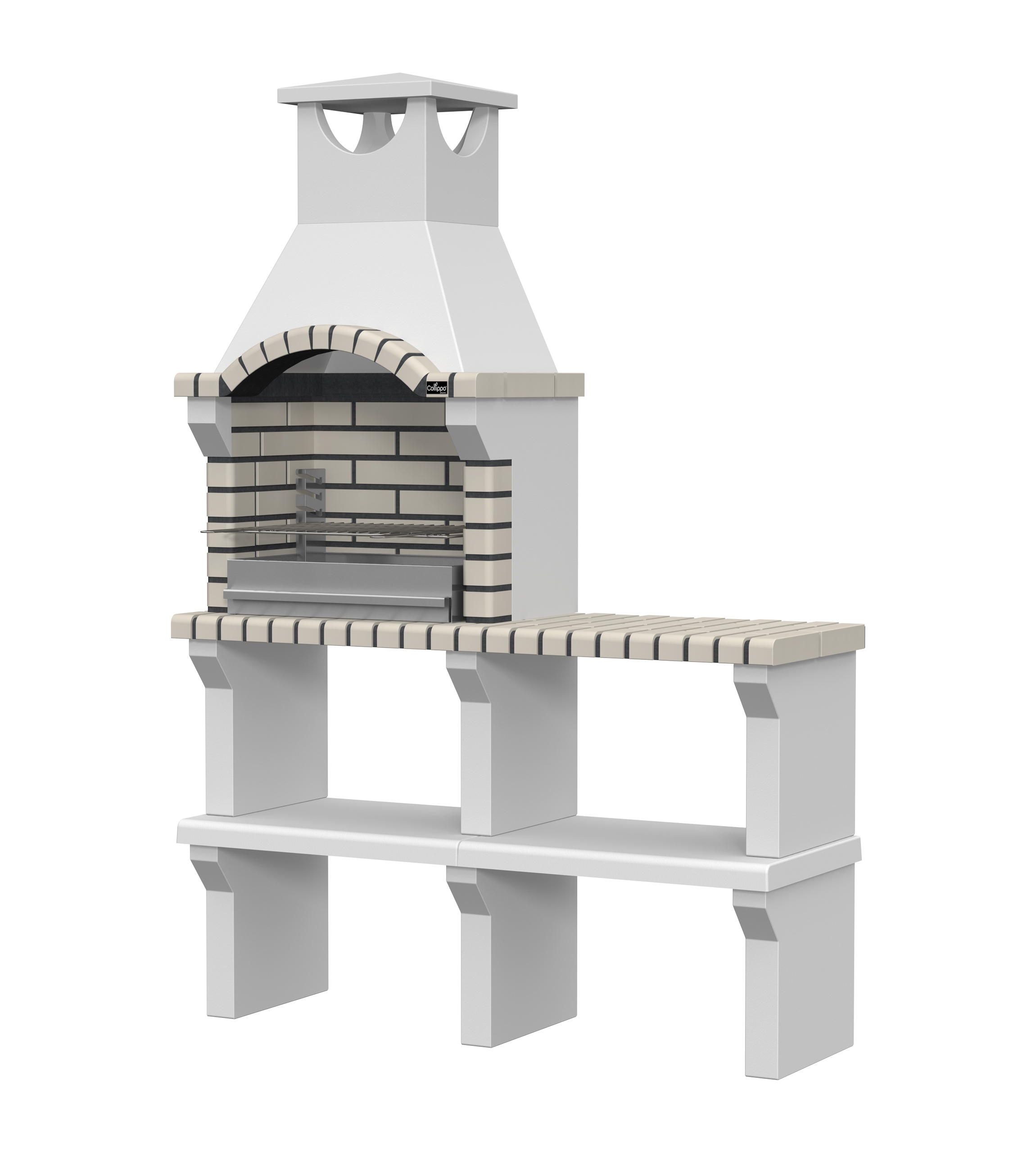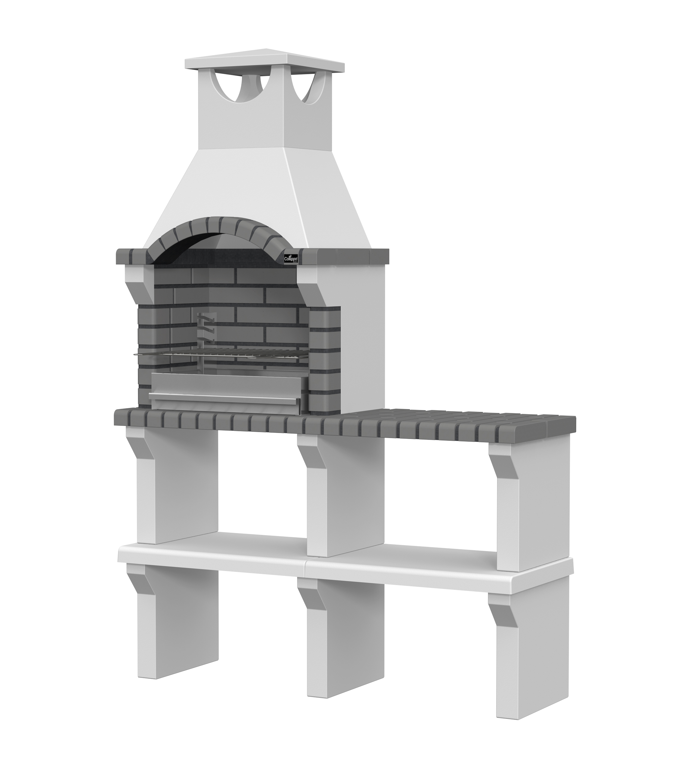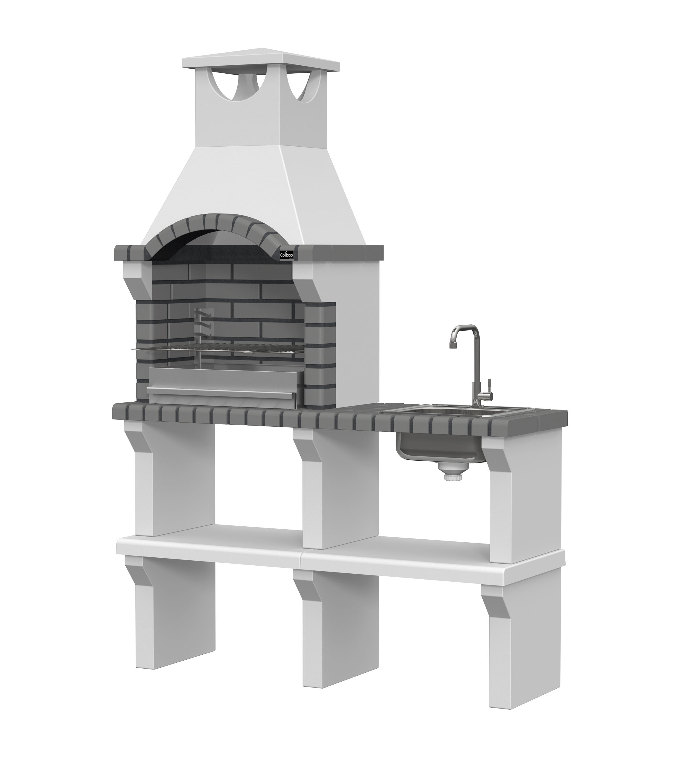 Peças em micro betão cinzento liso e micro betão cinzento texturado; zona de fogo em tijolo e cimento refractário
