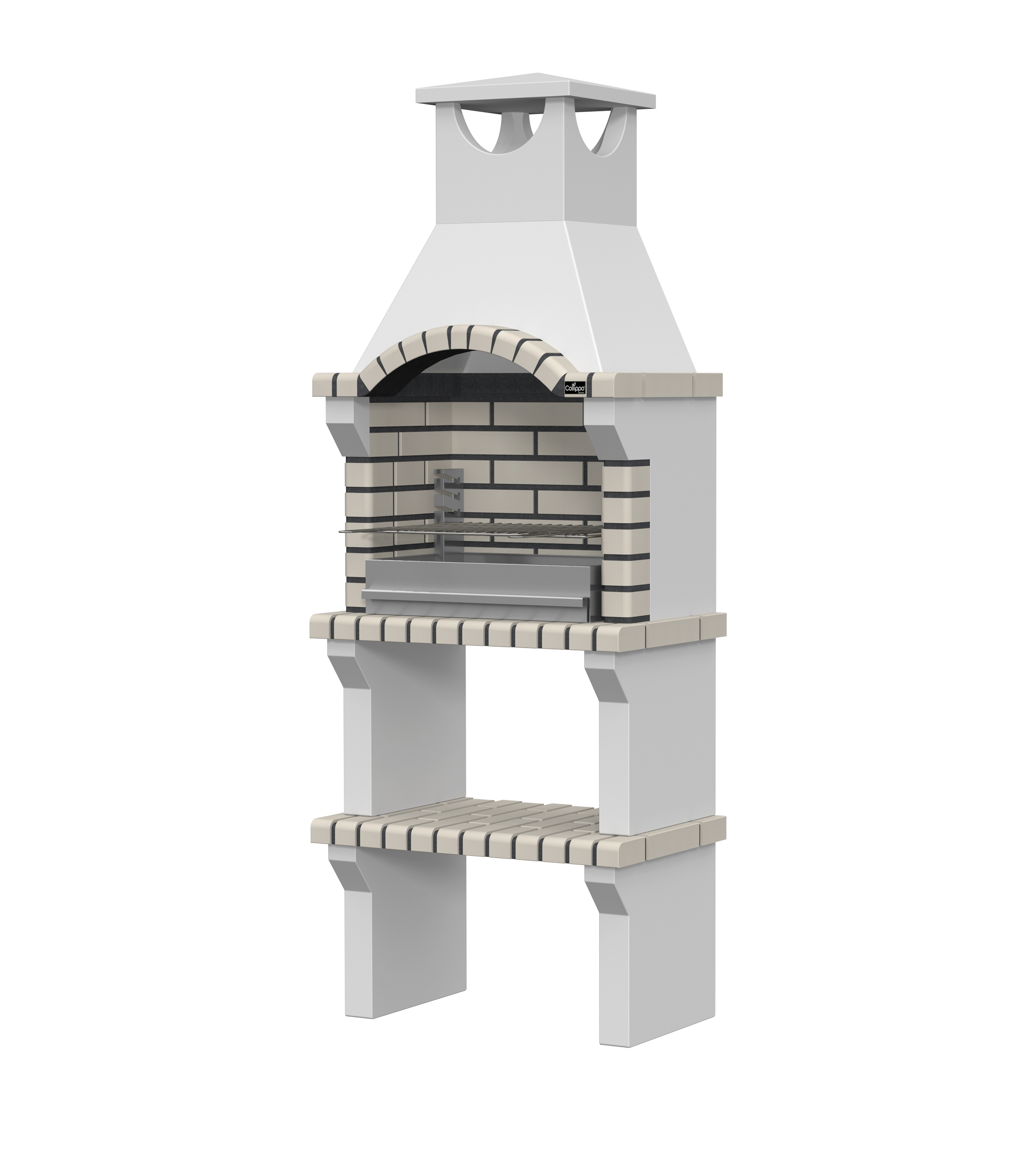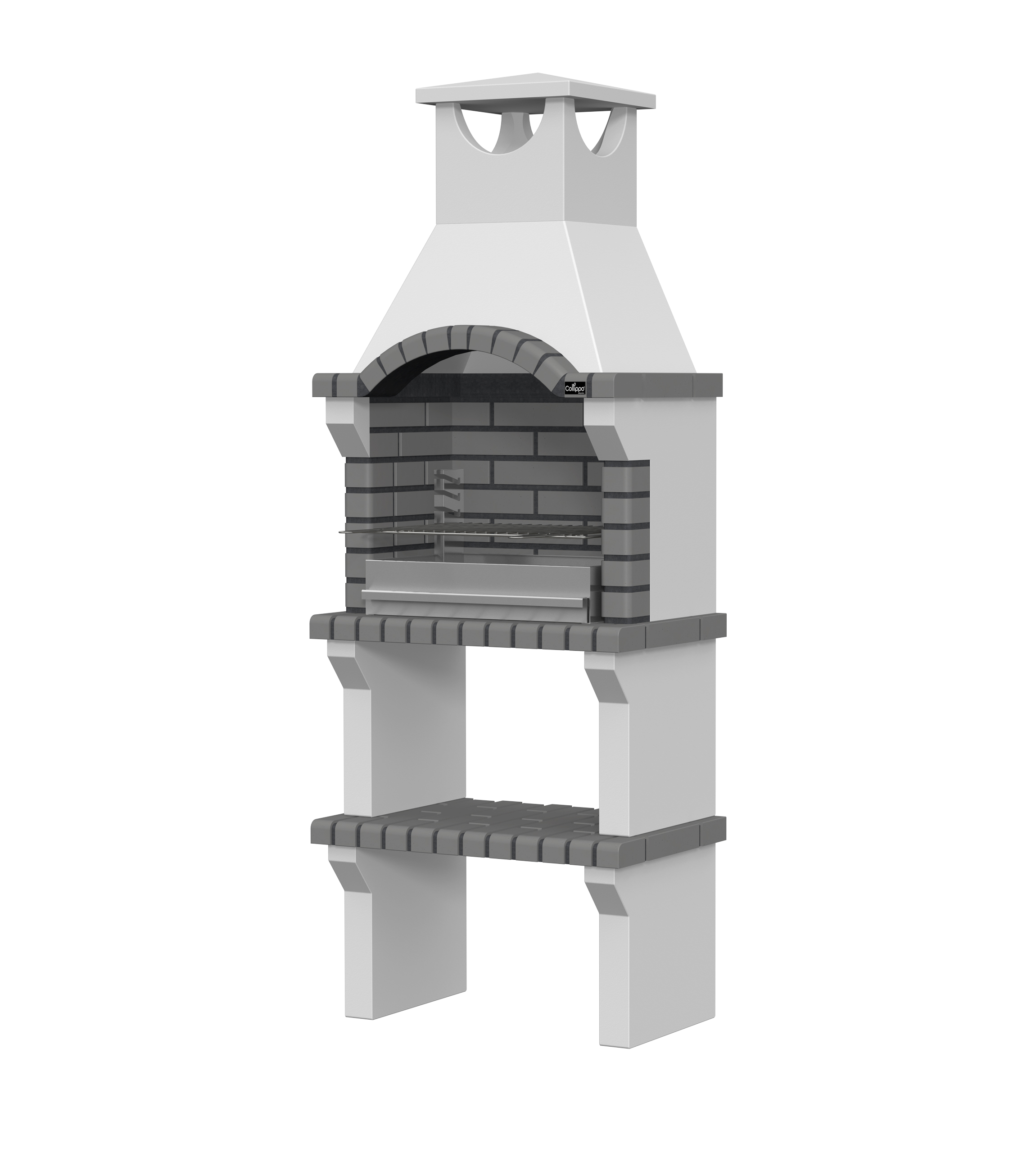 Peças em micro betão cinzento liso e micro betão cinzento texturado; zona de fogo em tijolo e cimento refractário