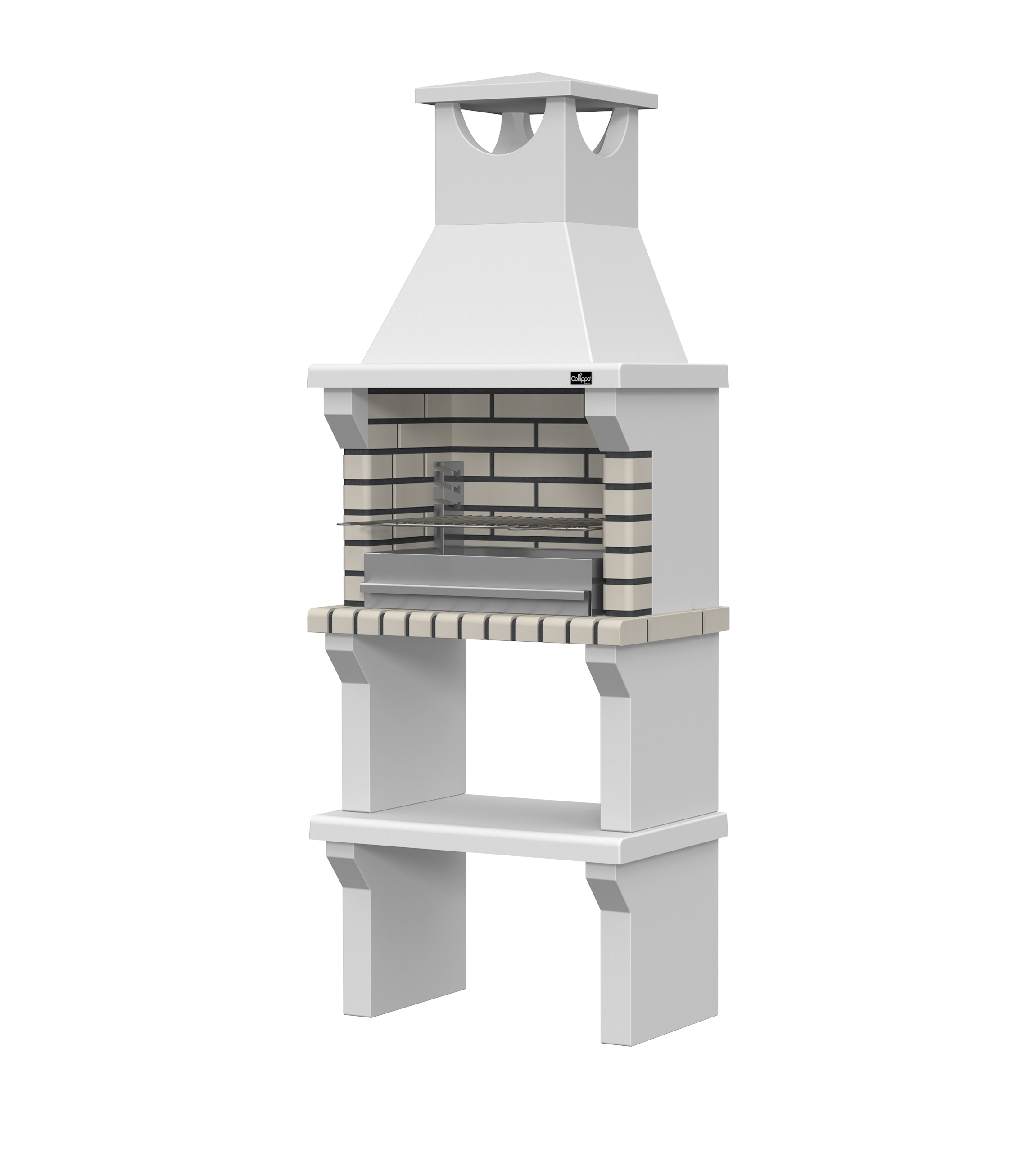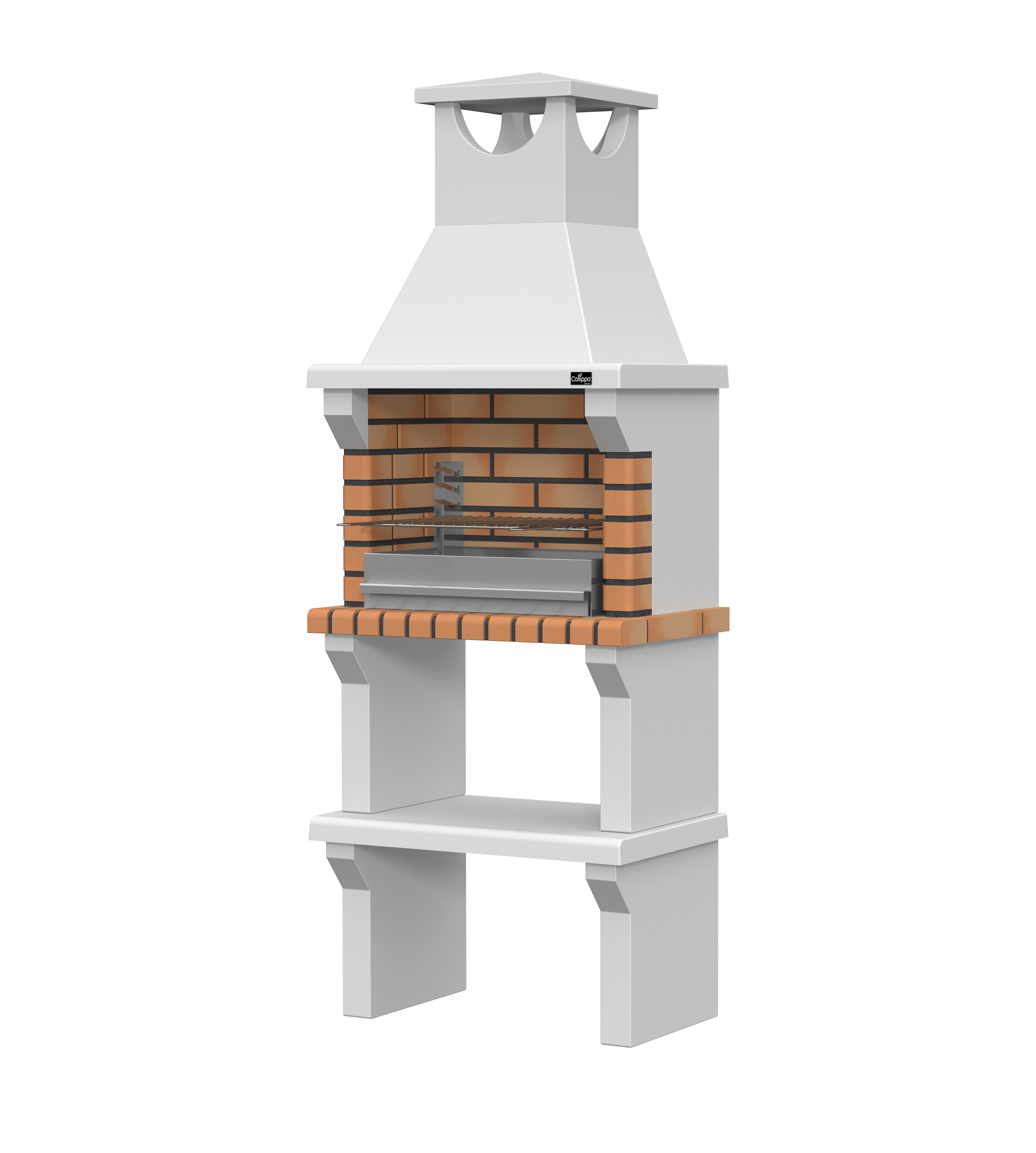Peças em micro betão cinzento liso e micro betão cinzento texturado; zona de fogo em tijolo e cimento refractário