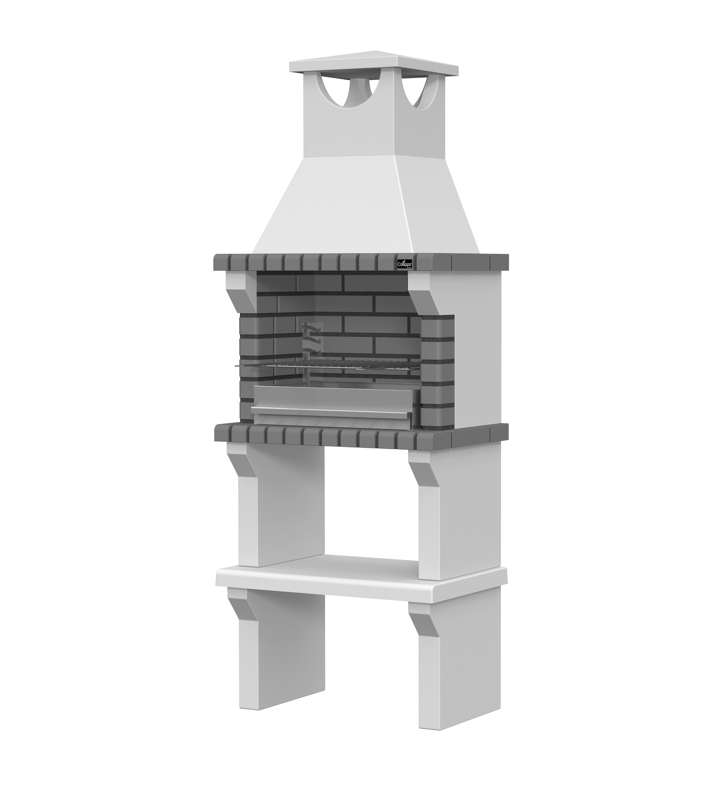 Peças em micro betão cinzento liso e micro betão cinzento texturado; zona de fogo em tijolo e cimento refractário.
